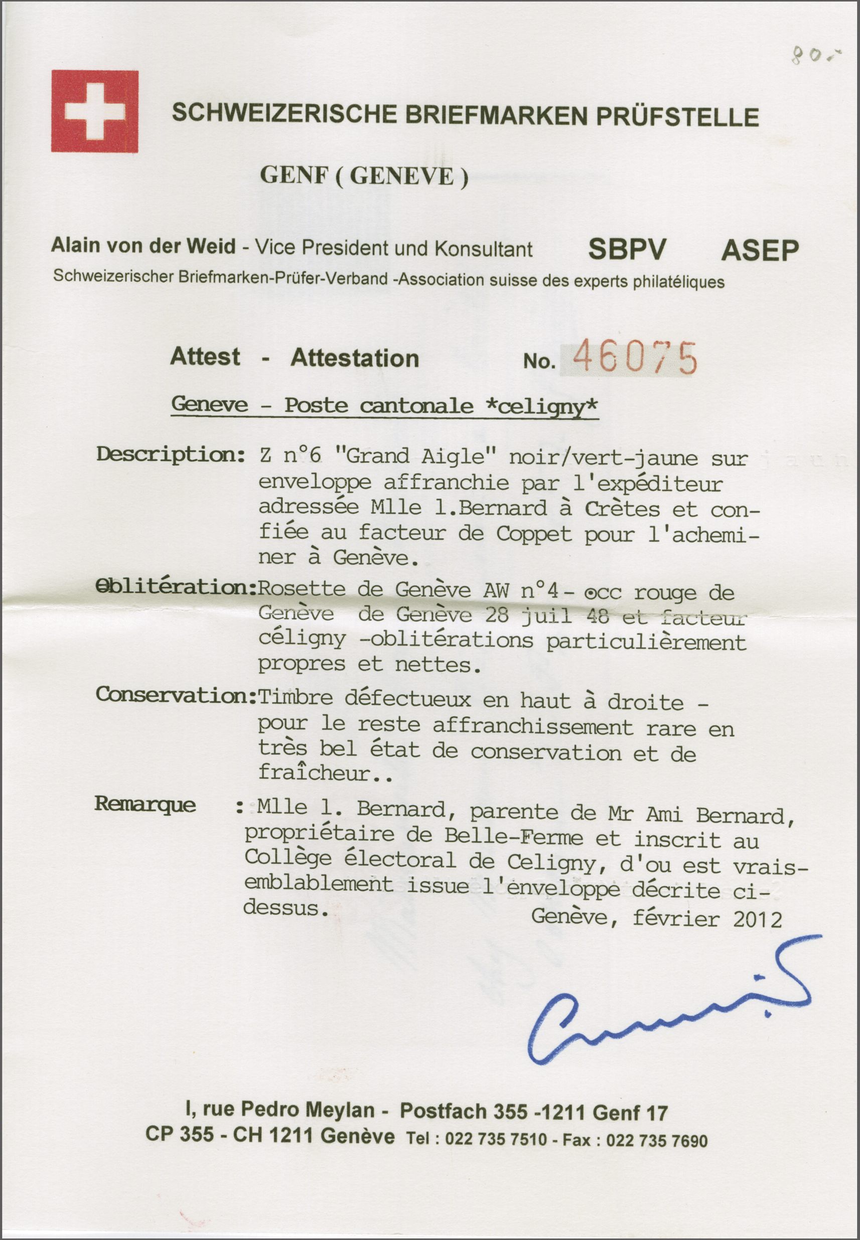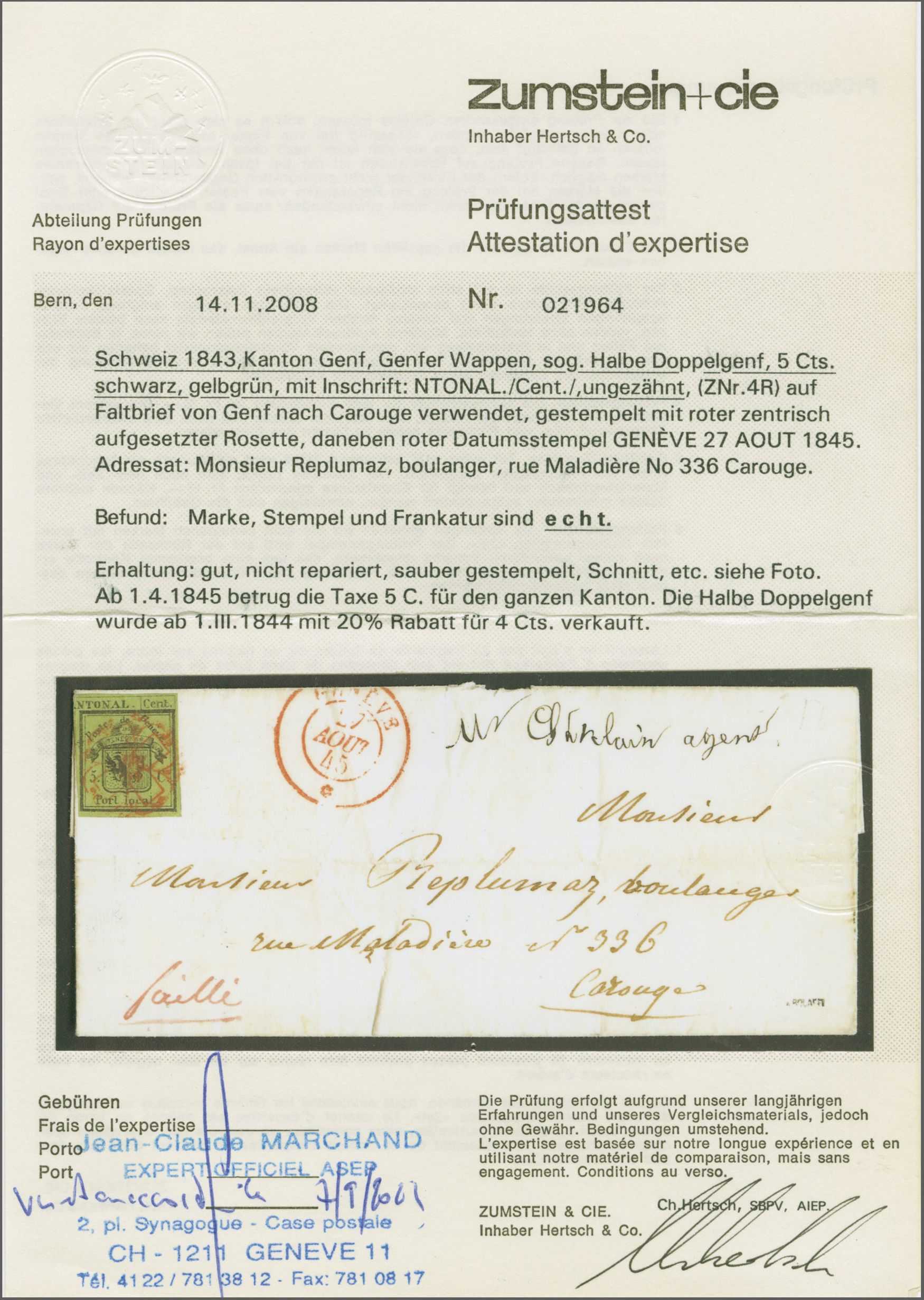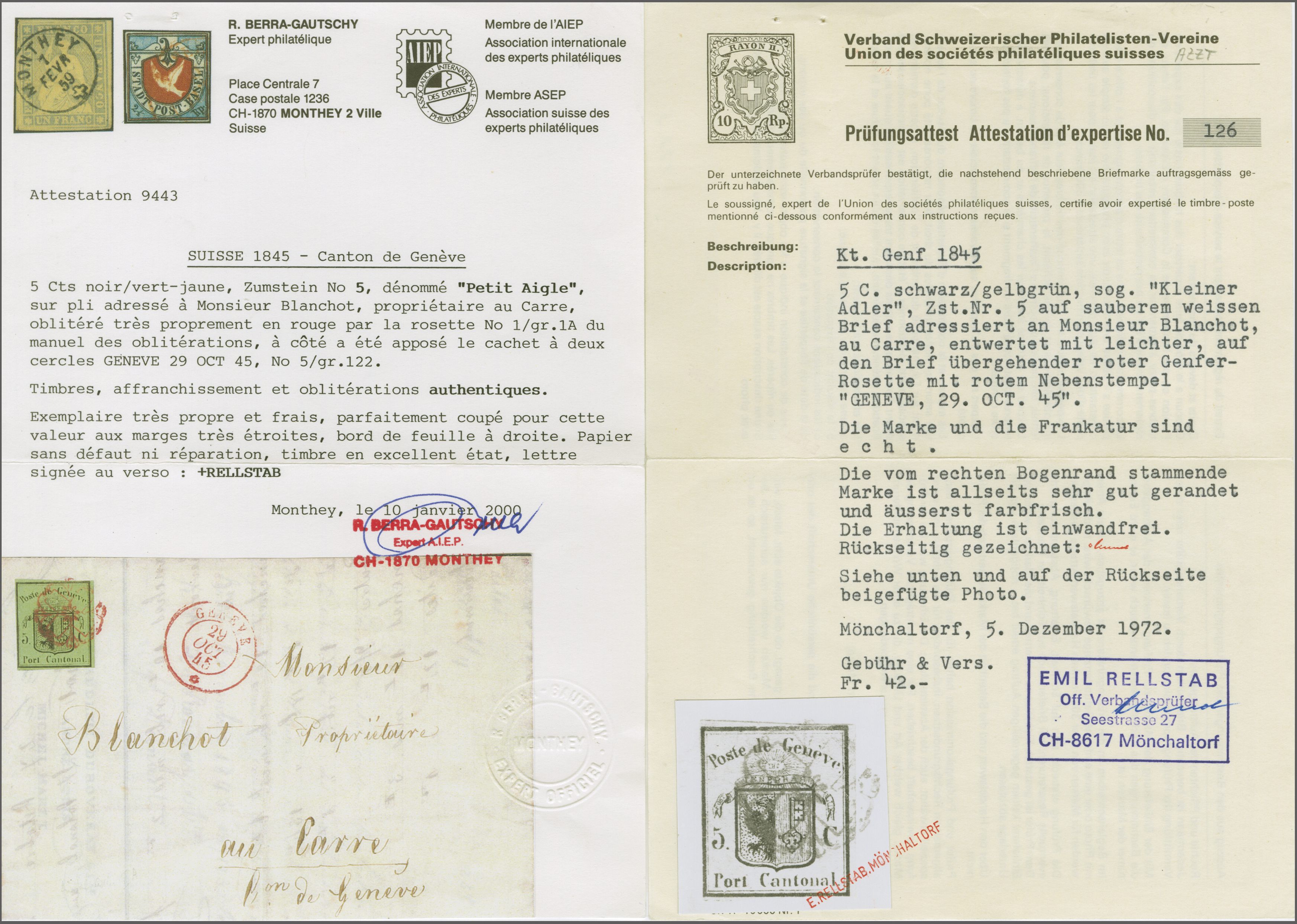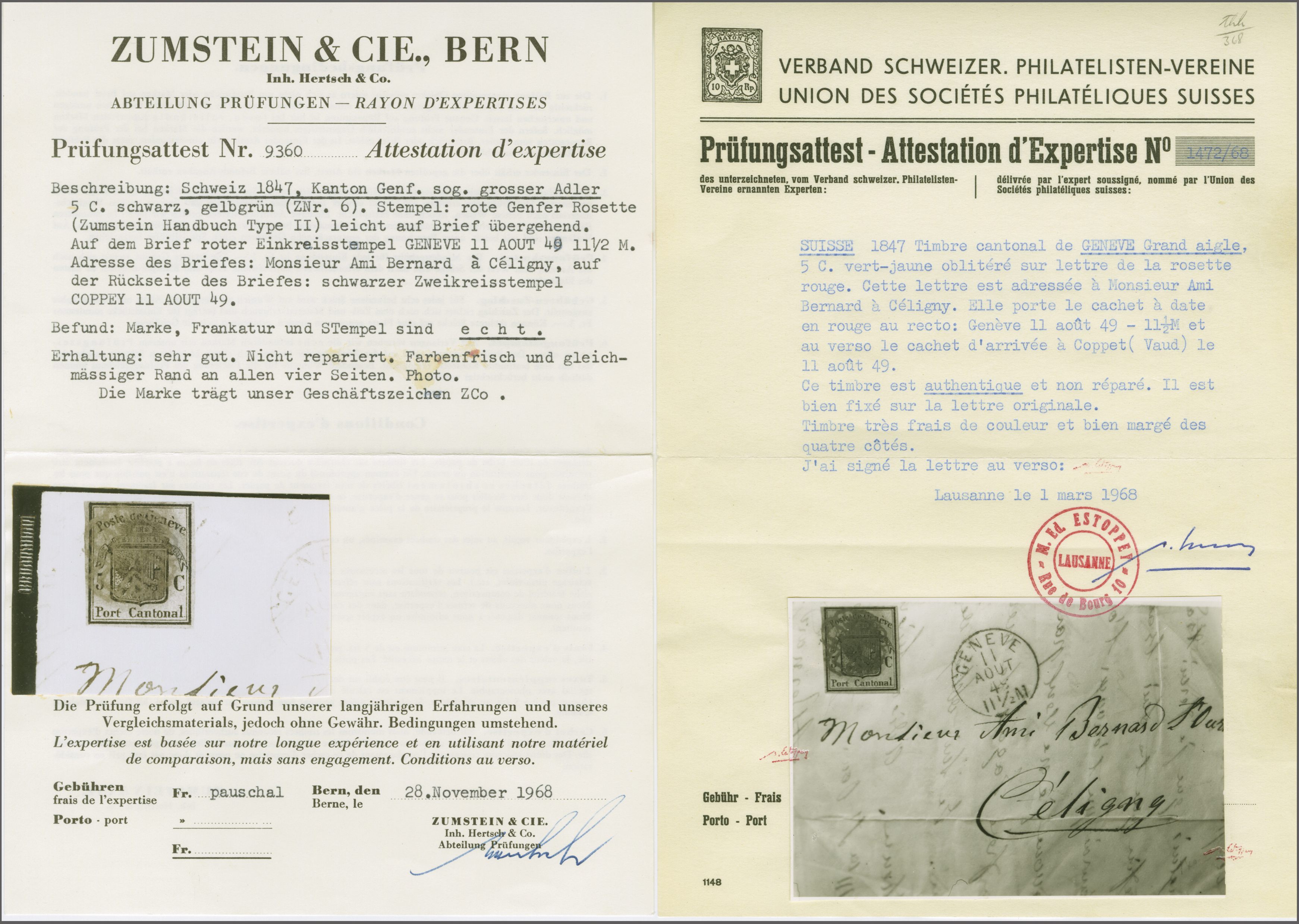 und Spezialkatalog=CHF 40'900x3. Anmerkung: Die Corinphila-Karteiregistratur kennt sieben Briefe mit dem Grossen Adler aus der Genfer Exklave Céligny. Referenz: Abgebildet und diskutiert in: "Schweiz Kantonalmarken 1843-1854 - Corinphila Handbuch und