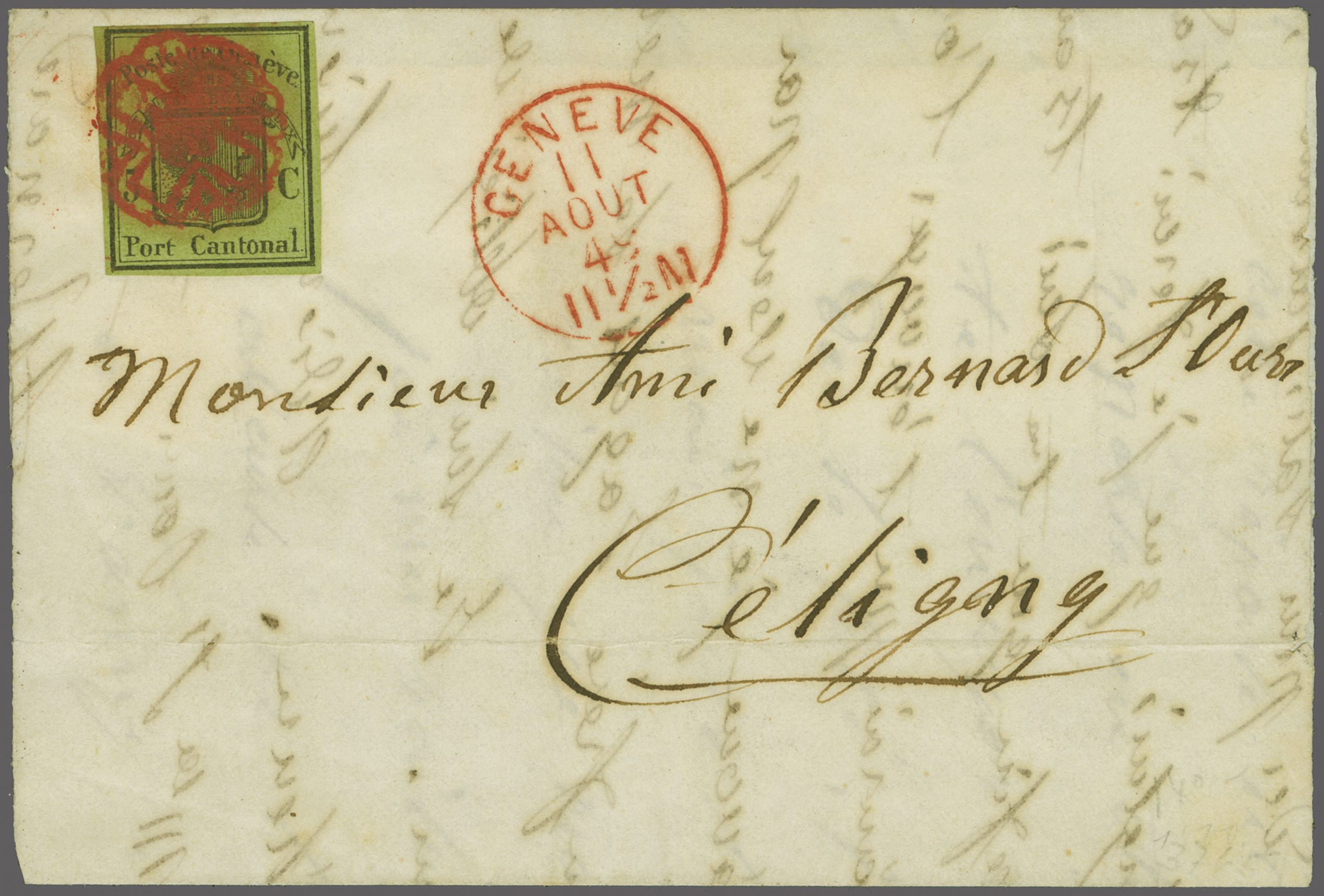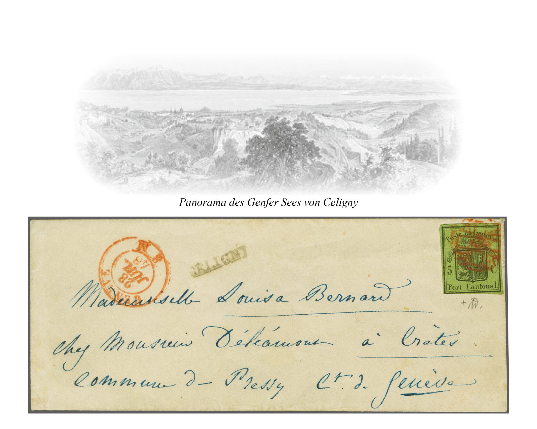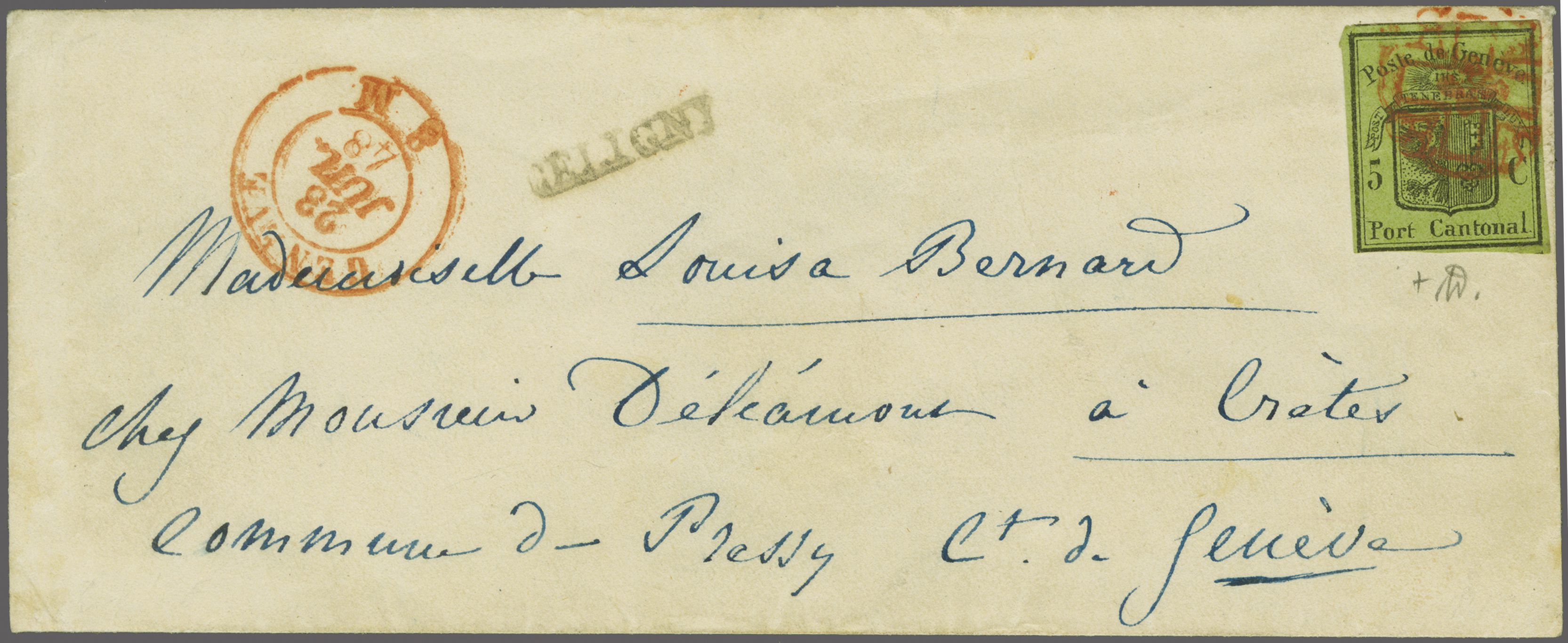 derselben Farbe und seltenem Stabstempel "CELIGNY" in schwarz auf Damenbrief an Mademoiselle Louisa Bernard in Crête bei Pressy in der Gemeinde Vandoeuvres. Ein seltener Brief aus der Exklave Celigny; Attest von der Weid (2012). Corinphila Handbuch