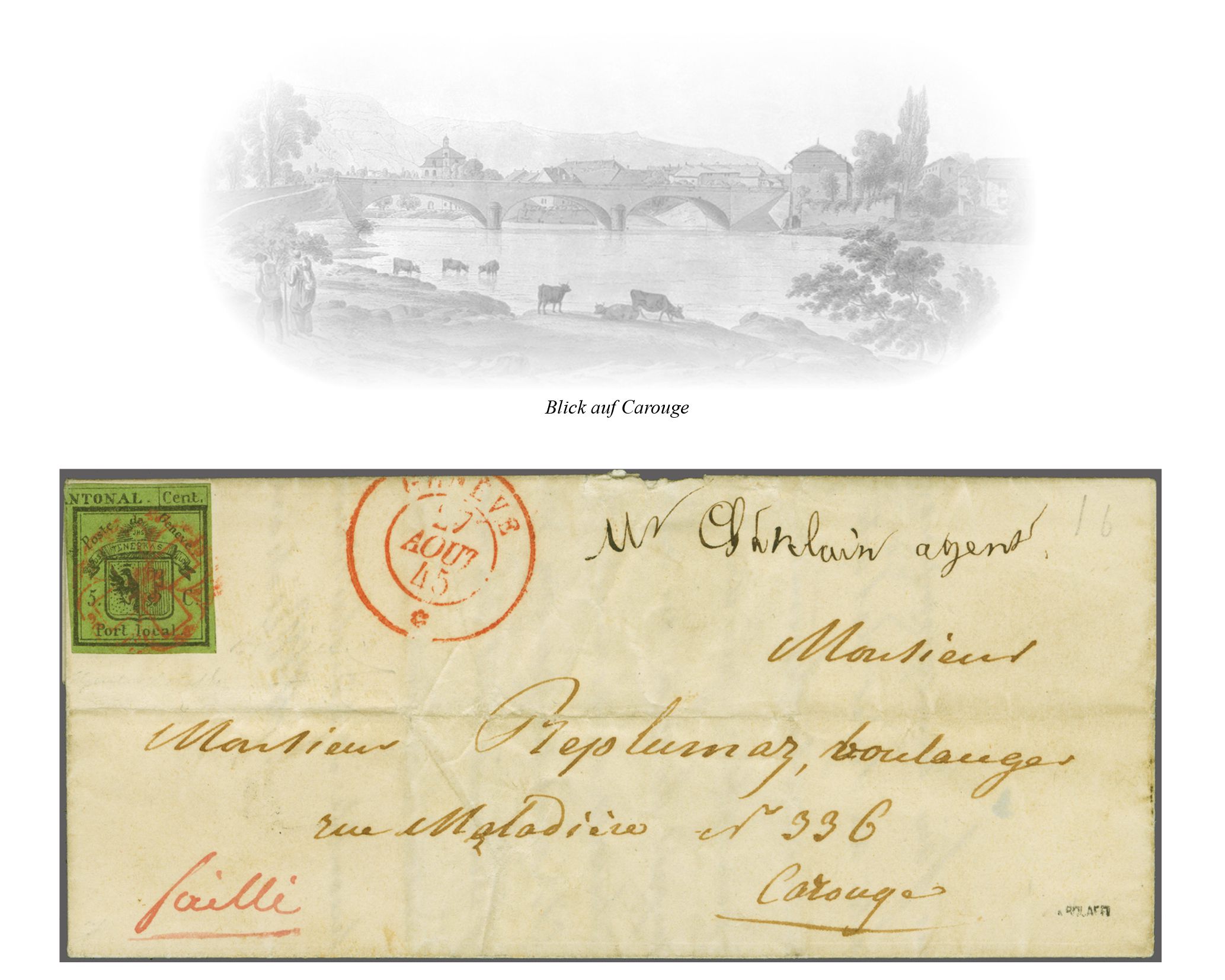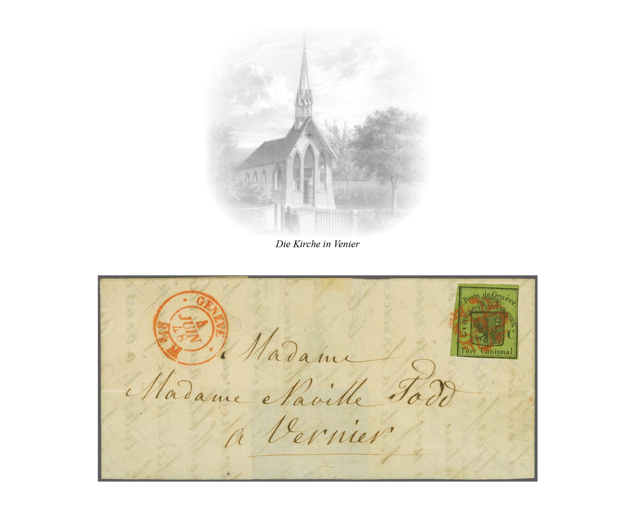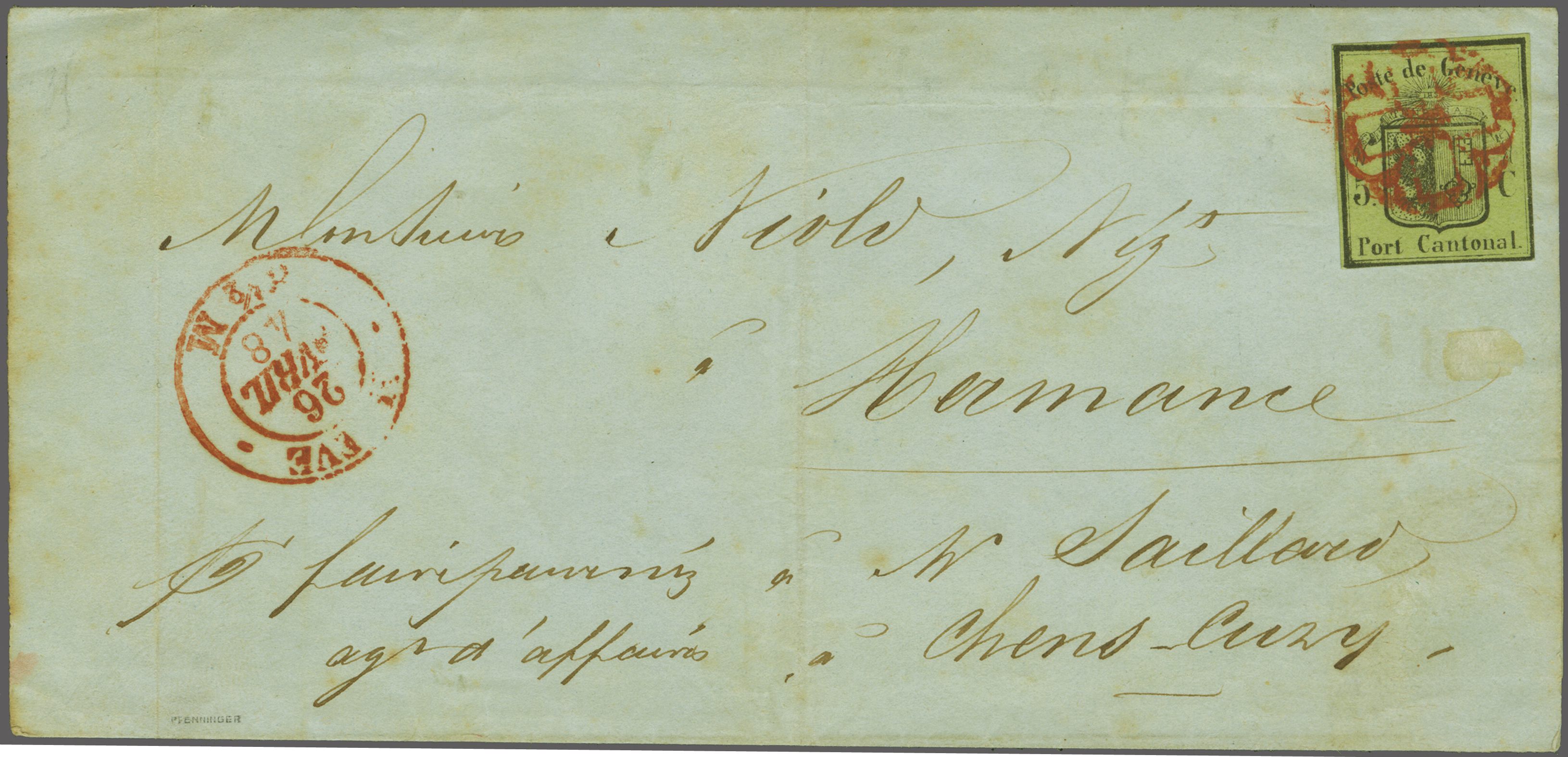 derselben Farbe und seltenem Stabstempel "CELIGNY" in schwarz auf Damenbrief an Mademoiselle Louisa Bernard in Crête bei Pressy in der Gemeinde Vandoeuvres. Ein seltener Brief aus der Exklave Celigny; Attest von der Weid (2012). Corinphila Handbuch
