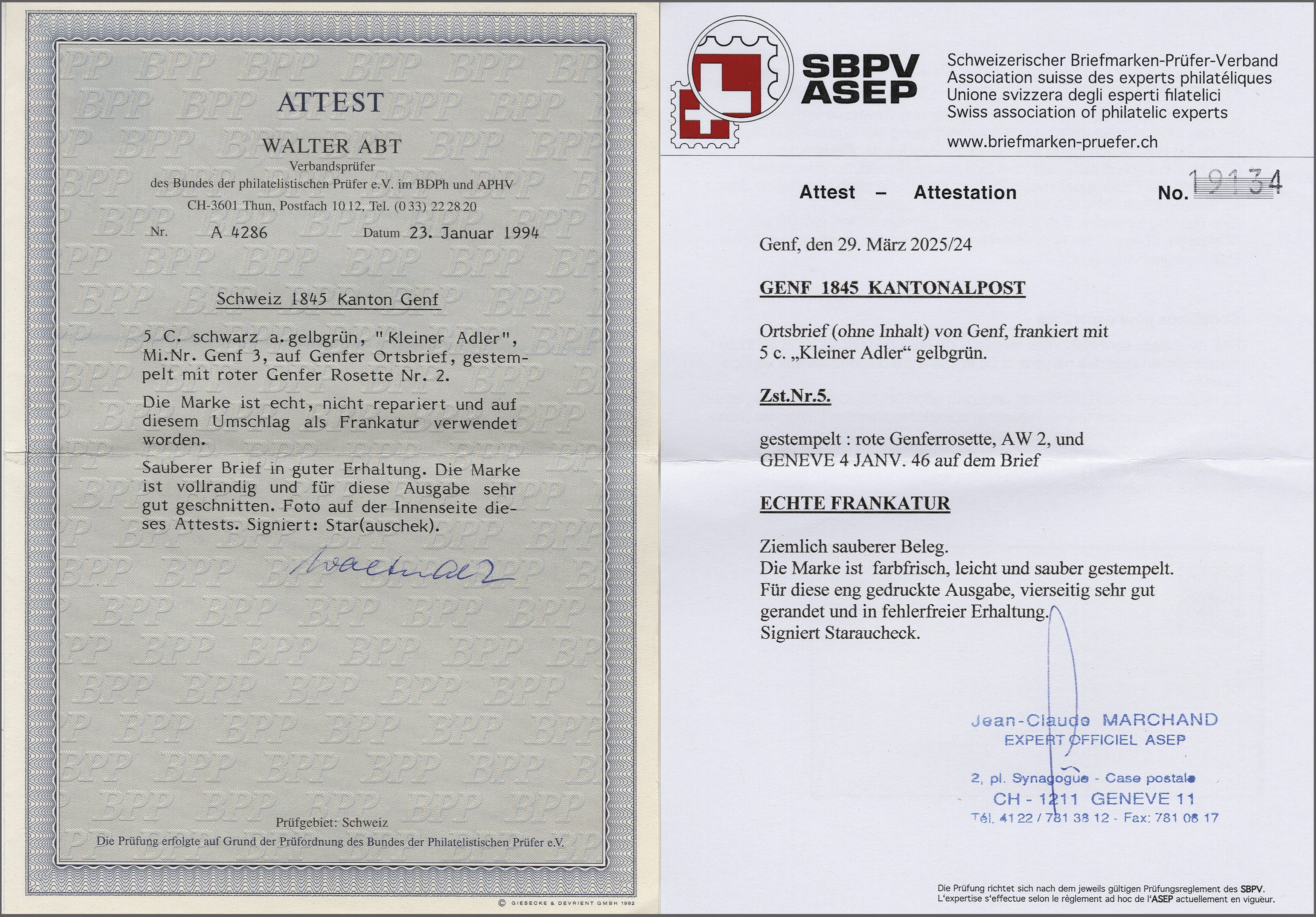Kl. Adler, farbfr. und voll- bis zumeist grünrandig mit seltenem breitem Bogenrand unten, klar, zentrisch und voll aufgesetzt entw. mit roter Genfer Rosette (AW 2) mit nebenges. kl. Zweikreisstp. "GENÈVE 18 AVRIL 45" auf