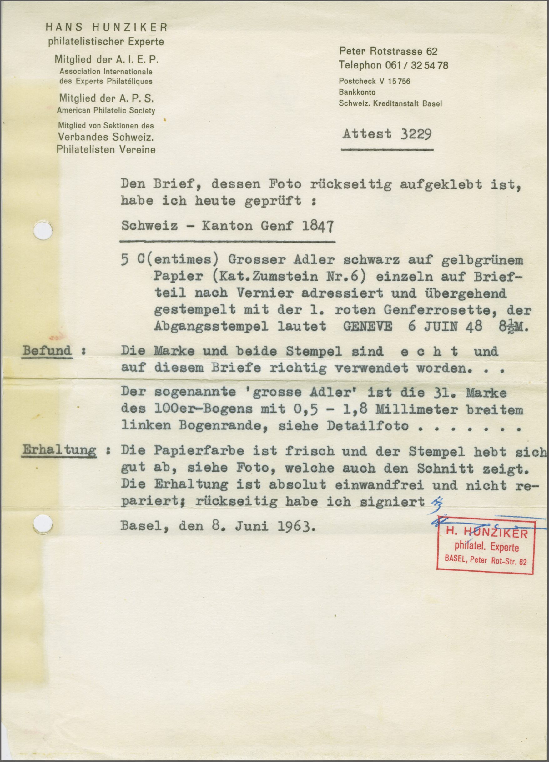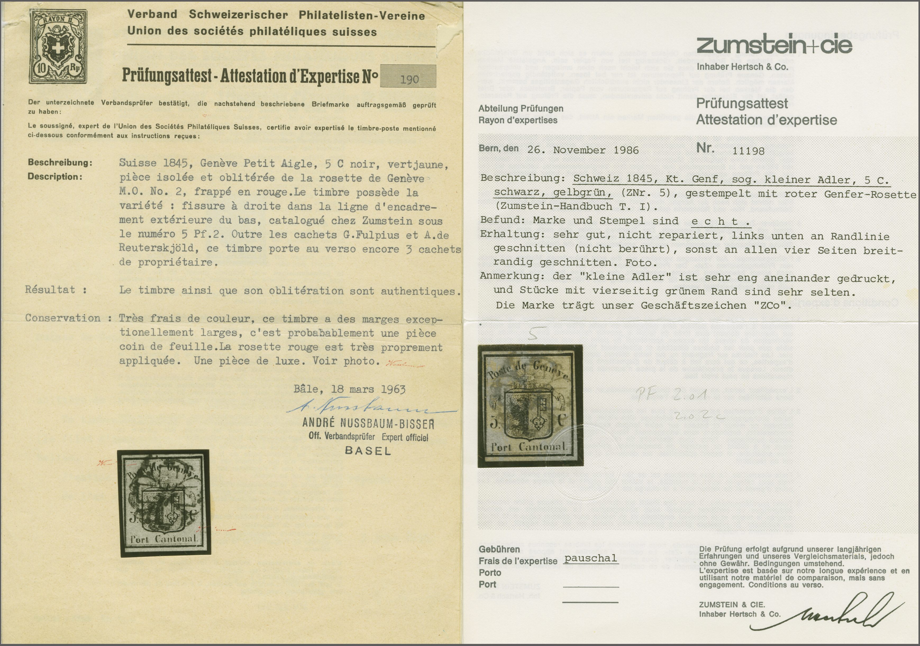 unteren Bogenecke (links unten ganz kurz an die Randlinie geschnitten), klar und voll aufgesetzt entw. mit roter Genfer Rosette (AW 2). Eine interessante Marke mit ausladend breiten Rändern; signiert Reuterskiöld, Atteste Fulpius (1953), Nussbaum