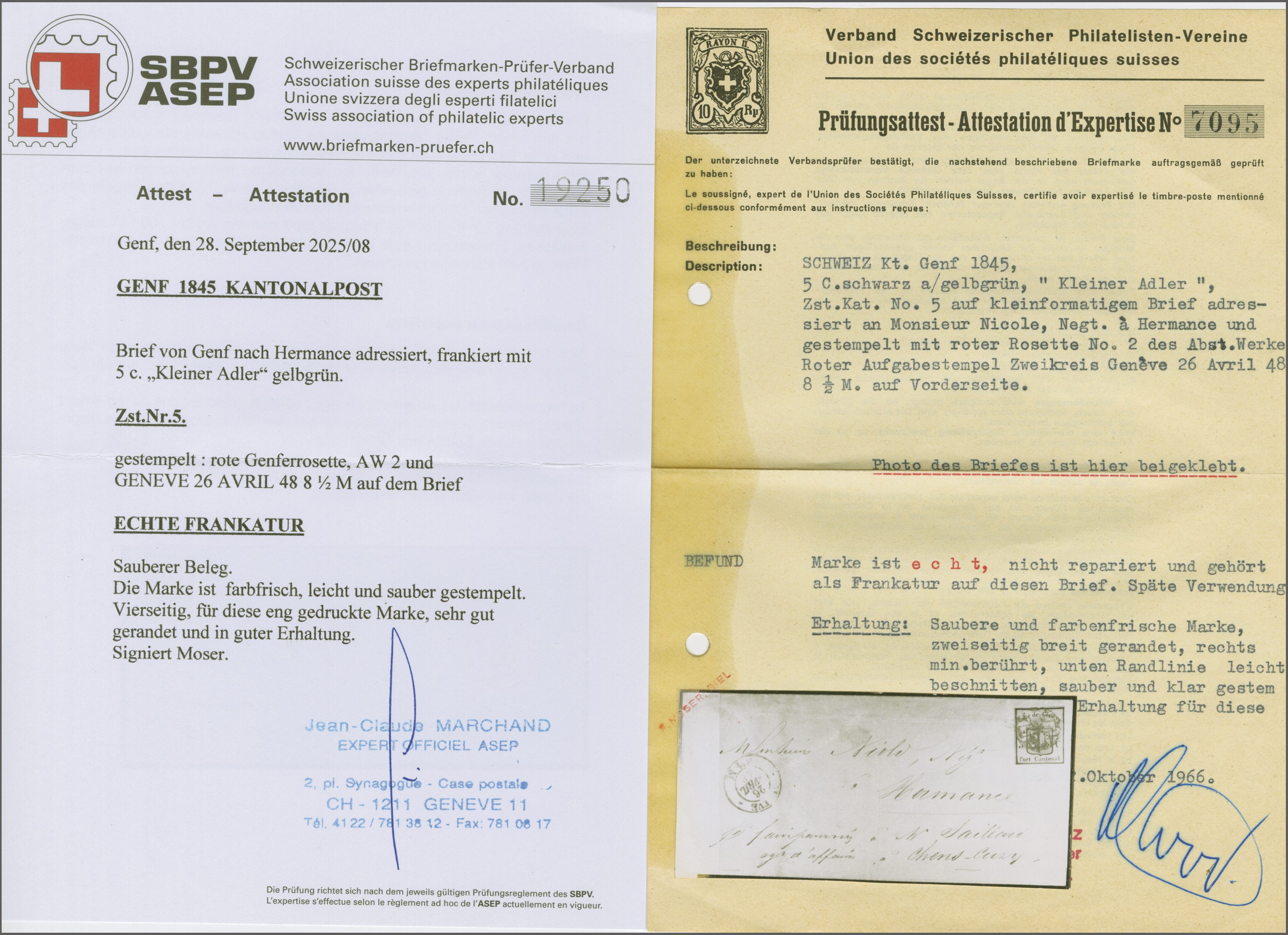 selben Farbe auf Faltbriefhülle nach Hermance (Briefbüge abseits der Frankatur). Eine interessante Spätverwendung des kleinen Adlers, signiert Pfenninger, Attest Mosere (1966) und Marchand (2025). SBK=CHF 4'800. Provenienz: Sammlung Maurice Burrus,