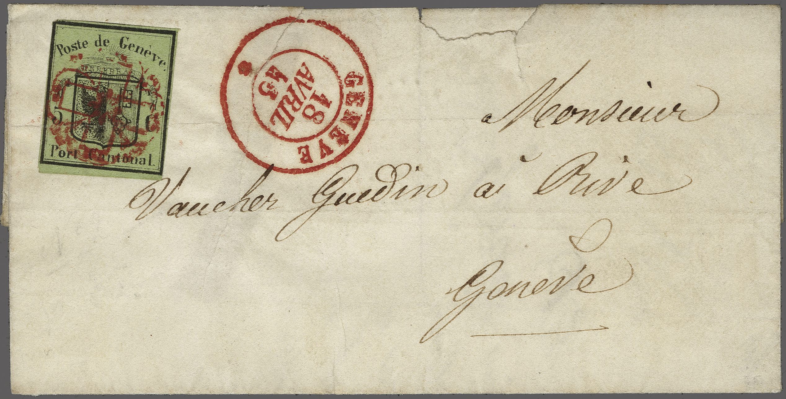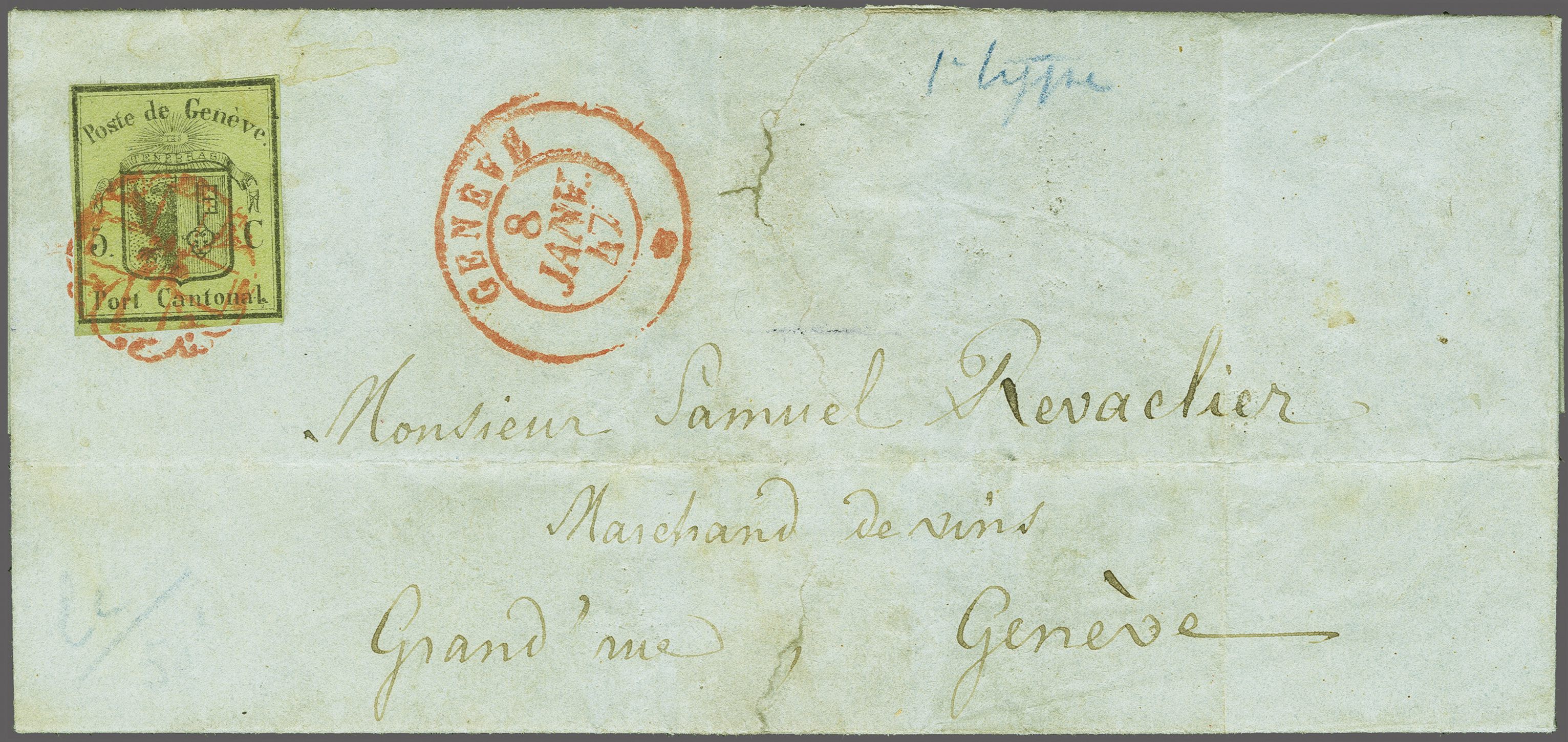 frischer, kleinformatiger Faltbriefhülle (oben zwei Einrisse, wovon einer durch Datumstp., Registraturbug durch die Marke) adressiert an "Monsieur Vaucher-Guedin, Rive" in der Stadt. Befund Marchand (2025). SBK=CHF 4'800 (Image 1)