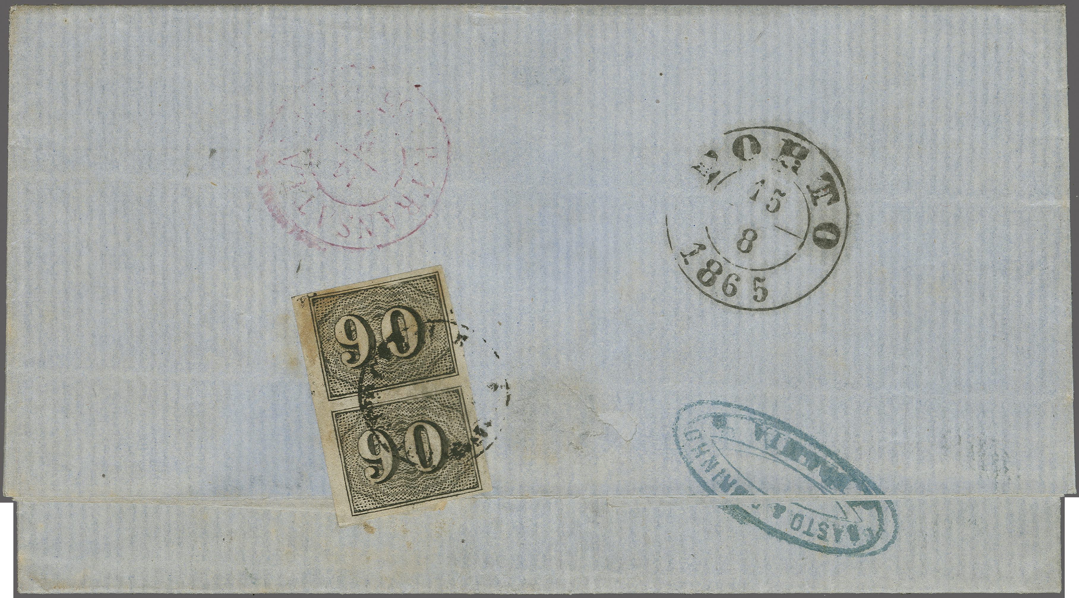 Verticais 1850: 90 r. black on greyish thin paper, a vertical pair used on reverse of 24 July 1865 entire letter from Rio de Janeiro to Porto, Portugal endorsed "per Estramadure", carried outside the mails initially and put