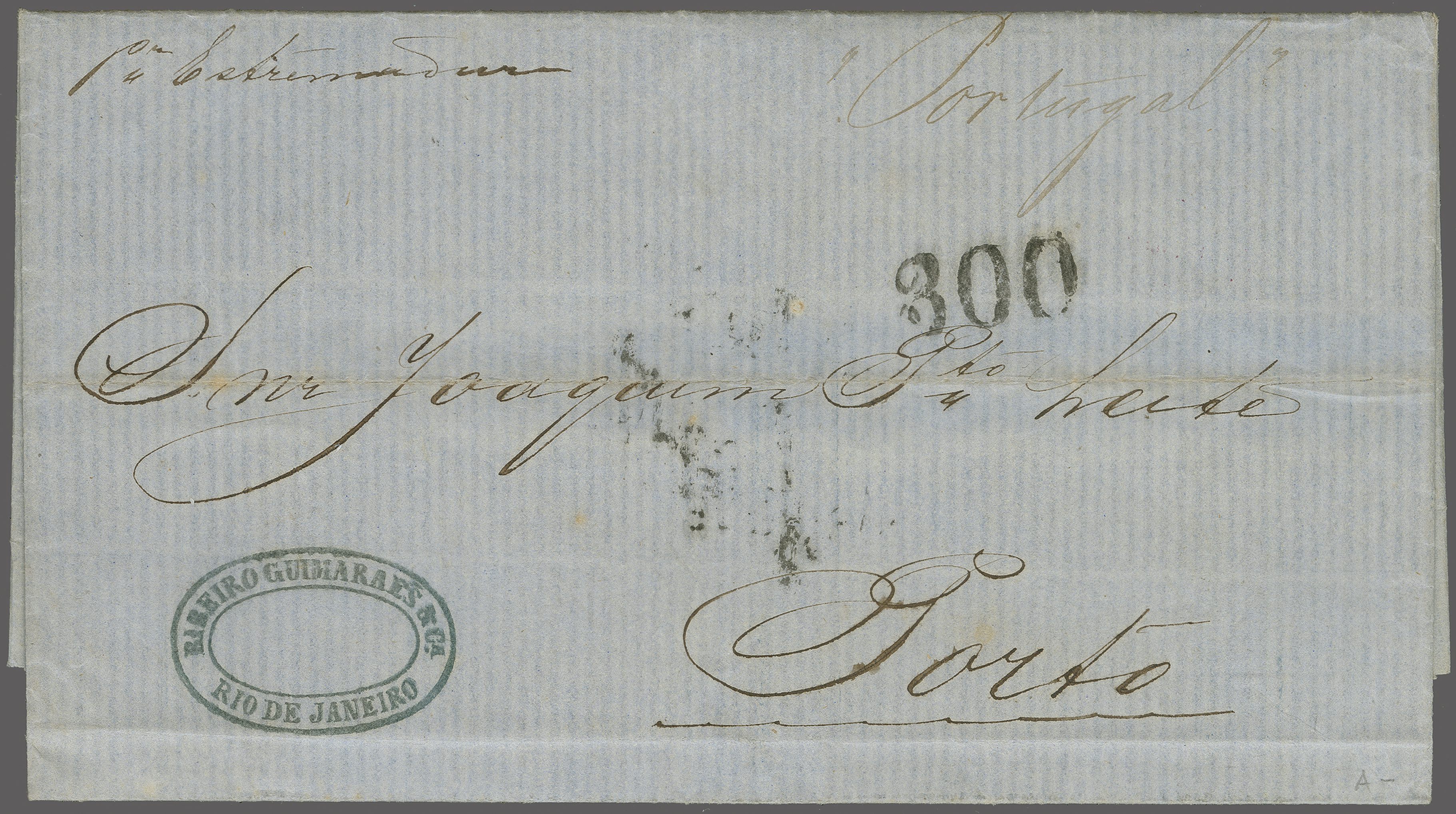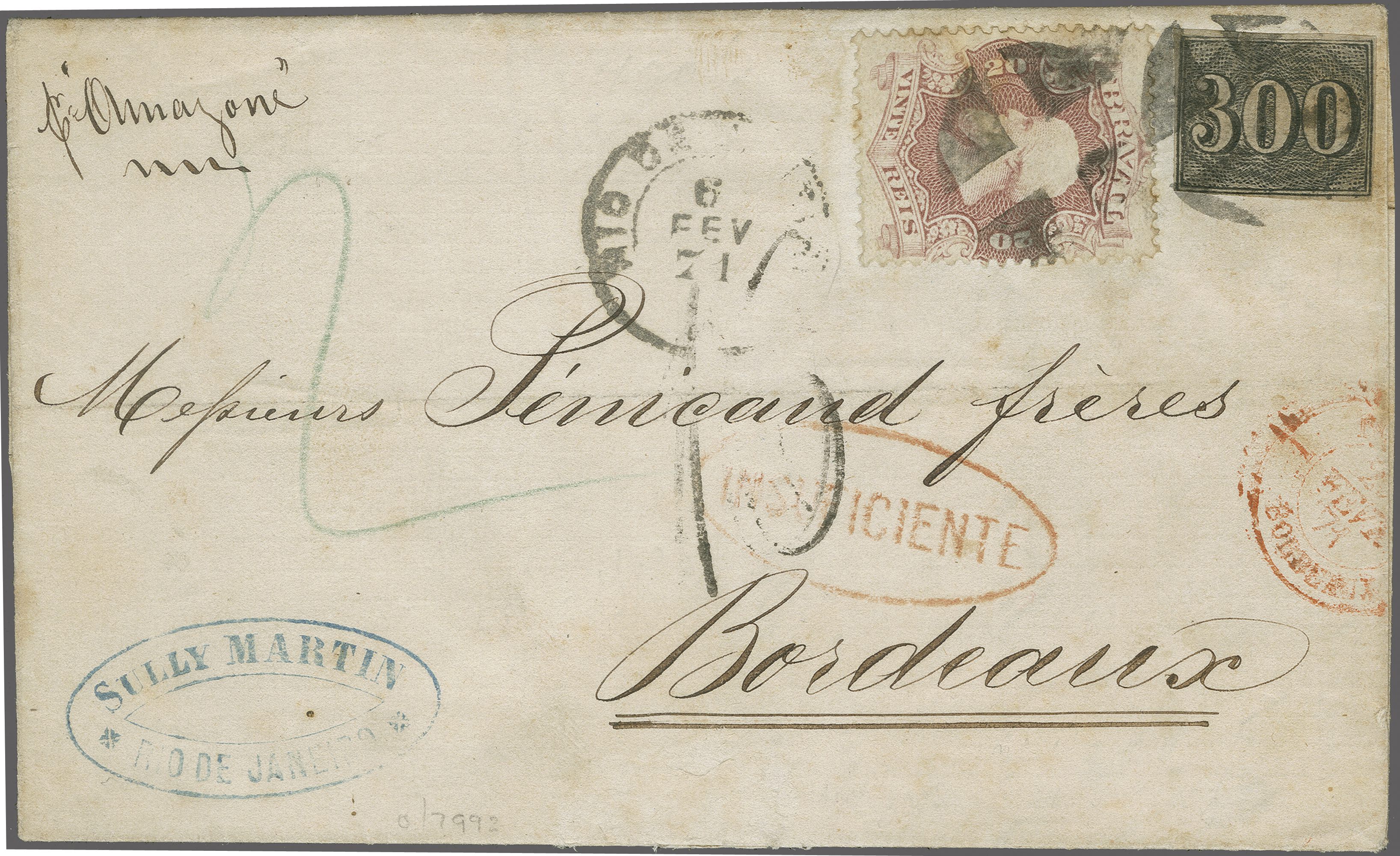 Verticais 1850: 300 r. black on greyish thin paper, used in combination with 1866 Dom Pedro 20 r. red-lilac, on underpaid 1871 entire letter from Rio de Janeiro to Bordeaux endorsed "per Amazone"; the 300r. with close margins