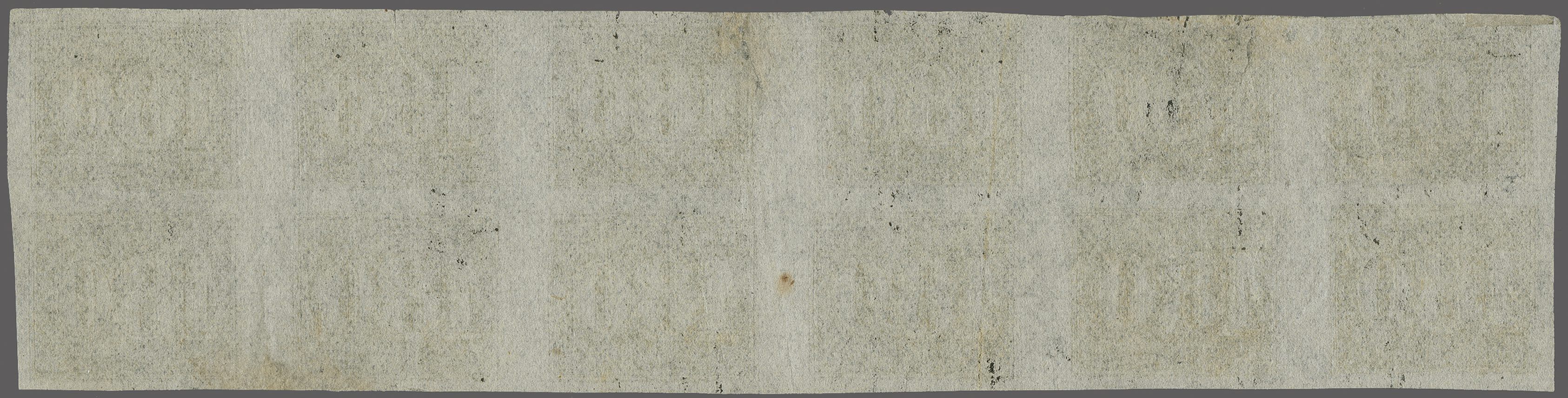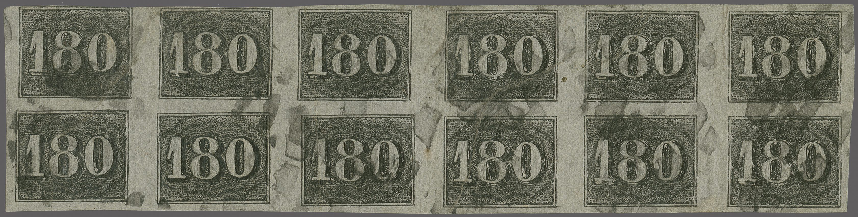 Verticais 1850: 180 r. black on greyish thin paper, a used block of twelve (6 x 2) marginal at right, margins minutely shaved at top otherwise good to large all round, cancelled by segmented cork handstamps in black; two small
