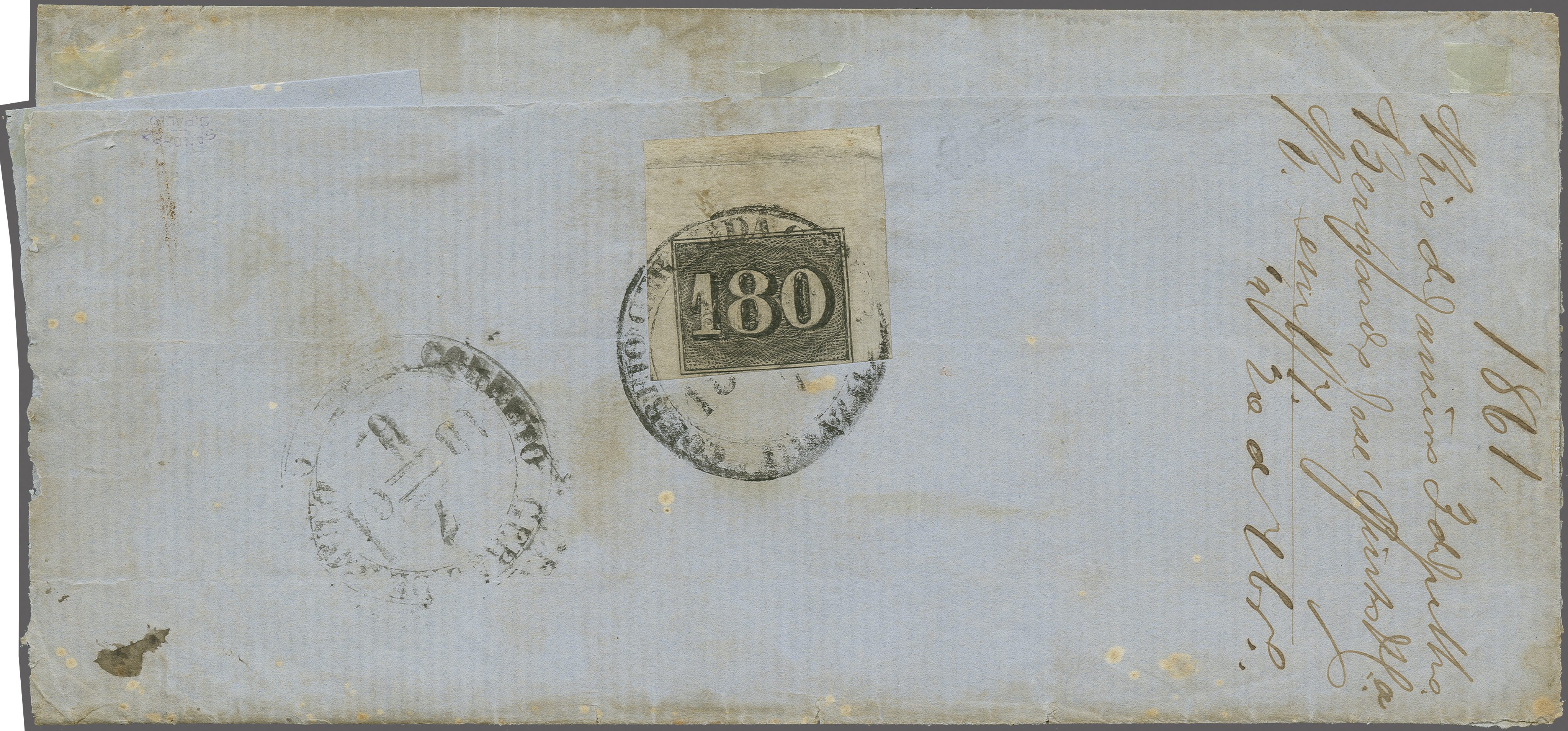 Verticais 1850: 180 r. black on greyish thin paper, a used example, marginal from top of sheet with three huge margins and just shaved at base, used on reverse of 1861 cover from Rio de Janeiro to Constituicão endorsed