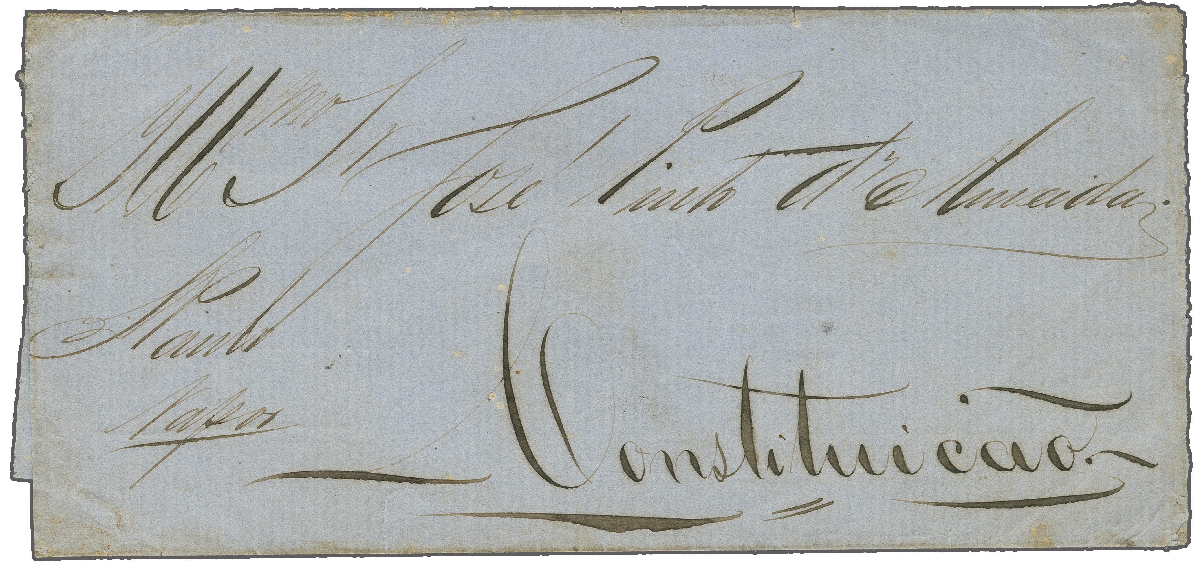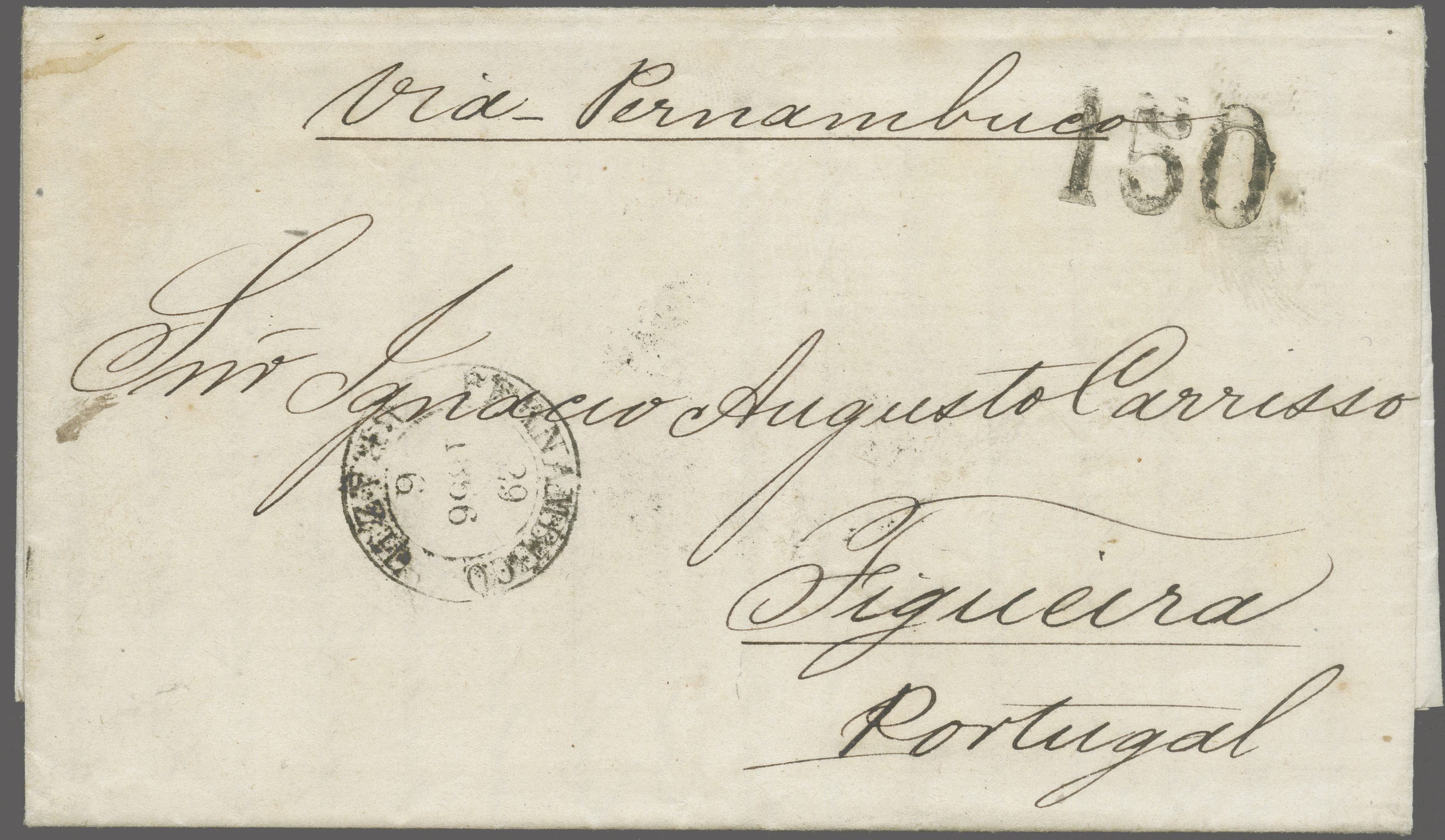 "Vapor", carried at single rate plus Maritime fee (60+120 reis), neatly tied by "Correio Geral da Corte / Brazil" cds (July 3) in black, thence via Santos and Sao Paulo with transit cds of the latter alongside (Aug 7). A fine example example of a