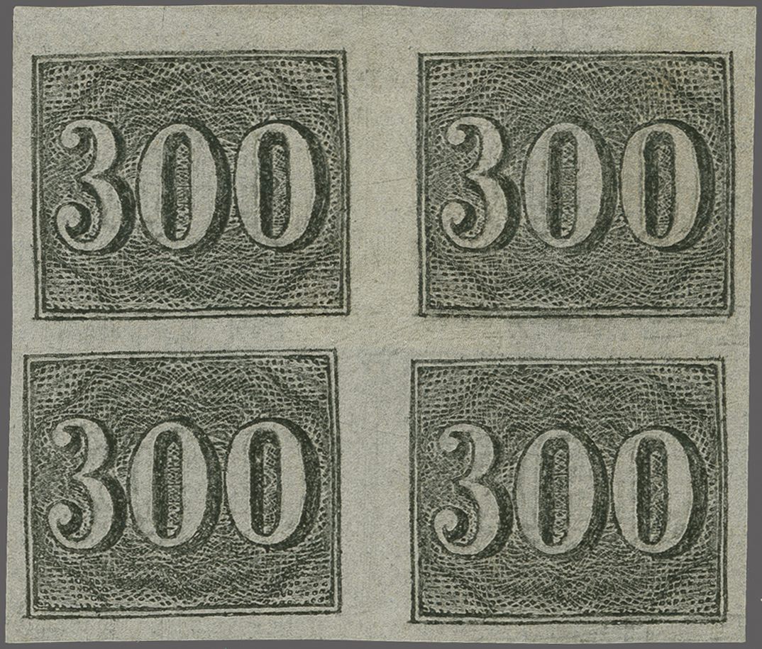Verticais 1850: 300 r. black on greyish thin paper, an unused block of four with large margins all round, of wonderful fresh appearance and without the usual faults, a very rare stamp in a multiple and extremely rare so fine,