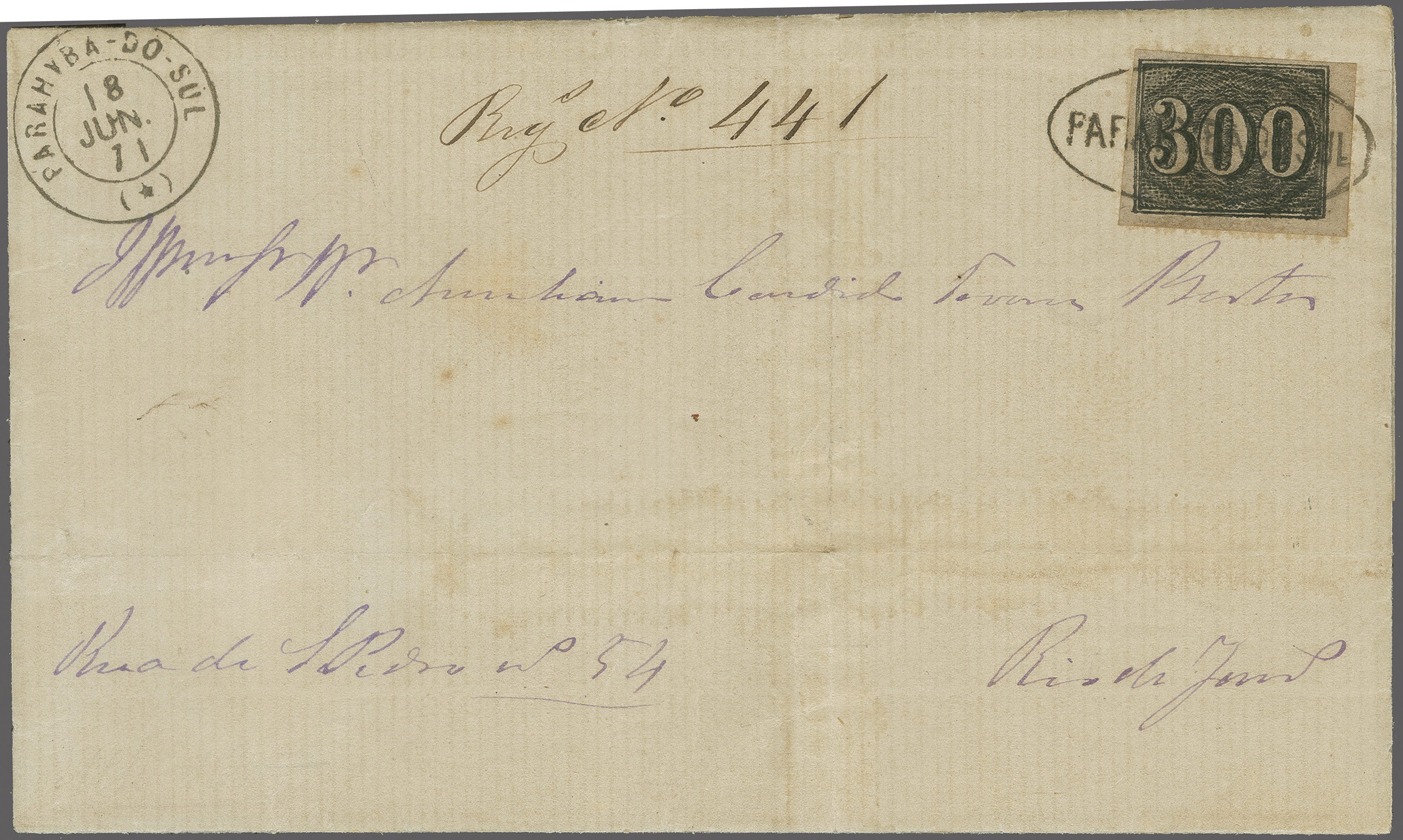 Verticais 1850: 300 r. black on greyish thin paper, a used example with good to large margins all round, on 1871 registered cover from Parahyba do Sul to Rio de Janeiro (100 reis postage + 200 r. for registration), tied by