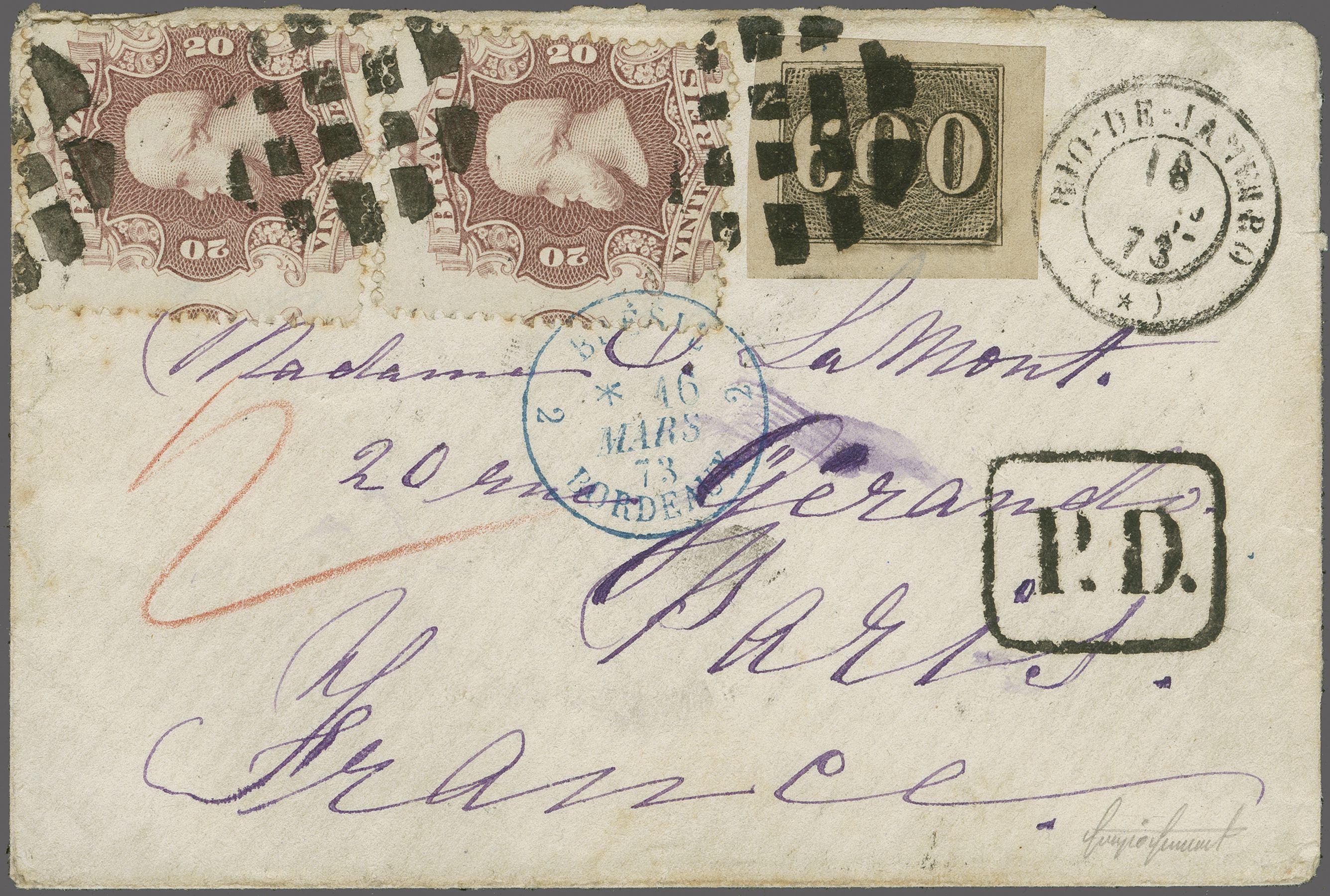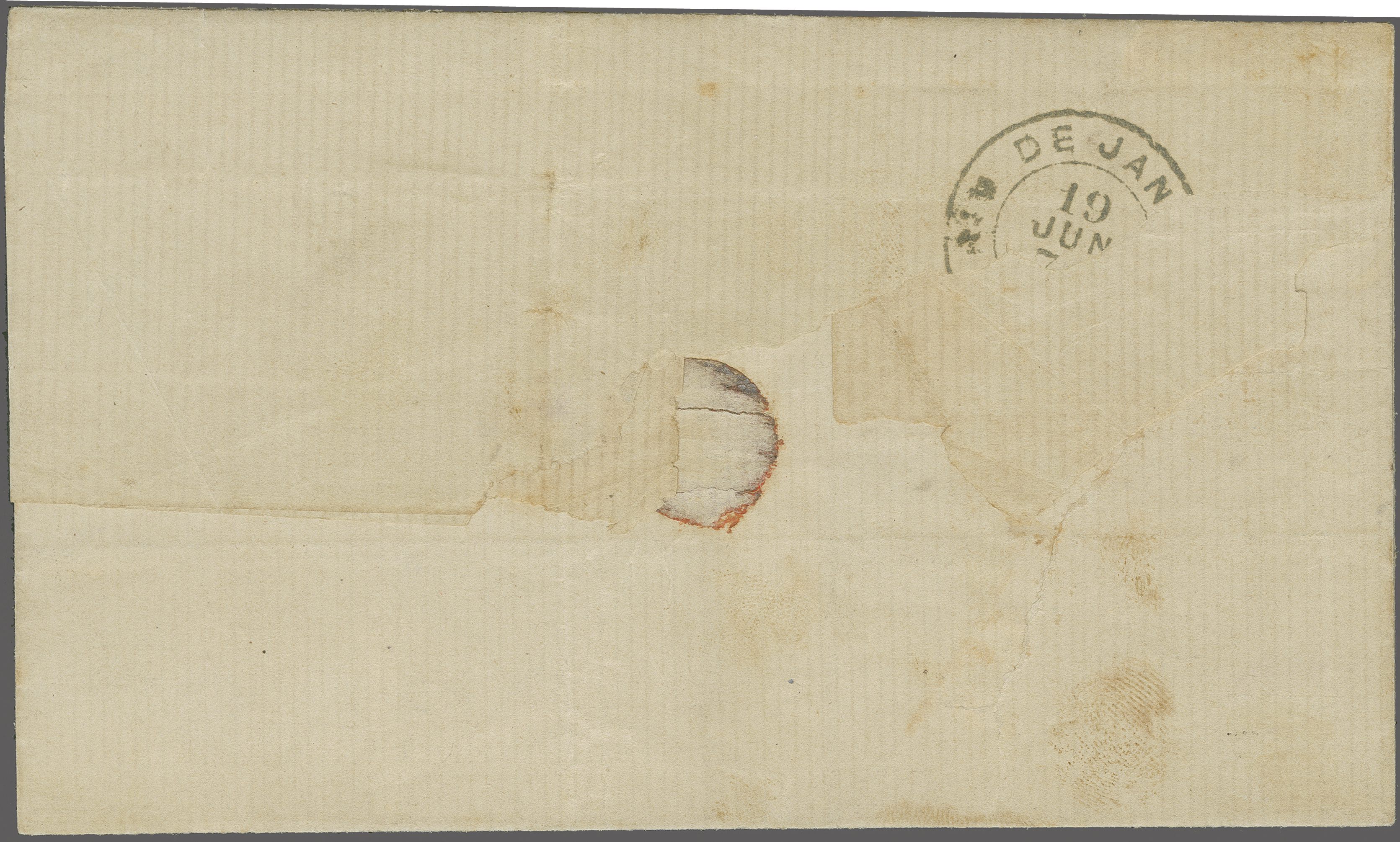 in brown and the 10 r. with part dotted handstamp in black (possibly re-used as postal fraud). Reverse with french type "Rio de Janeiro" arrival cds (June 14) struck in blue. Scarce. Cert. FEBRAF (2004) (Image 1)