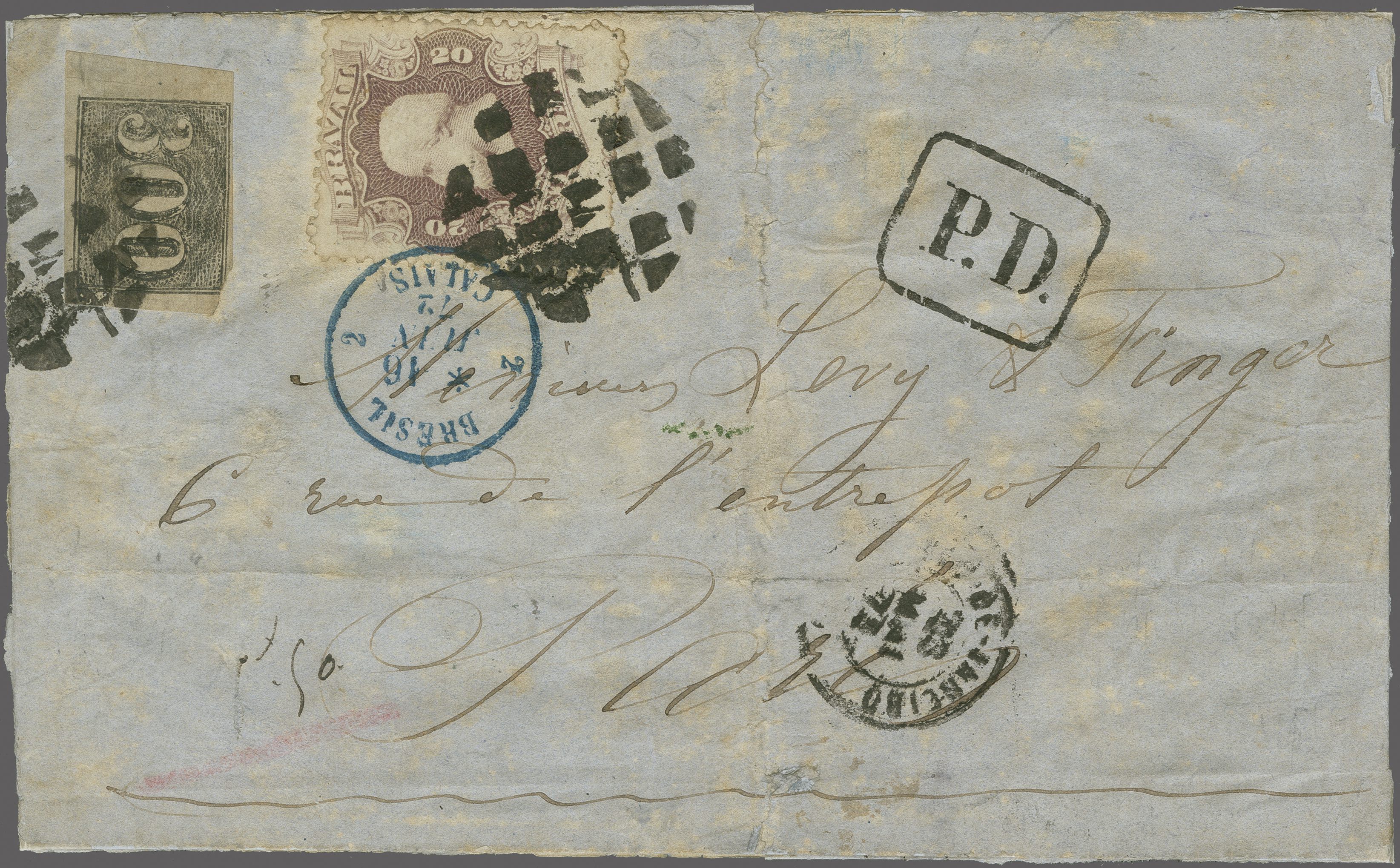Verticais 1850: 300 r. black on greyish thin paper, used in combination with 1866 Dom Pedro 20 r. red-lilac on 1872 cover to Paris, France at single rate, tied by segmented cork handstamps in black. Black framed "P.D." at