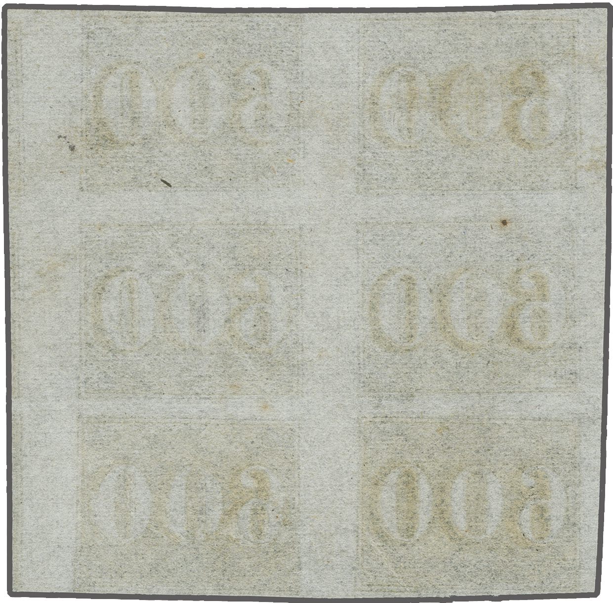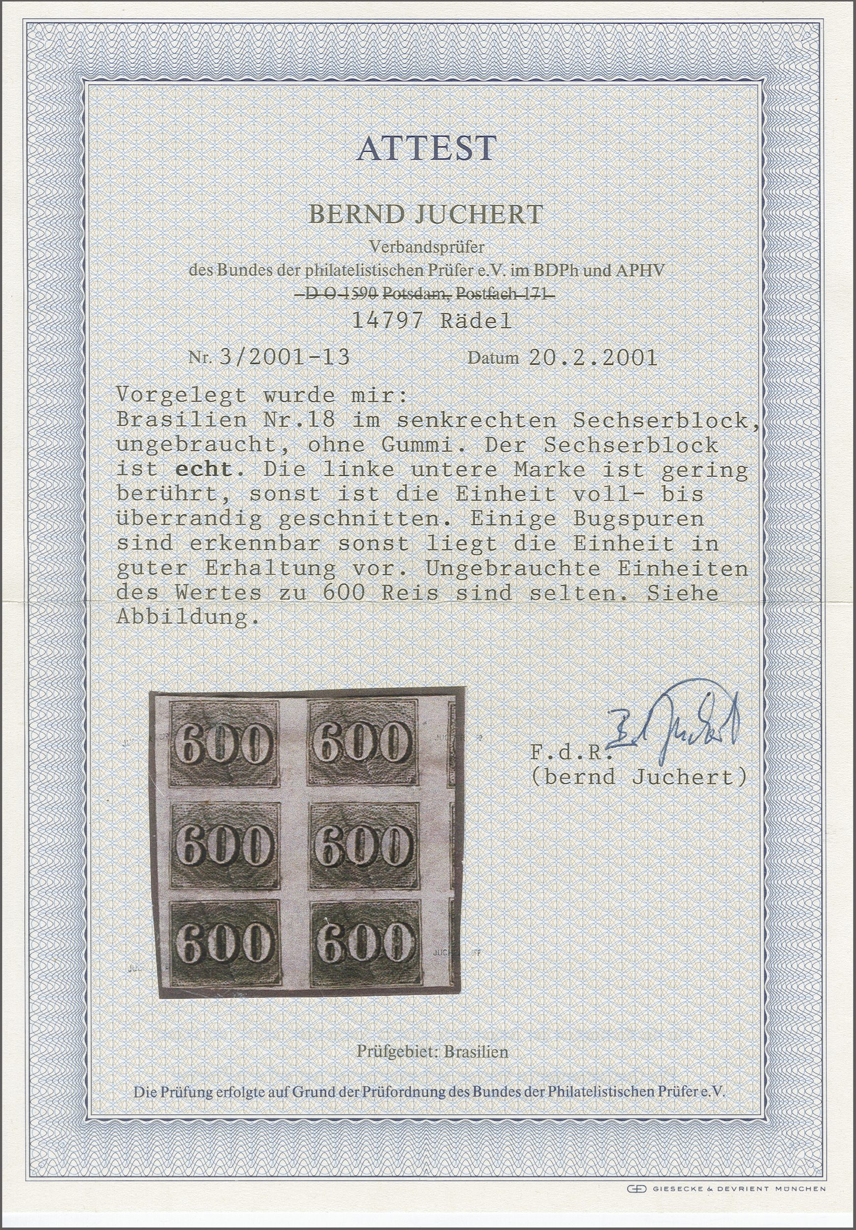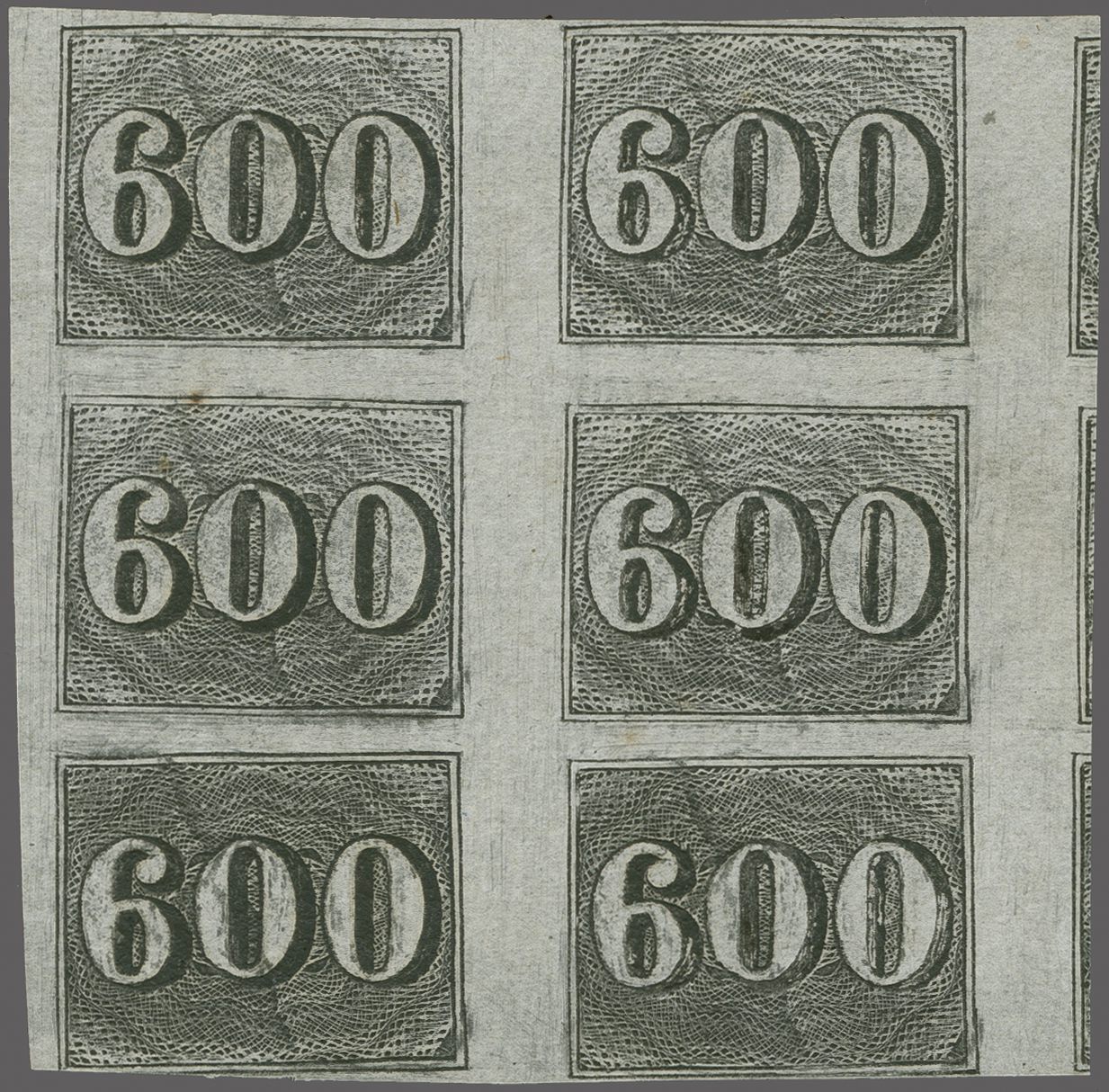 Verticais 1850: 600 r. black on thin greyish paper, an unused block of six (2 x 3), margins clear at top and large at both sides with portions of adjoining three stamps at right, imperceptibly shaved at base, typical wrinkles