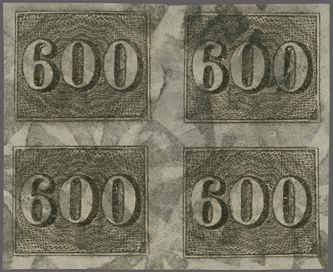 Verticais 1850: 600 r. black on greyish thin paper, a used block of four with large even margins all round, superb, fresh and extremely fine. Somewhat surprisingly, whilst a rare stamp in a block, not quite as rare as the 180