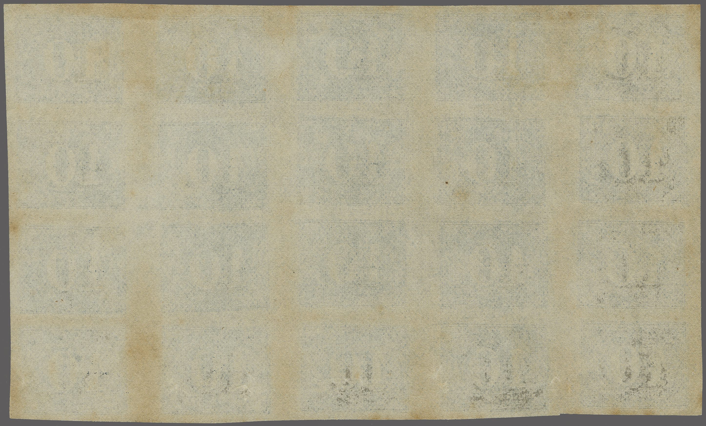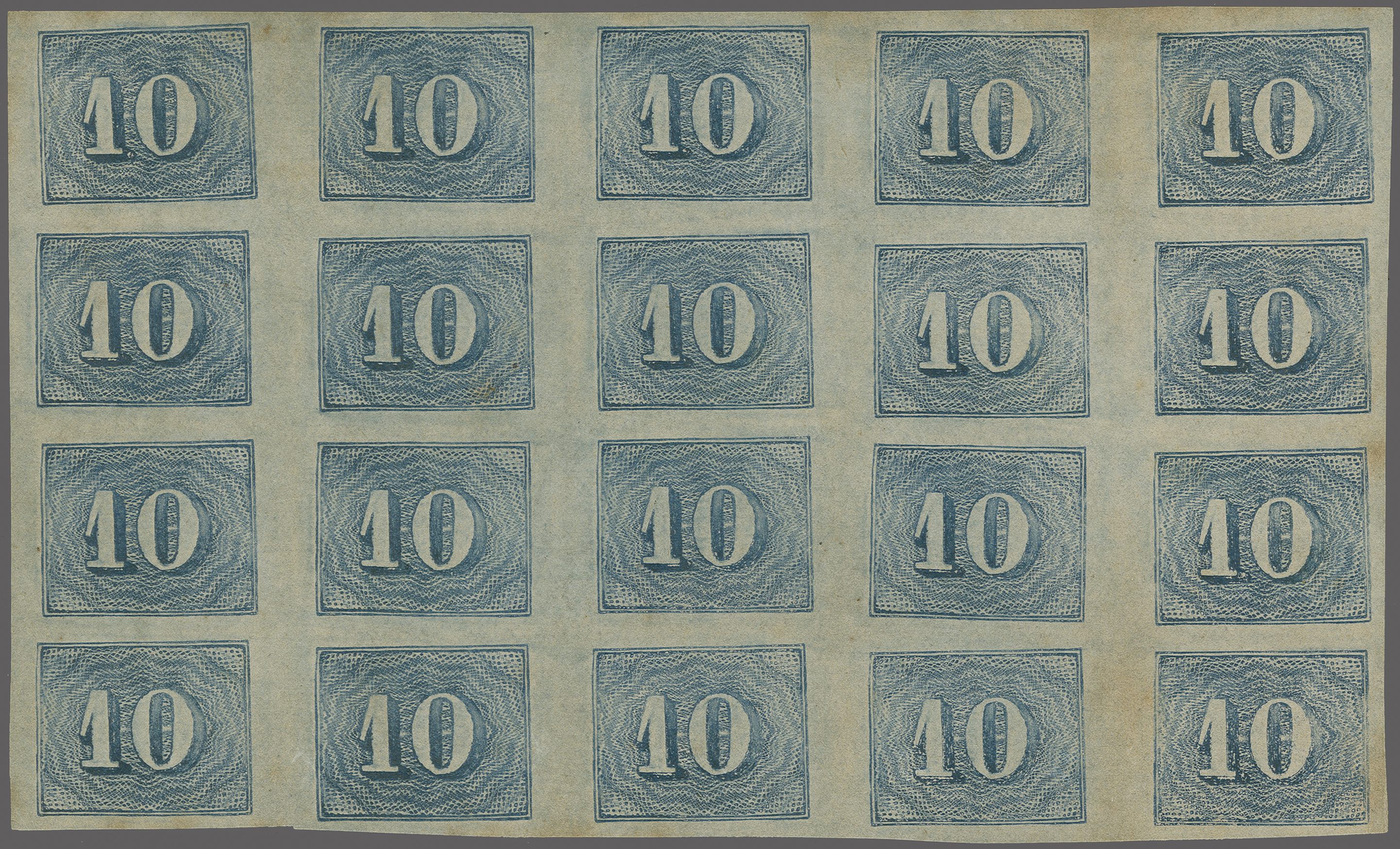 Coloridos 1854: 10 r. pale blue on yellowish thin paper, an unused block of twenty (5 x 4), of lovely delicate colour with large margins all round, slightest ageing, unused without gum. A most attractive and scarce multiple (Image 1)