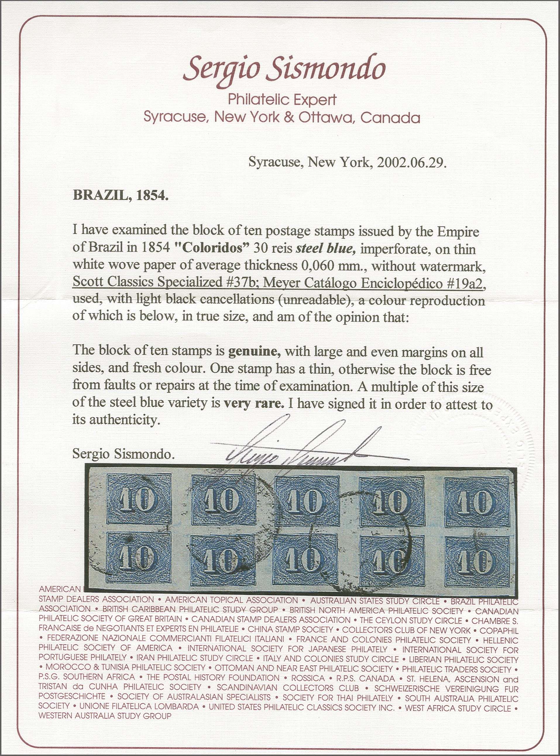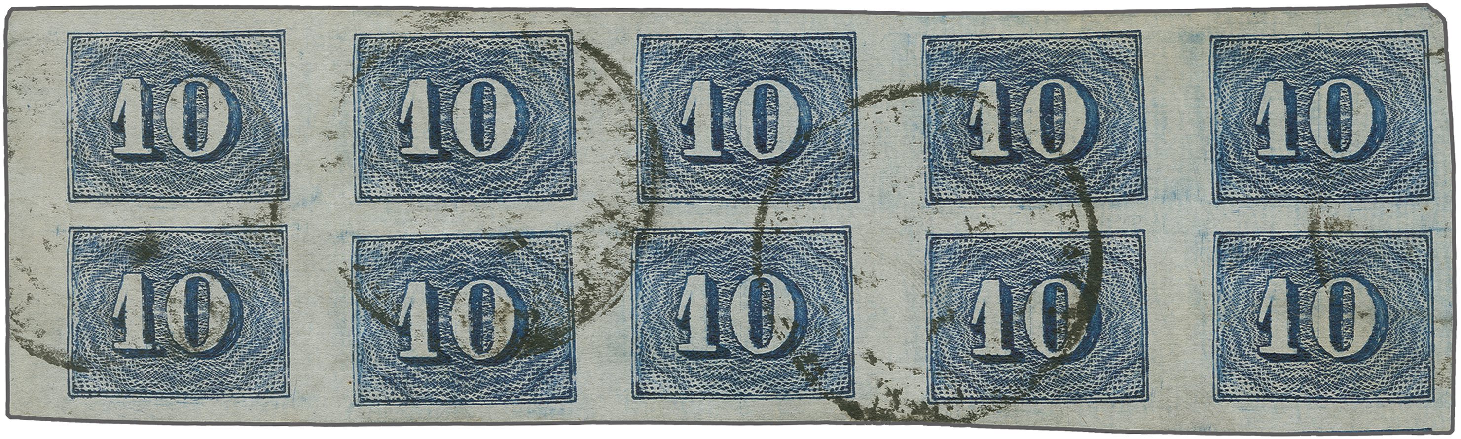 Coloridos 1854: 10 r. 'steel' blue on greyish thin paper, a used block of ten (5 x 2) in this scarce shade with large margins all round, cancelled by "Correio Geral da Corte" circular datestamps in black. Tenth stamp with