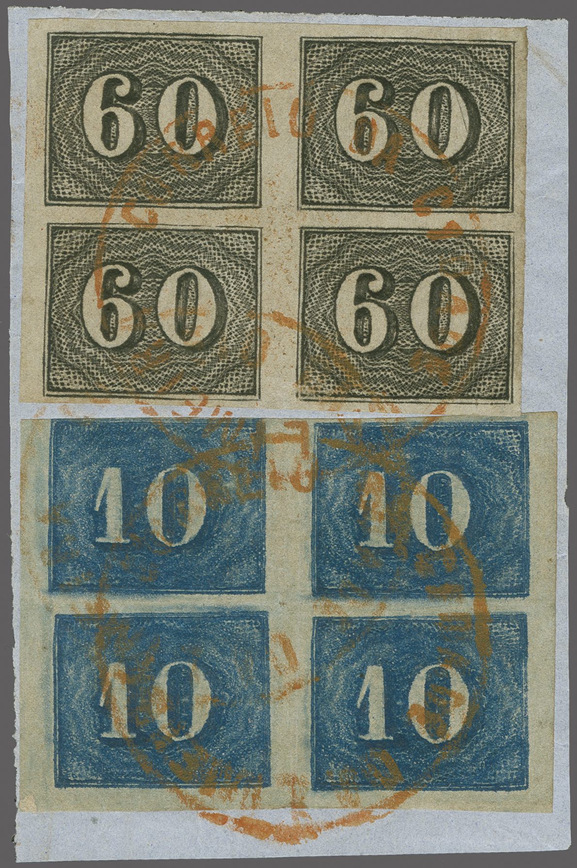 Coloridos 1854: 10 r. blue on greyish thin paper, a used block of four in a deep rich shade with mostly large margins all round used on small piece wirh 1850 60 r. black on yellowish also in a block of four, each block
