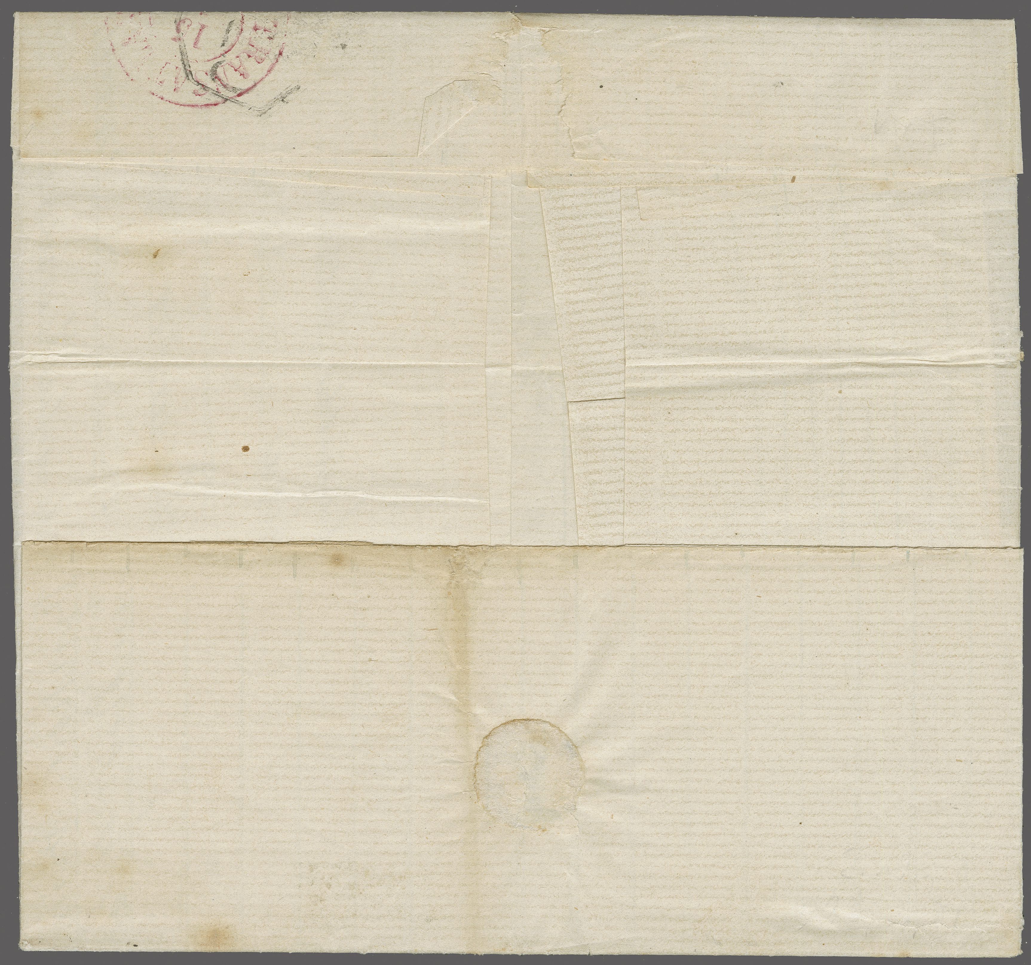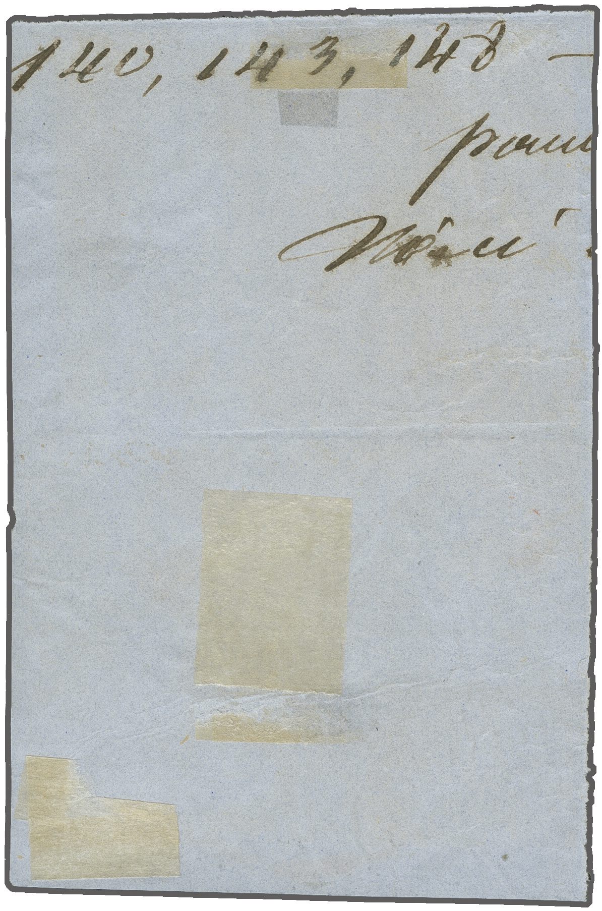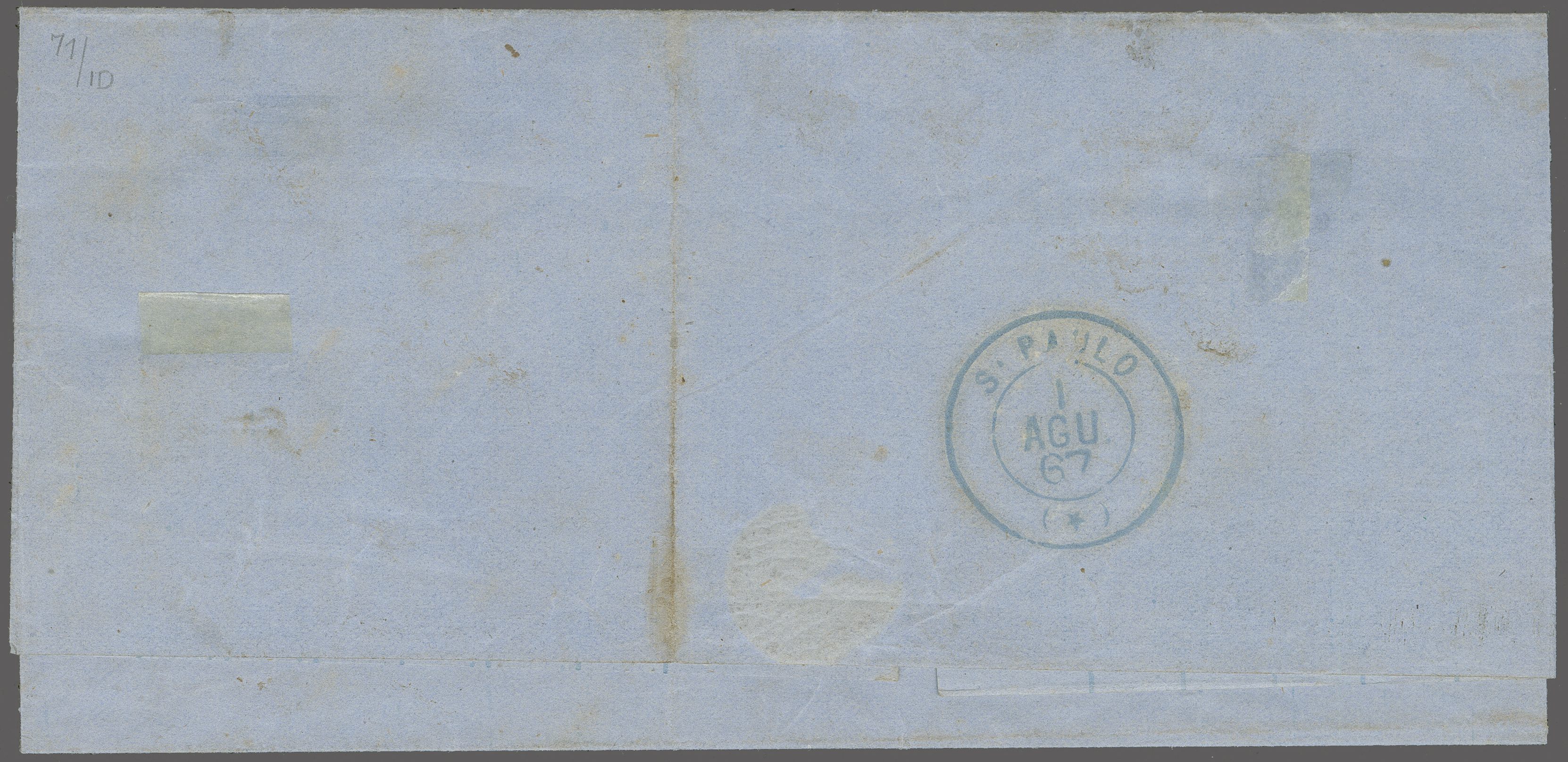 dotted lozenge in black. Charged at double rate on arrival with "300" reis handstamp in black, with "Transatlantico" violet cds of entry (15 Jan 1867). Small opening tear just touches lower left of the multiple but a rare usage (Image 1)