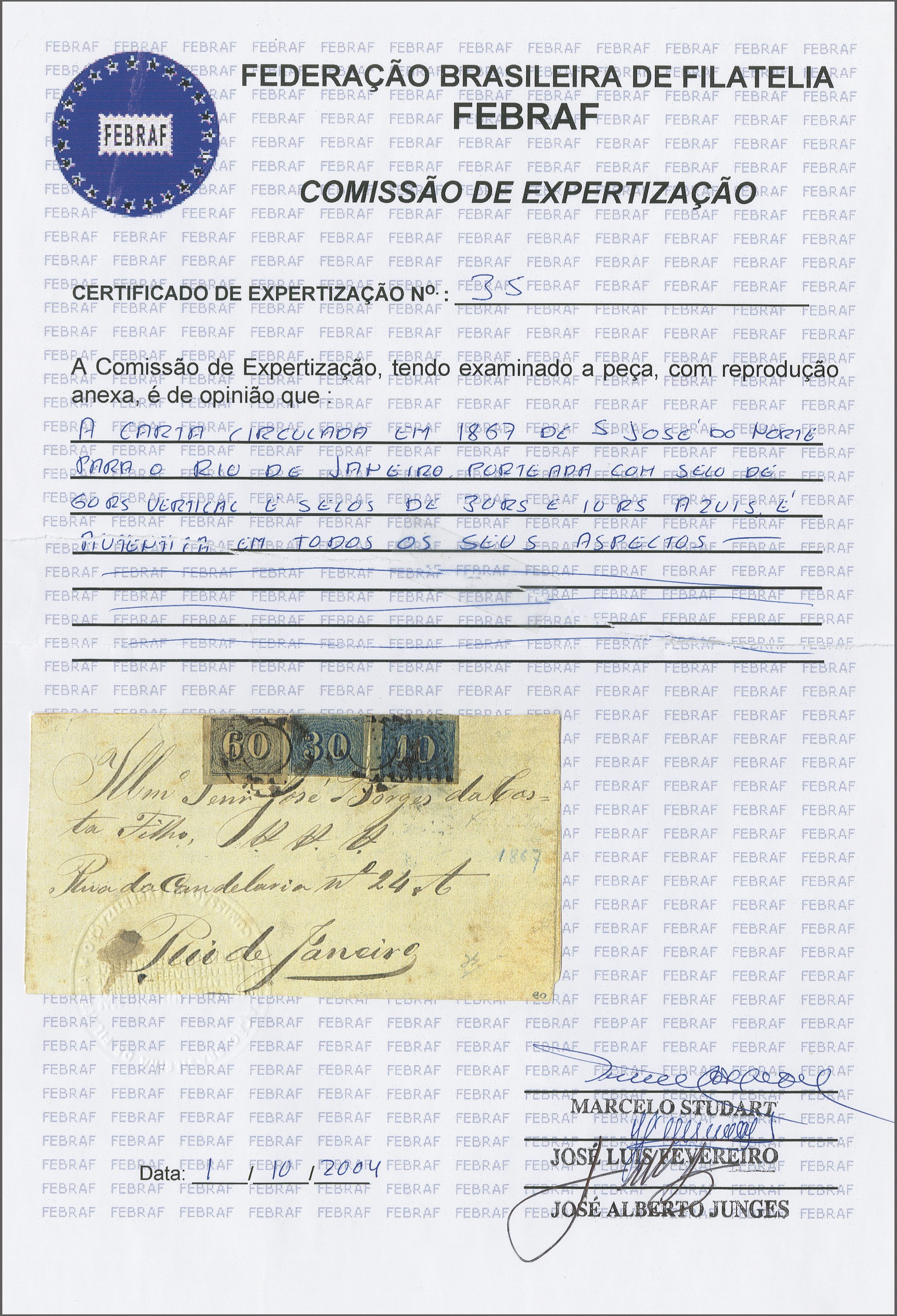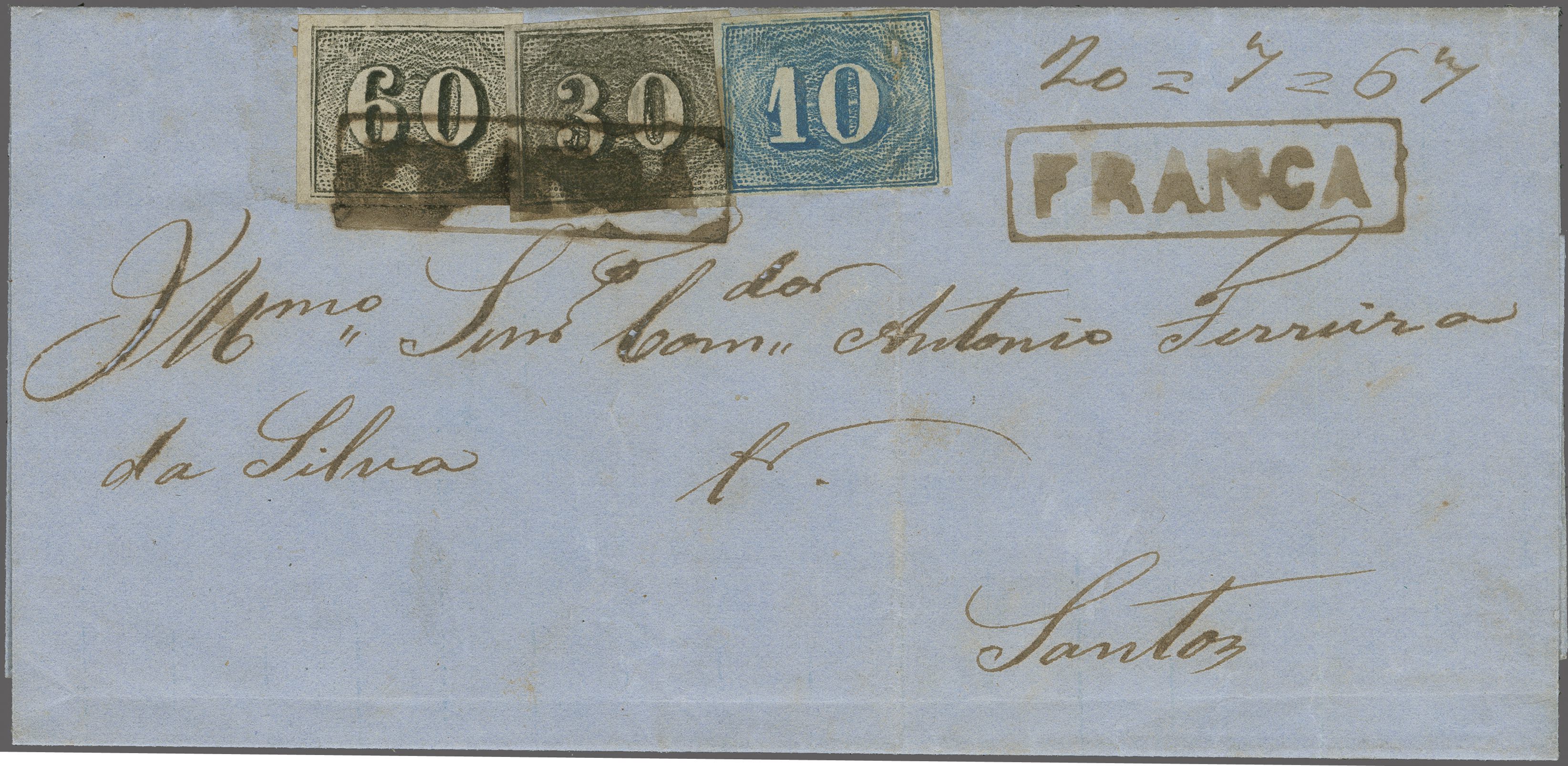 Coloridos 1854: 10 r. blue on yellowish thin paper, a used example in combination with 1850 30 r. black and 60 r. grey-black, all with close to good margins; used on 1867 cover from Franca to Santos at single rate tied by two