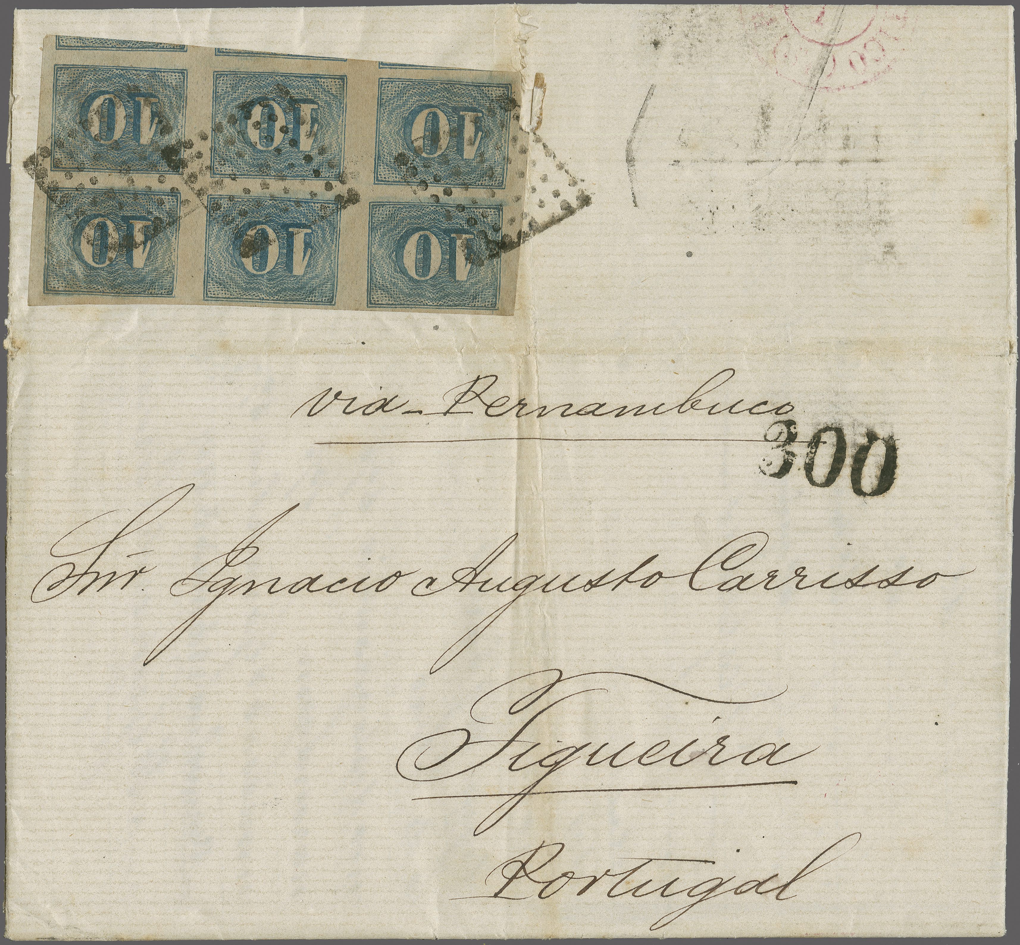 Coloridos 1854: 10 r. blue on yellowish thin paper, a used block of six (3 x 2) used on reverse of 1866 entire letter from Pará to Figueira, Portugal endorsed "via Pernambuco", paying the internal 60 reis single rate, tied by