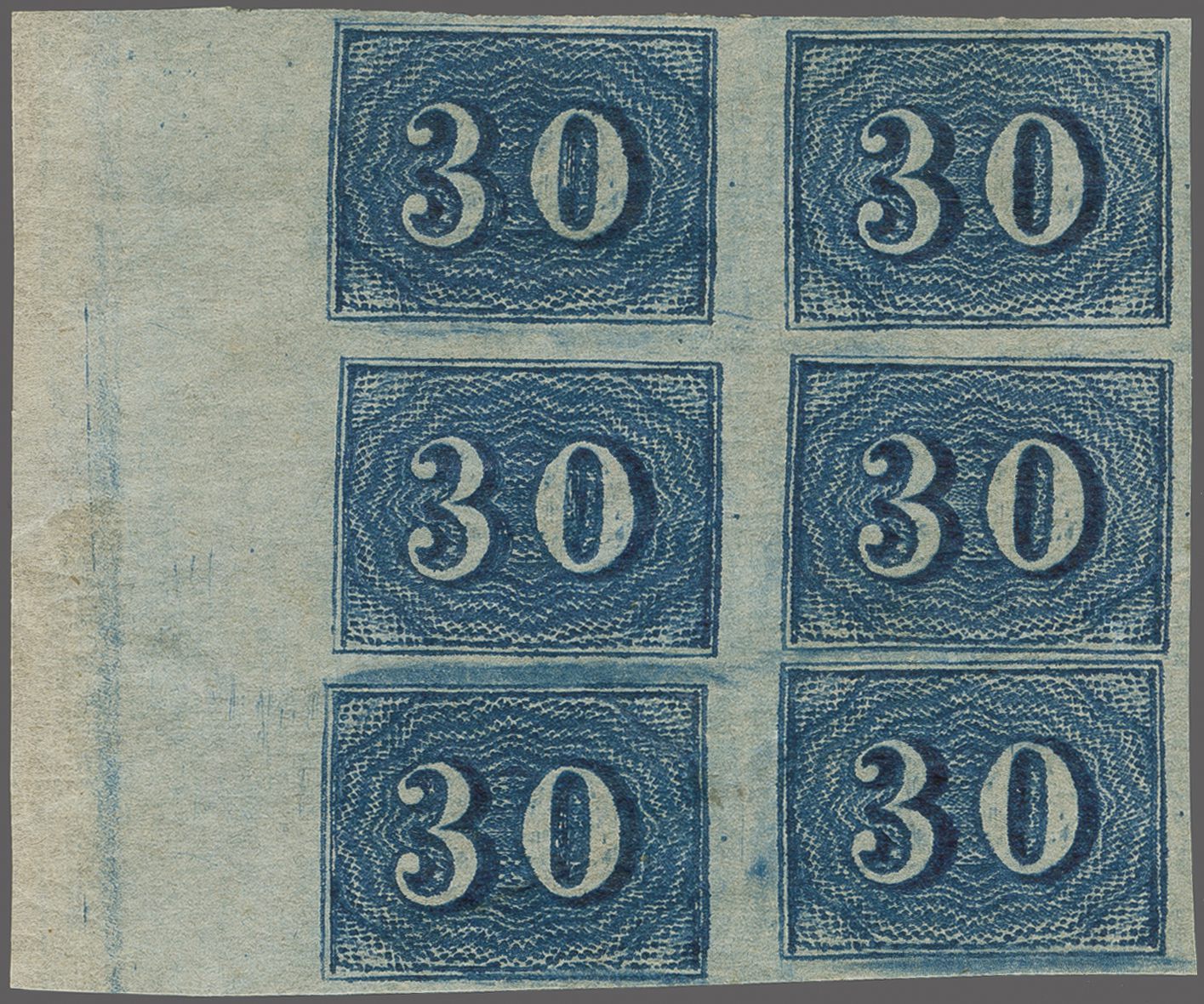 Coloridos 1854: 30 r. dark blue, an unused block of six, good margins all round and sheet marginal at left, of vivid fresh colour, diagonal crease unapparent on face, unusually with large part original gum Scott = $ 420+ (Image 1)