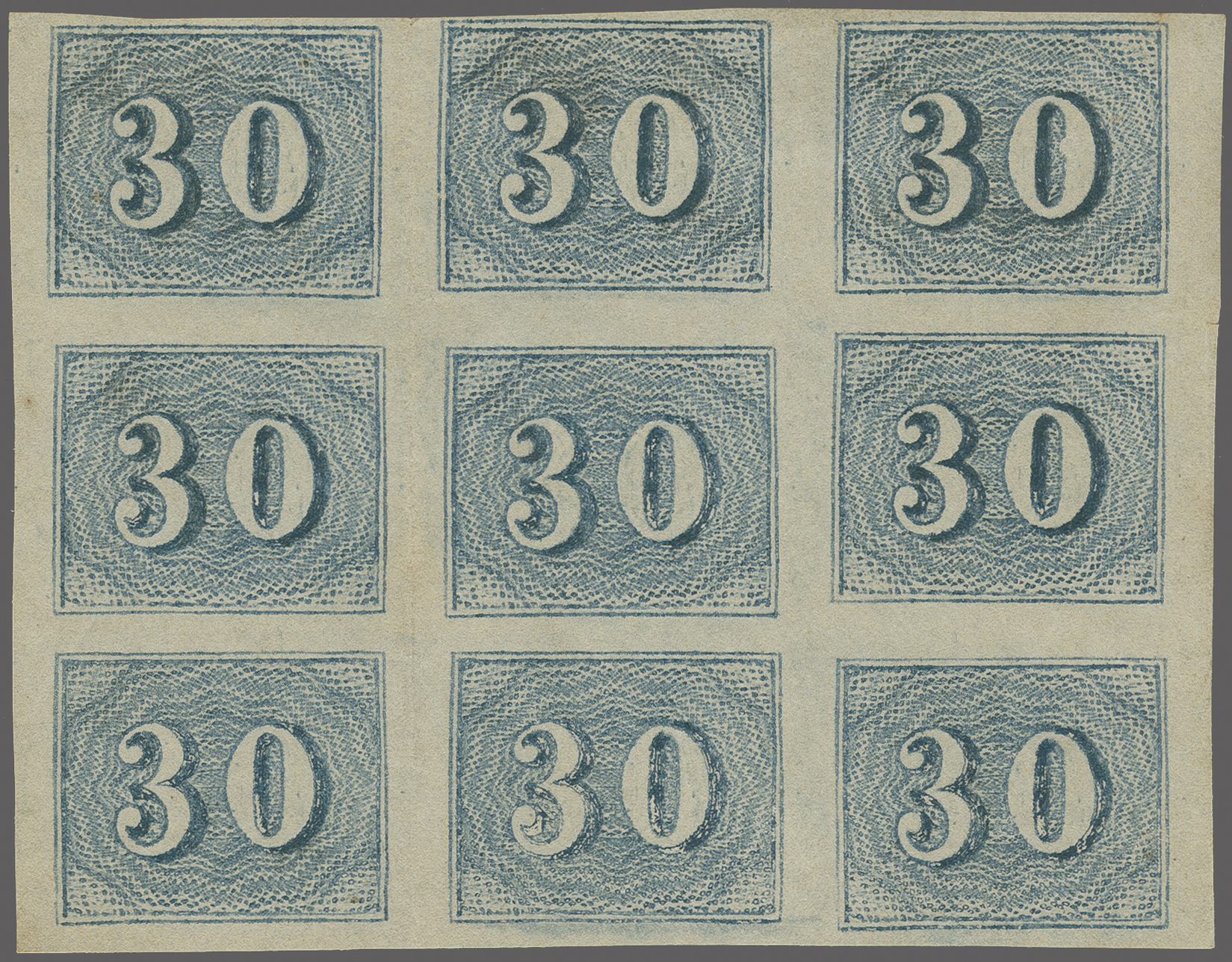 Coloridos 1854: 30 r. greyish-blue on greyish thin paper, an unused block of nine with good to large margins all round, slight colour loss at top and thin spot on third stamp, otherwise fine unused Scott = $ 360+ (Image 1)