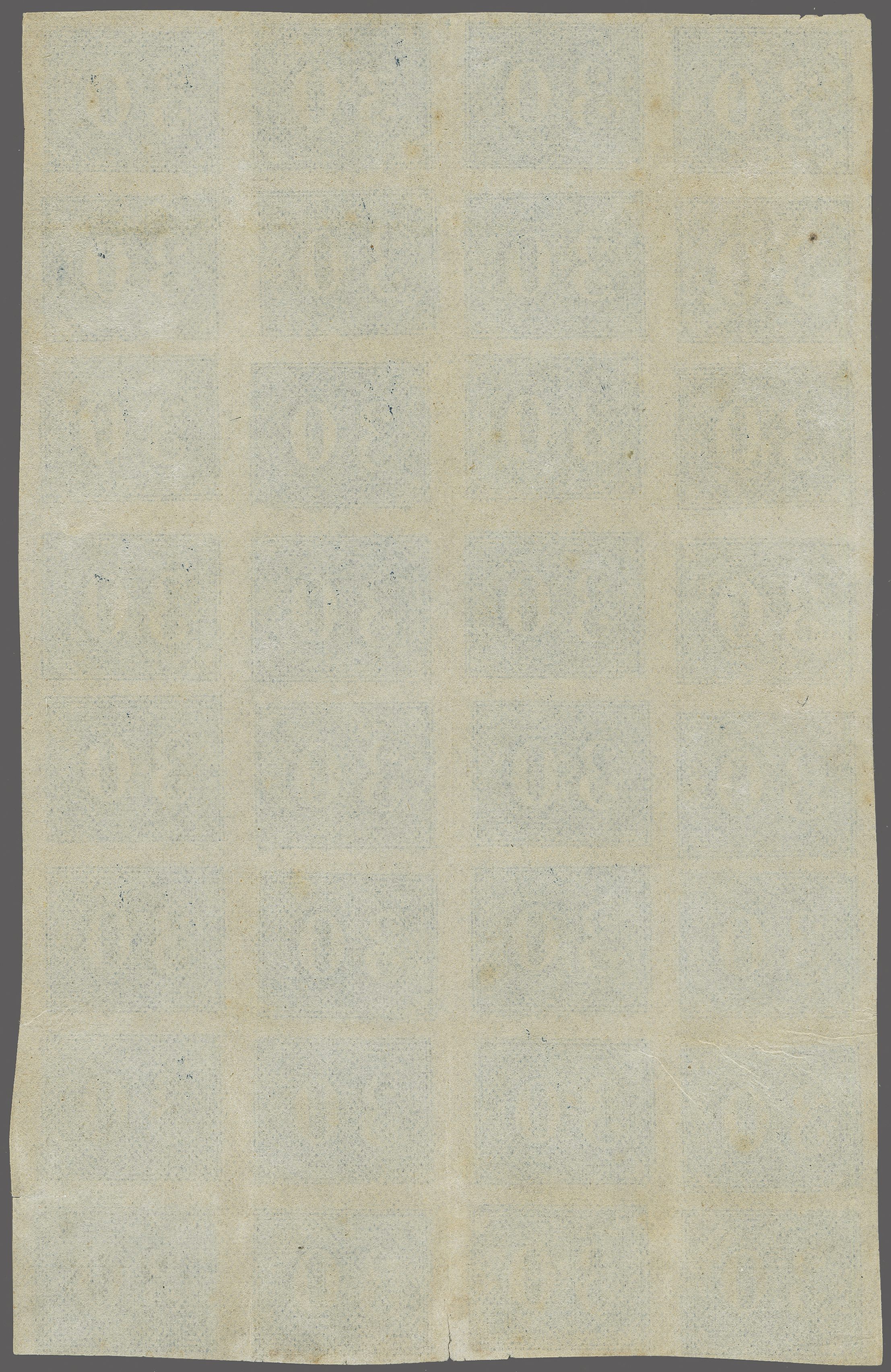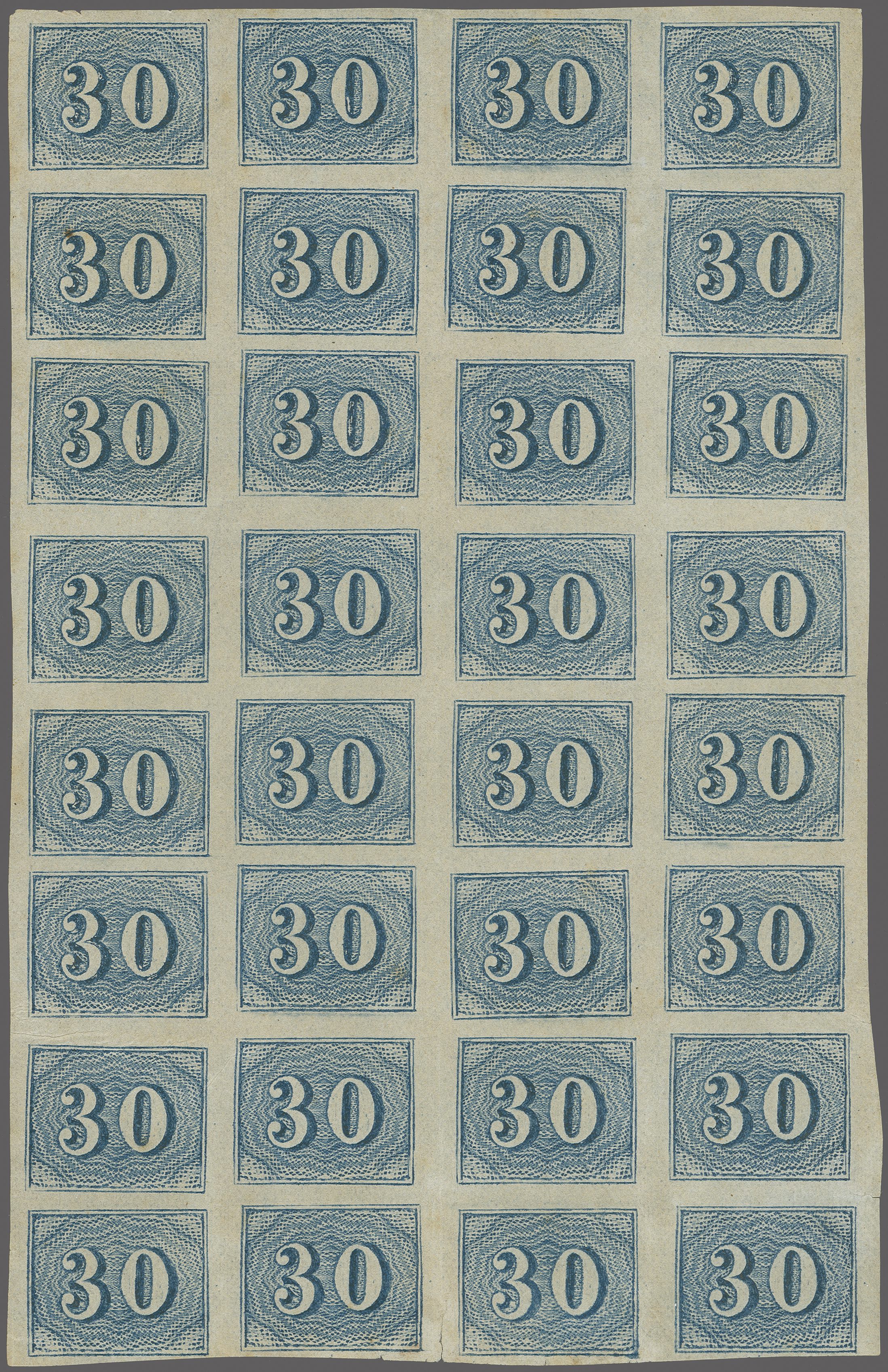 Coloridos 1854: 30 r. dark blue, an unused block of thirty-two, good to large margins all round, of delightful fresh colour, tiny inclusion in margin only at base and typical ironed bend in secod horizontal row, otherwise