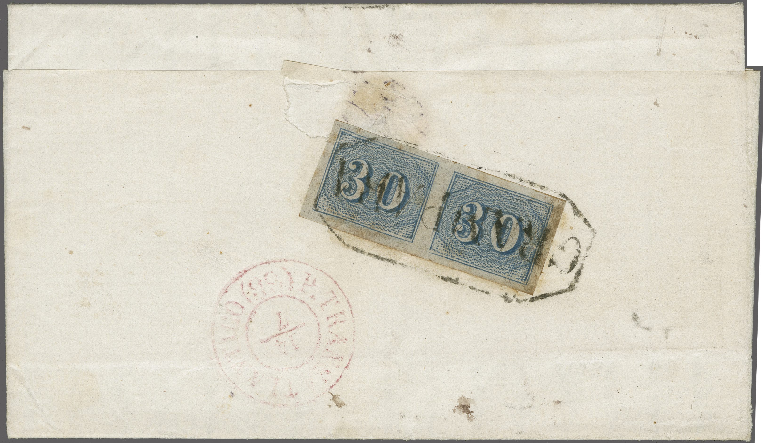 Coloridos 1854: 30 r. blue on greyish thin paper, a horizontal pair with fine margins but with corner fault due to opening and staining from gum; used on reverse of 8 June 1866 entire letter at single rate from Grampará to