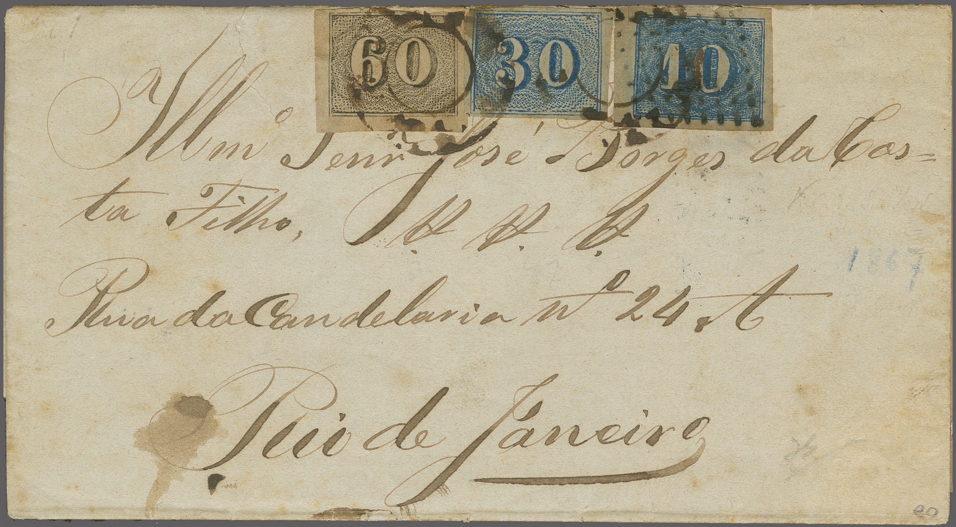 Coloridos 1854: 30 r. blue, 10 r. blue and Verticais 1850 60 r. grey-black, margins close to large, all used on 5 June 1867 entire letter from San Jose del Norte to Rio de Janeiro at single rate all tied by circular handstamps