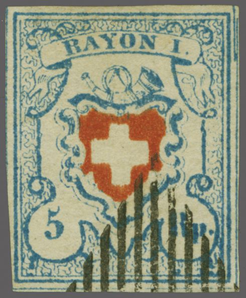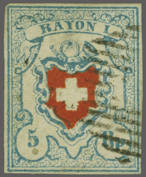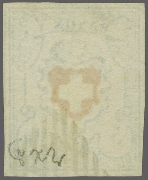Missglückter Stein: Type 37 u/G mit dem charakteristischen deformierten Kreuz, ein farbrisches und allseits sehr breit- bis überrandiges Luxusstück mit vier kompletten Trennlinien, schön zartklar entw. mit blauer eidg. Raute.