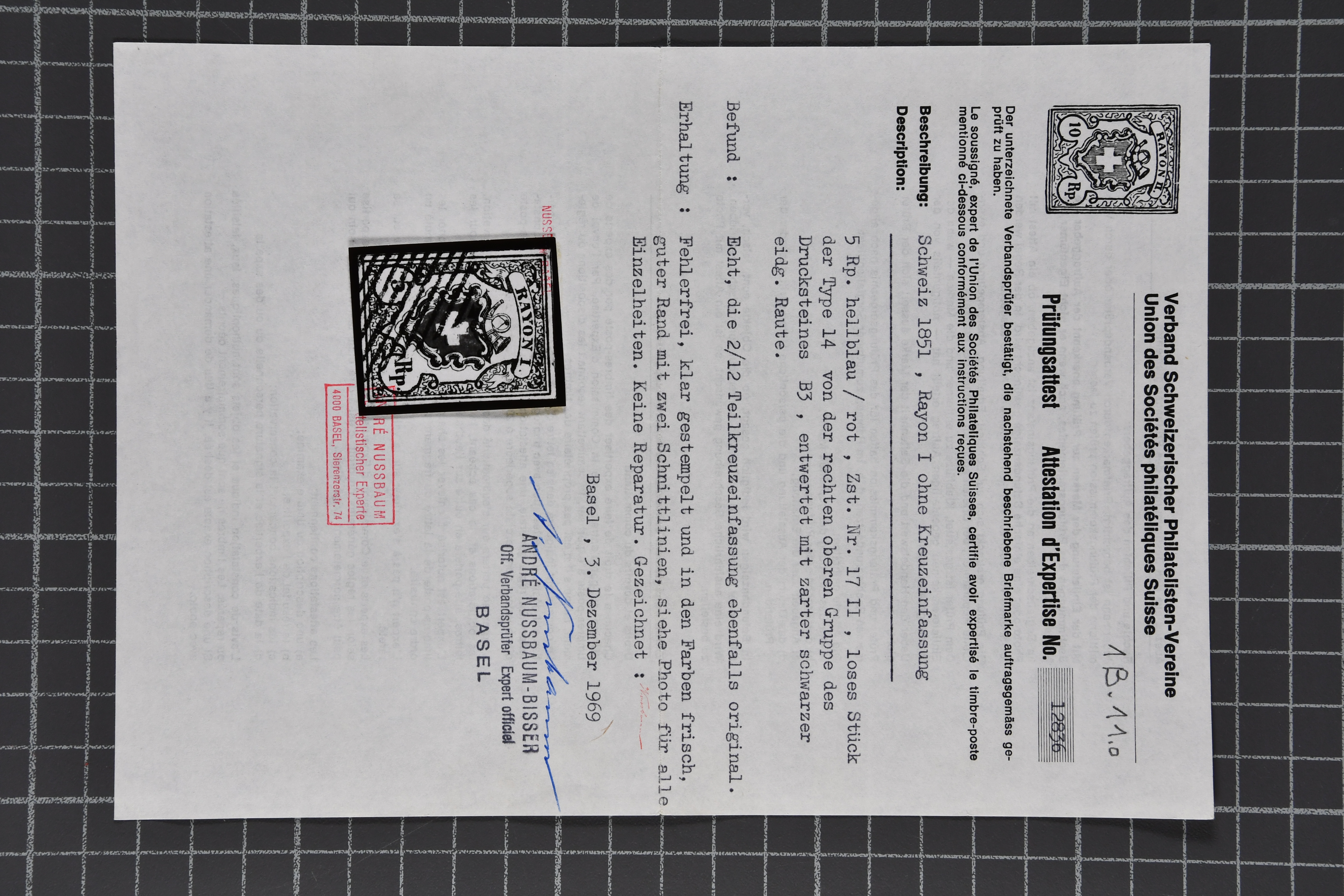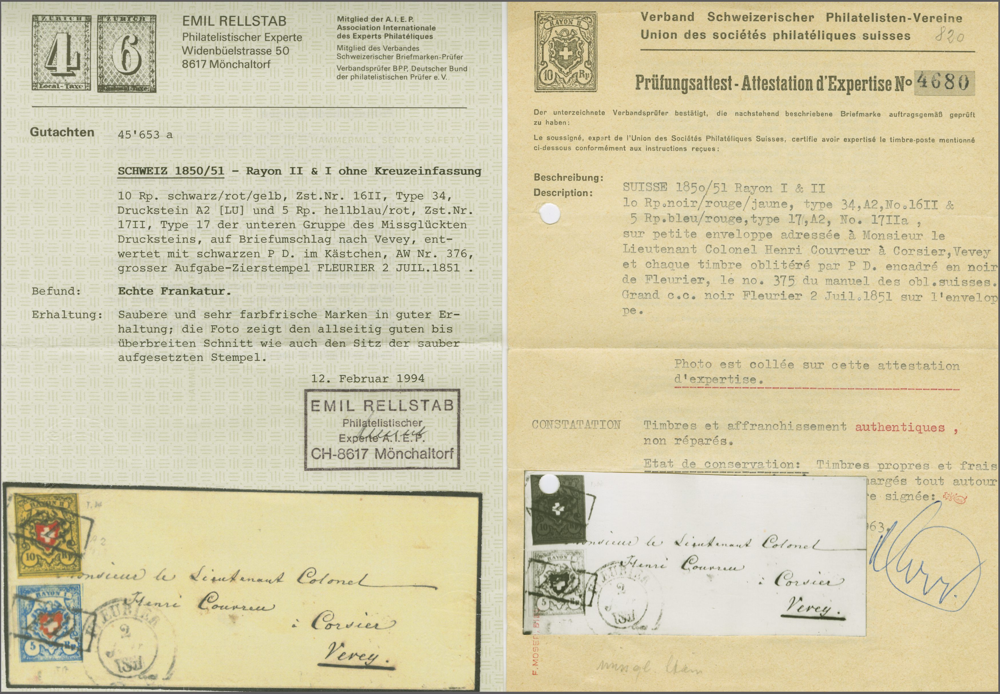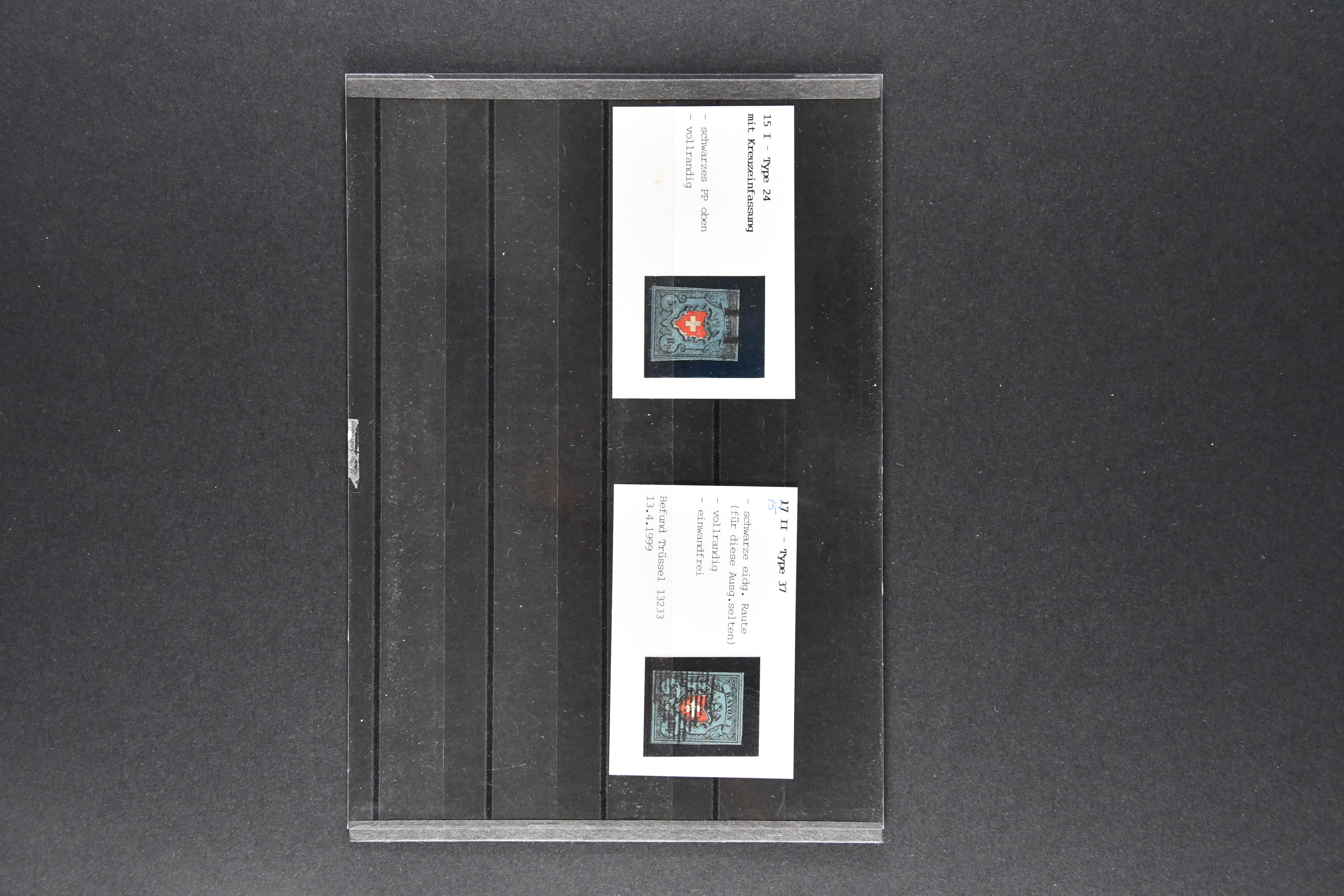 1850/51: Lot zwei Rayon I. Dabei Rayon I mit Kreuzeinfassung, Type 24 sowie ohne Kreuzeinfassung Type 37 mit auf dieser Ausgabe recht seltener schwarzer eidg. Raute. Leicht unterschiedlich; ein Befund Trüssel