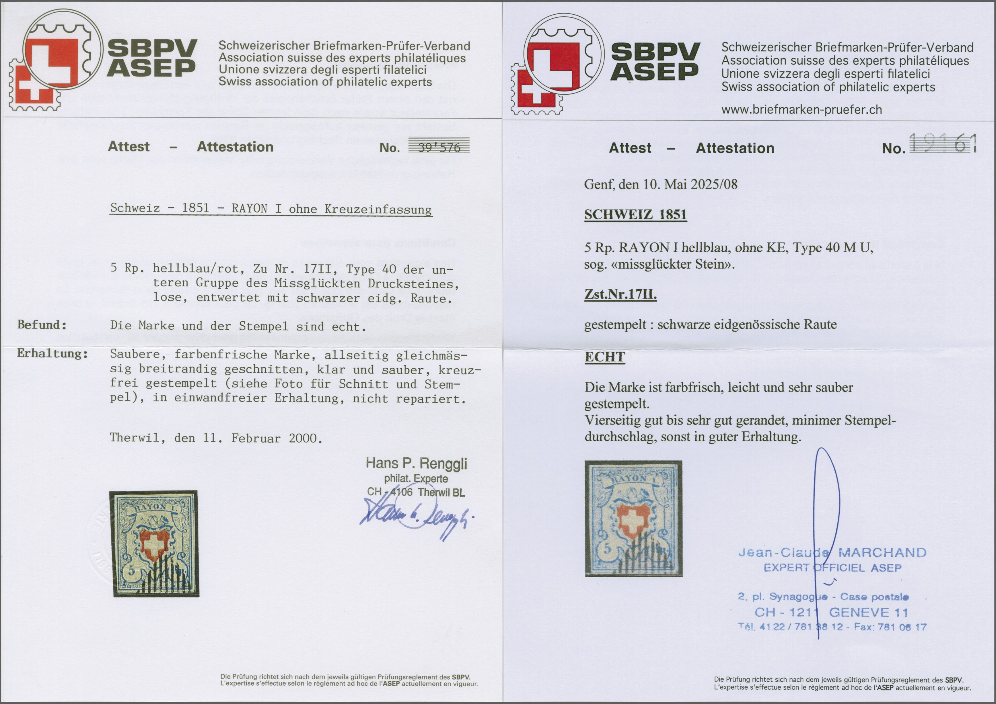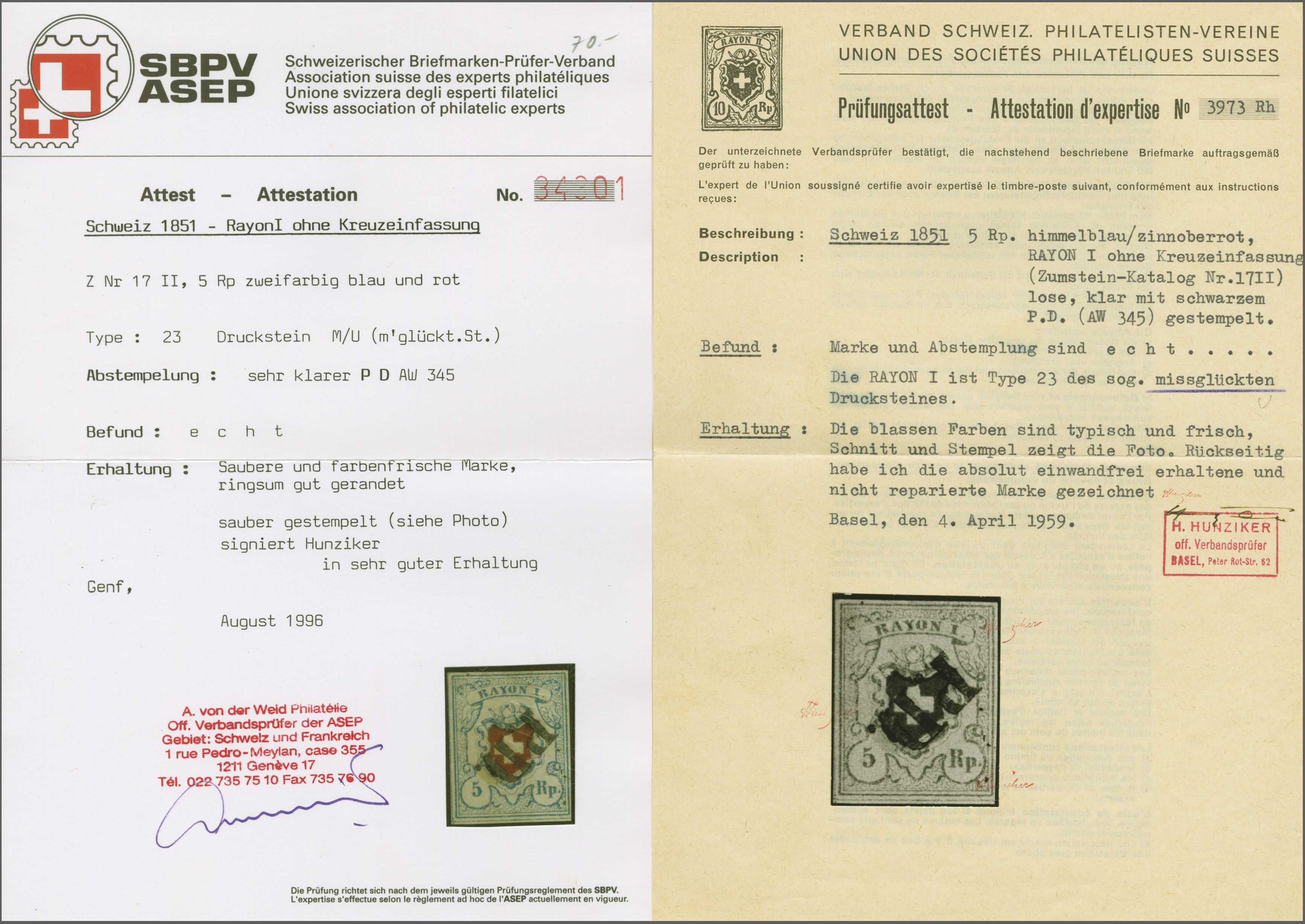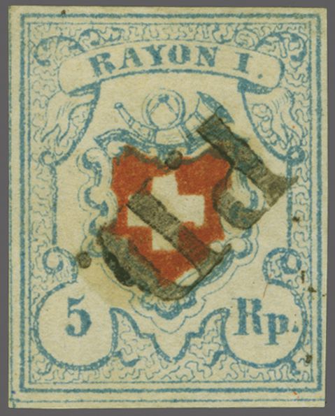 1850/51: Lot zwei Rayon I. Dabei Rayon I mit Kreuzeinfassung, Type 24 sowie ohne Kreuzeinfassung Type 37 mit auf dieser Ausgabe recht seltener schwarzer eidg. Raute. Leicht unterschiedlich; ein Befund Trüssel