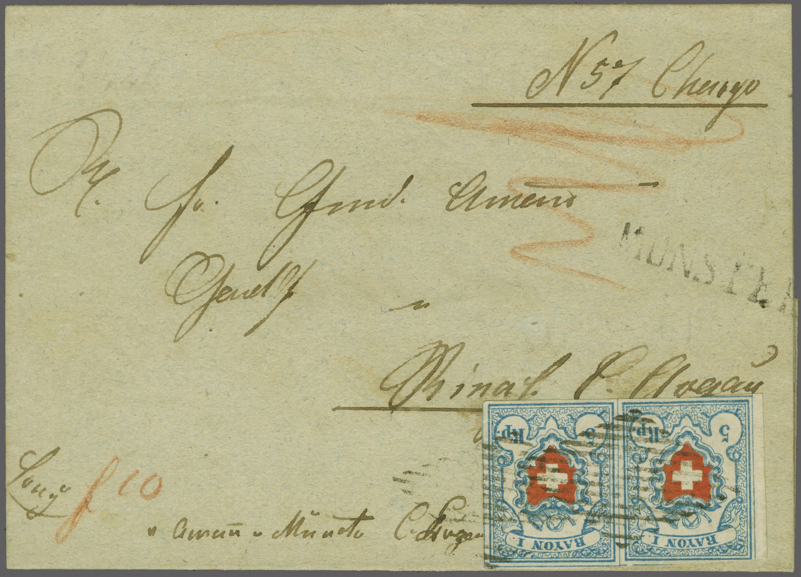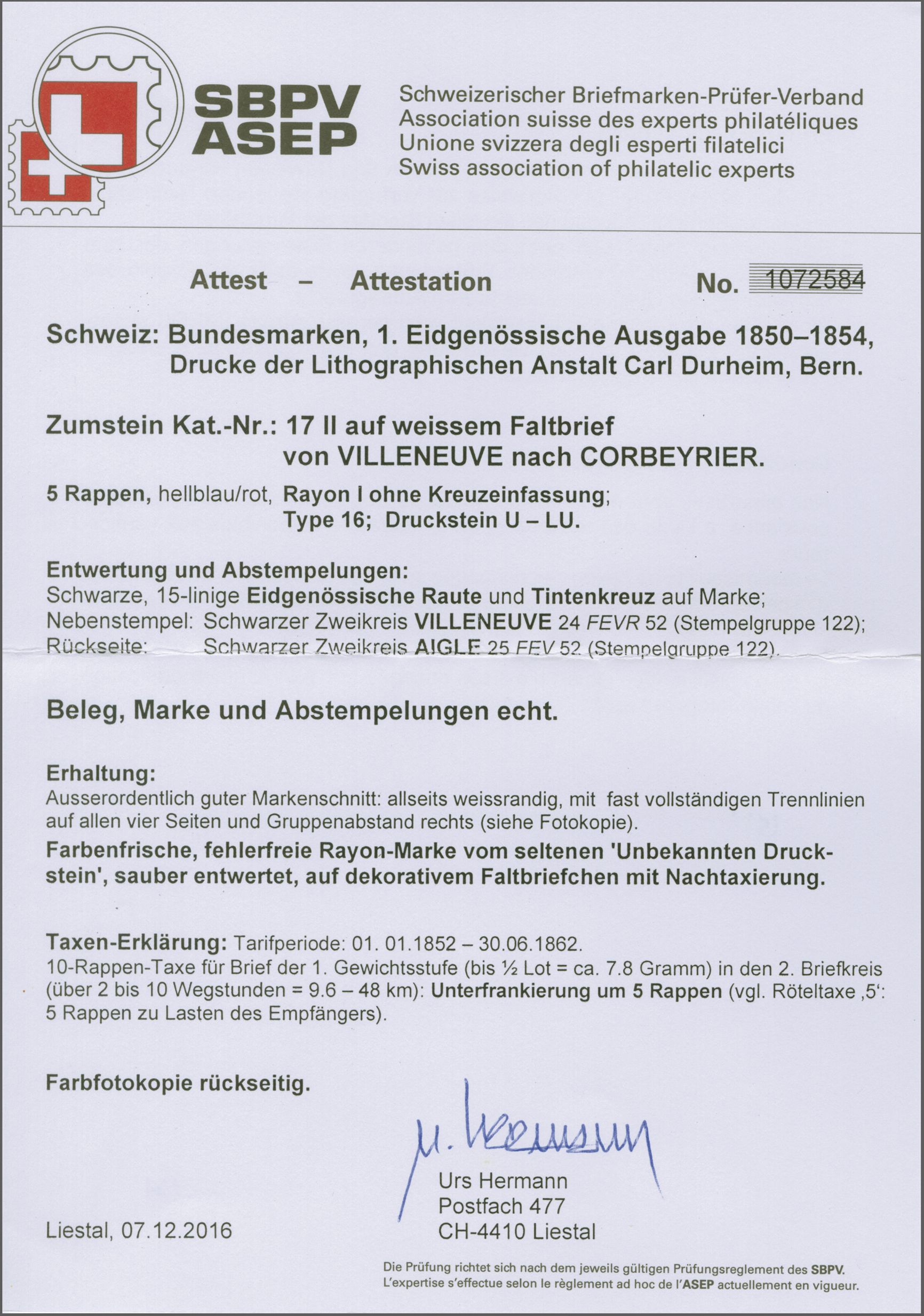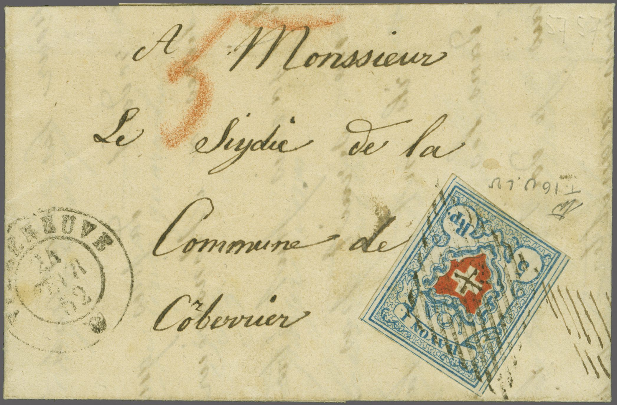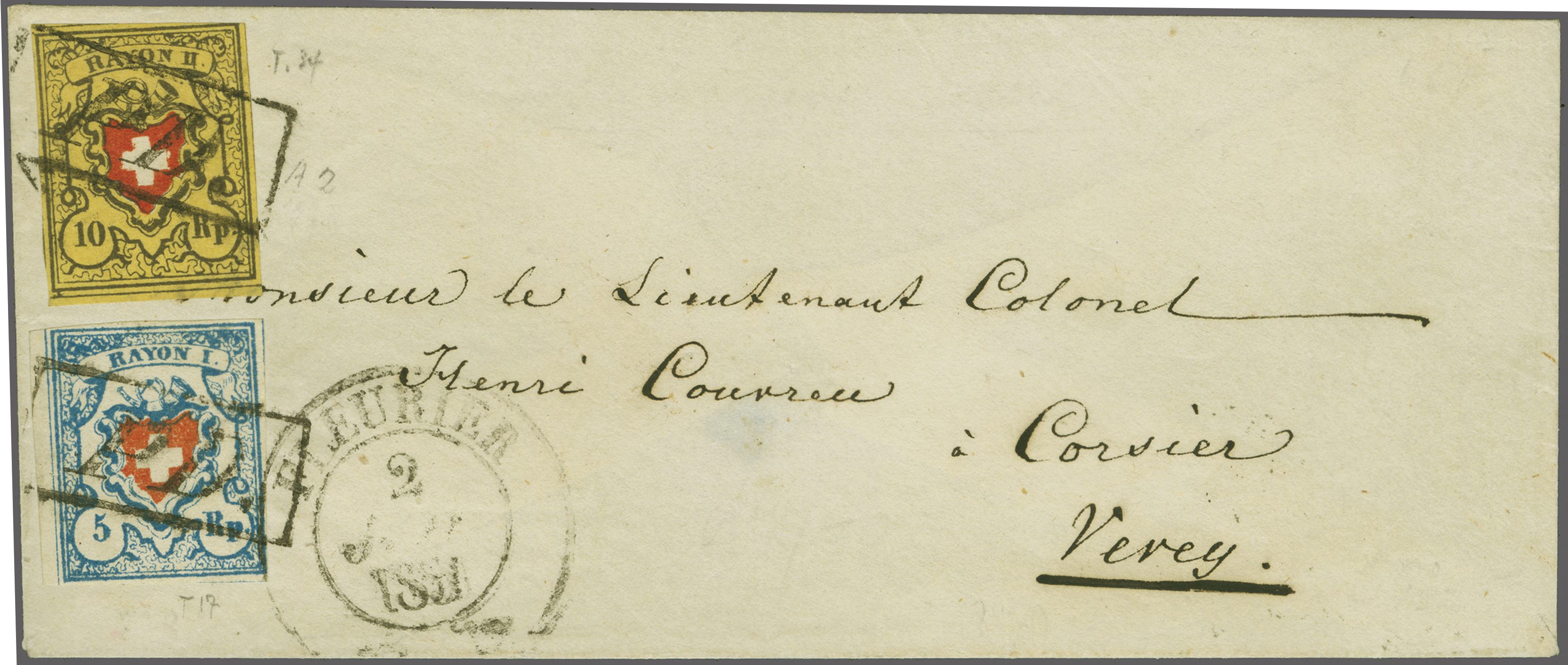 sowie mit zarter, übergehender eidg. Raute und nebenges. kl. Zweikreisstp. "VILLENEUVE 24 FEVR. 52", beide in schwarz, auf hübschem Faltbrieflein im 2. Briefkreis an den "Syndic" von Corbeyrier. Für den 2. Rayon um 5 Rappen unterfrankiert und deshalb