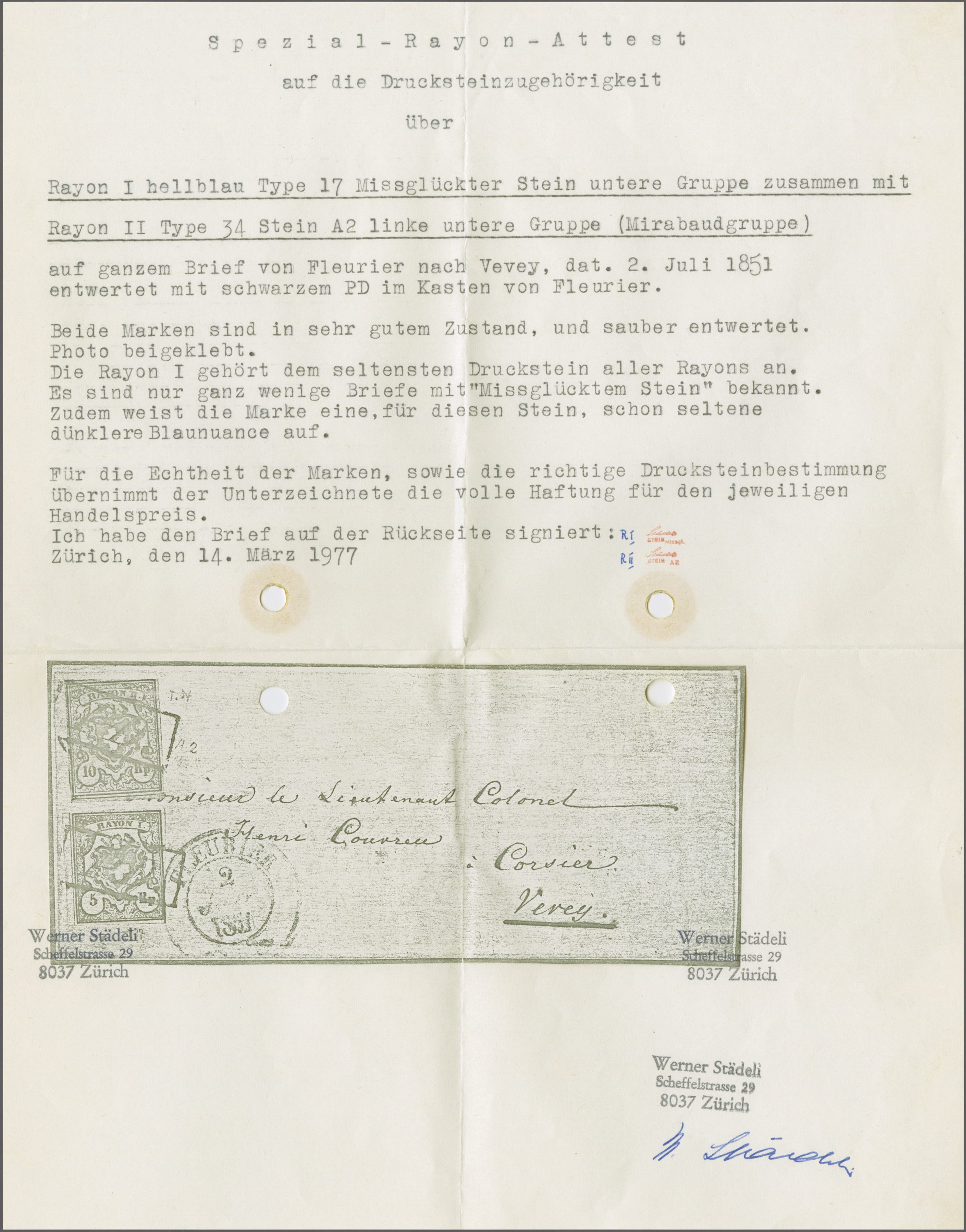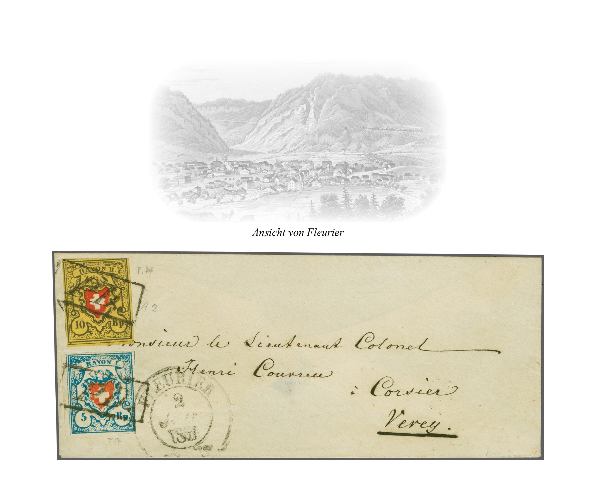 in der selben Farbe auf zierlichem Damenbrief im 3. Briefkreis nach Corsier bei Vevey. Rücks. Ankunftsstp. vom 4. Juli. Eine ausserordentlich seltene Buntfrankatur des Missglückten Steins und in Kombination mit dieser eleganten Entwertung ein