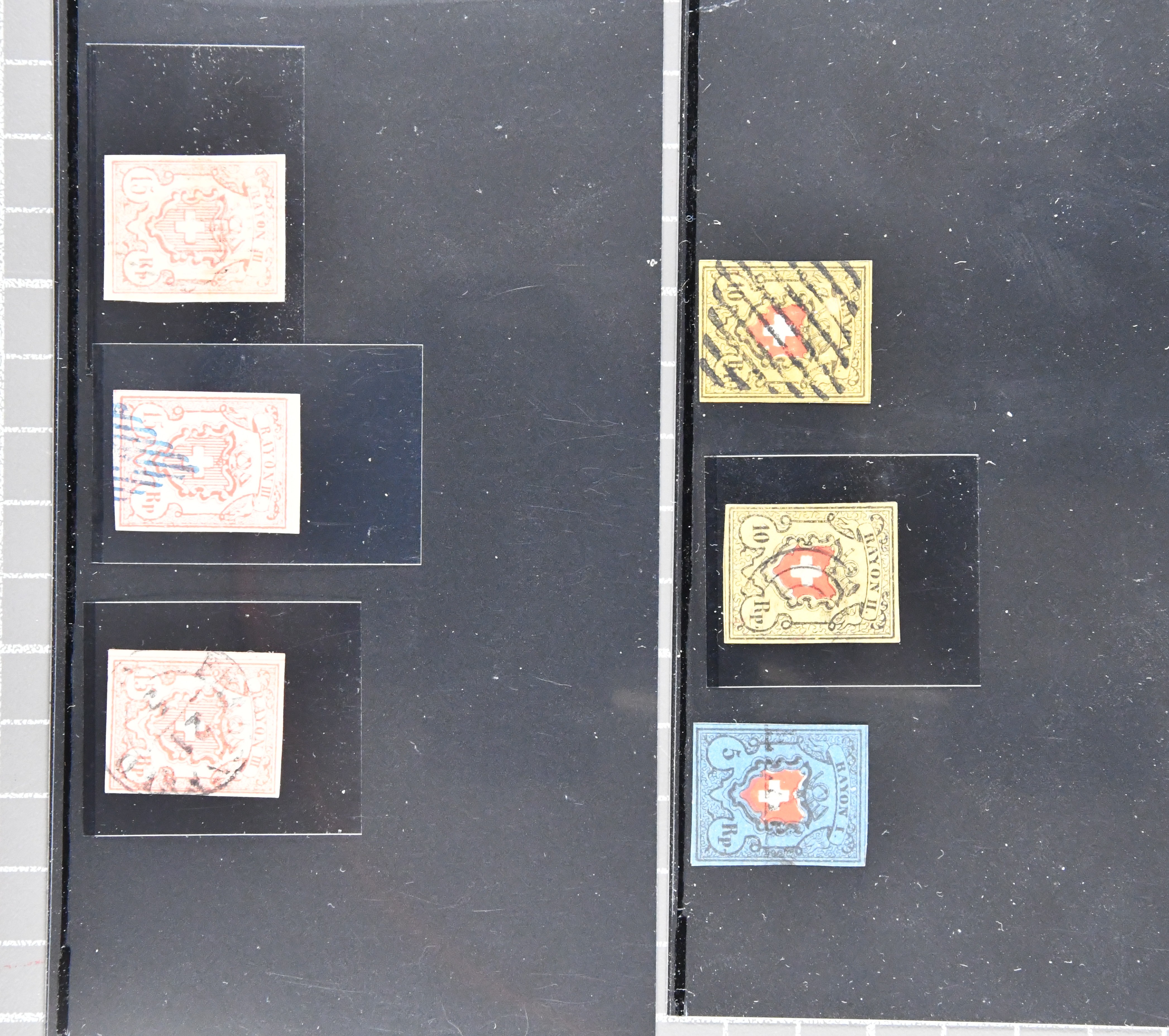 1852/54: Kleines Lot der Rayon III gr. Wertziffer mit je einer Einzelmarke mit schwarzer und blauer eidg. Raute sowie zwei Einzelfrankaturen mit einmal Type 9, übergehend entw. mit schwarzer eidg. Raute mit