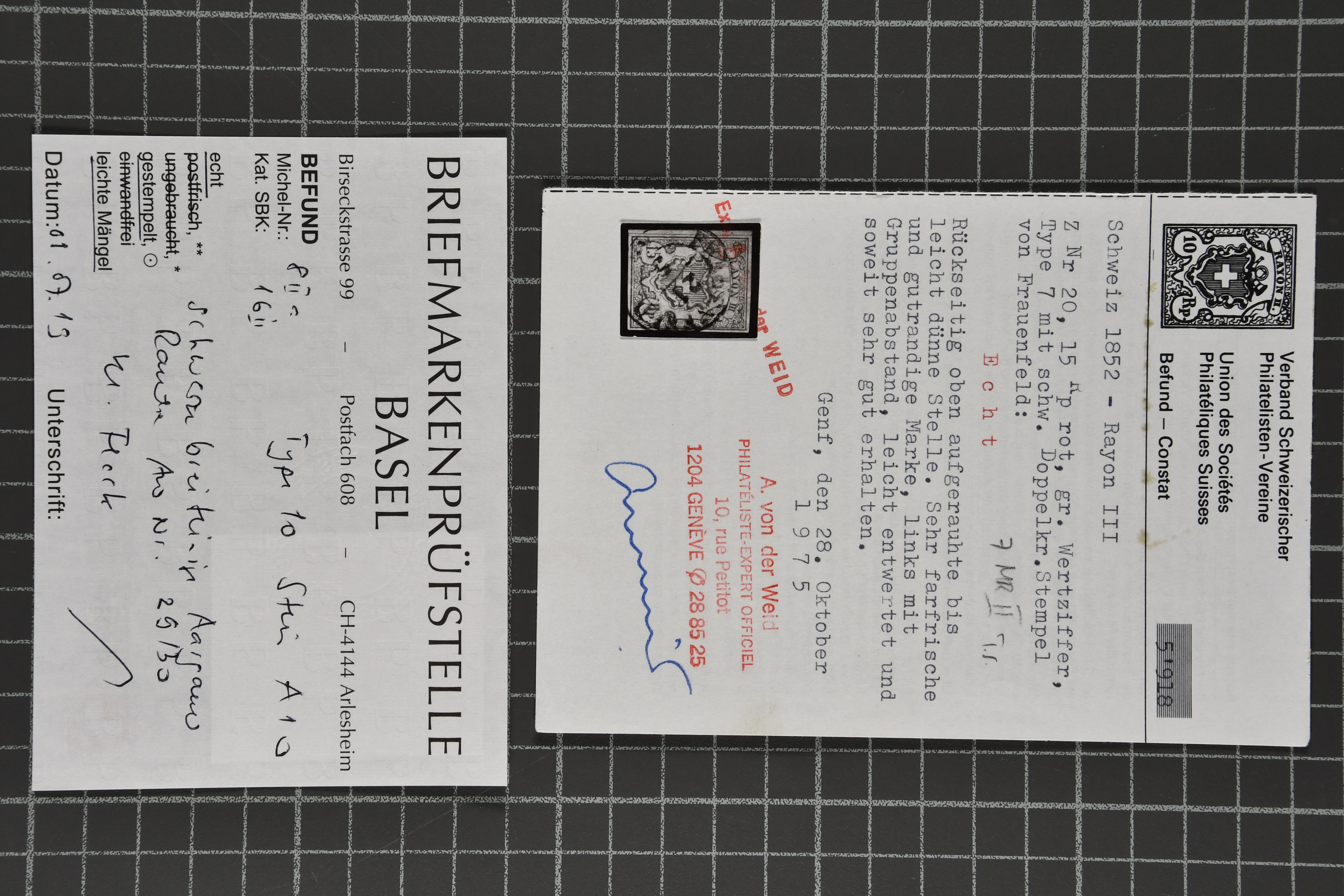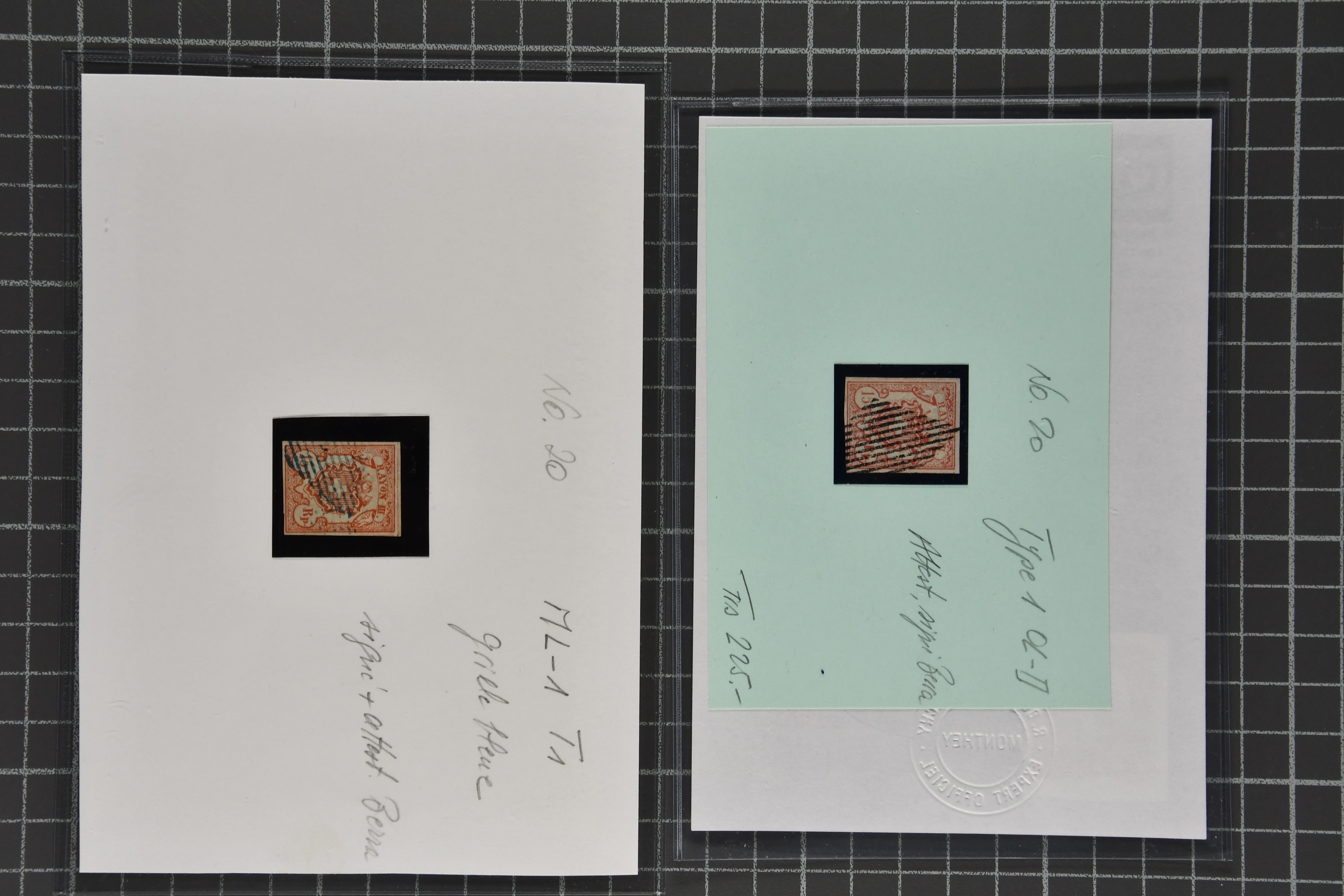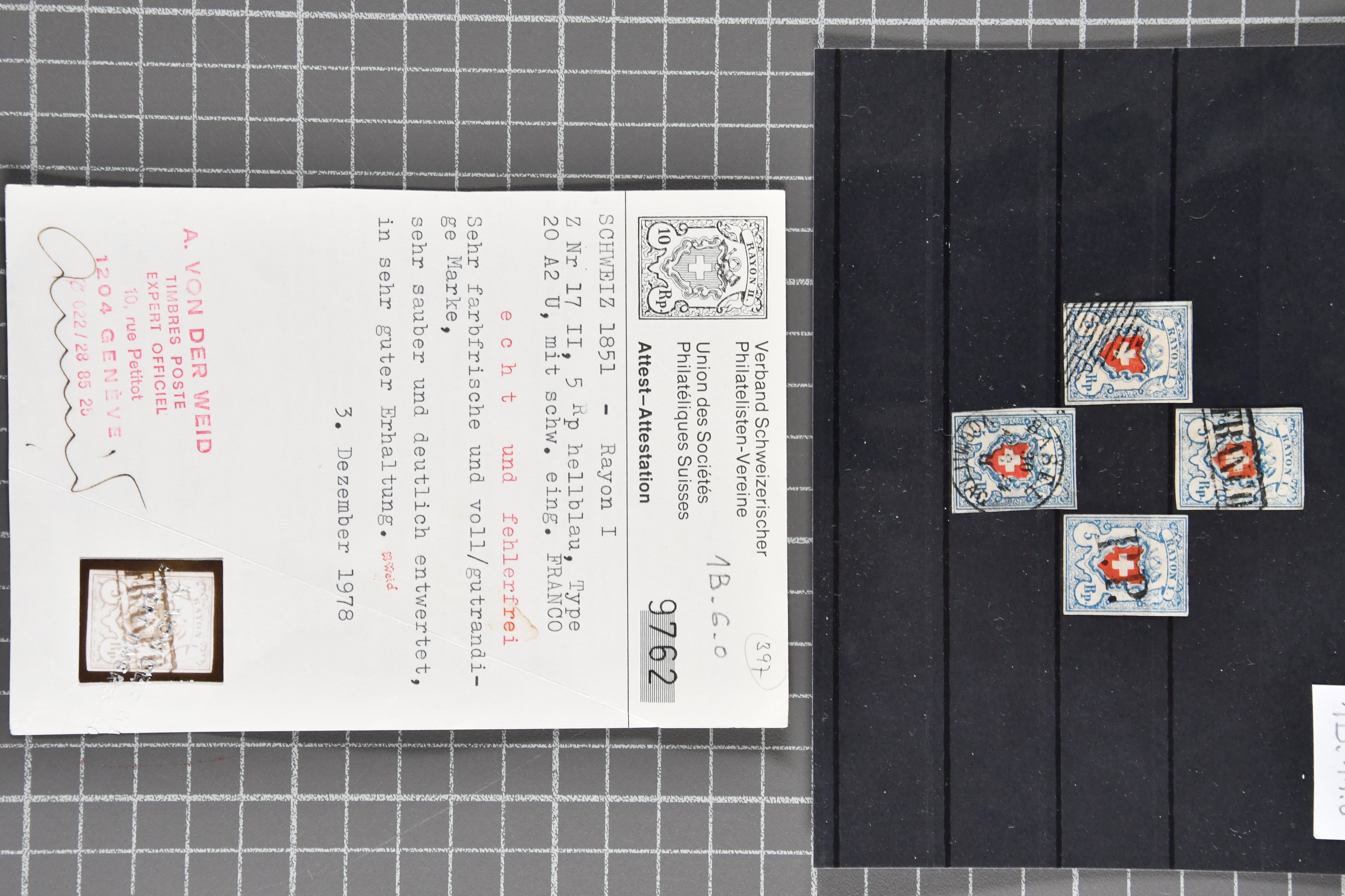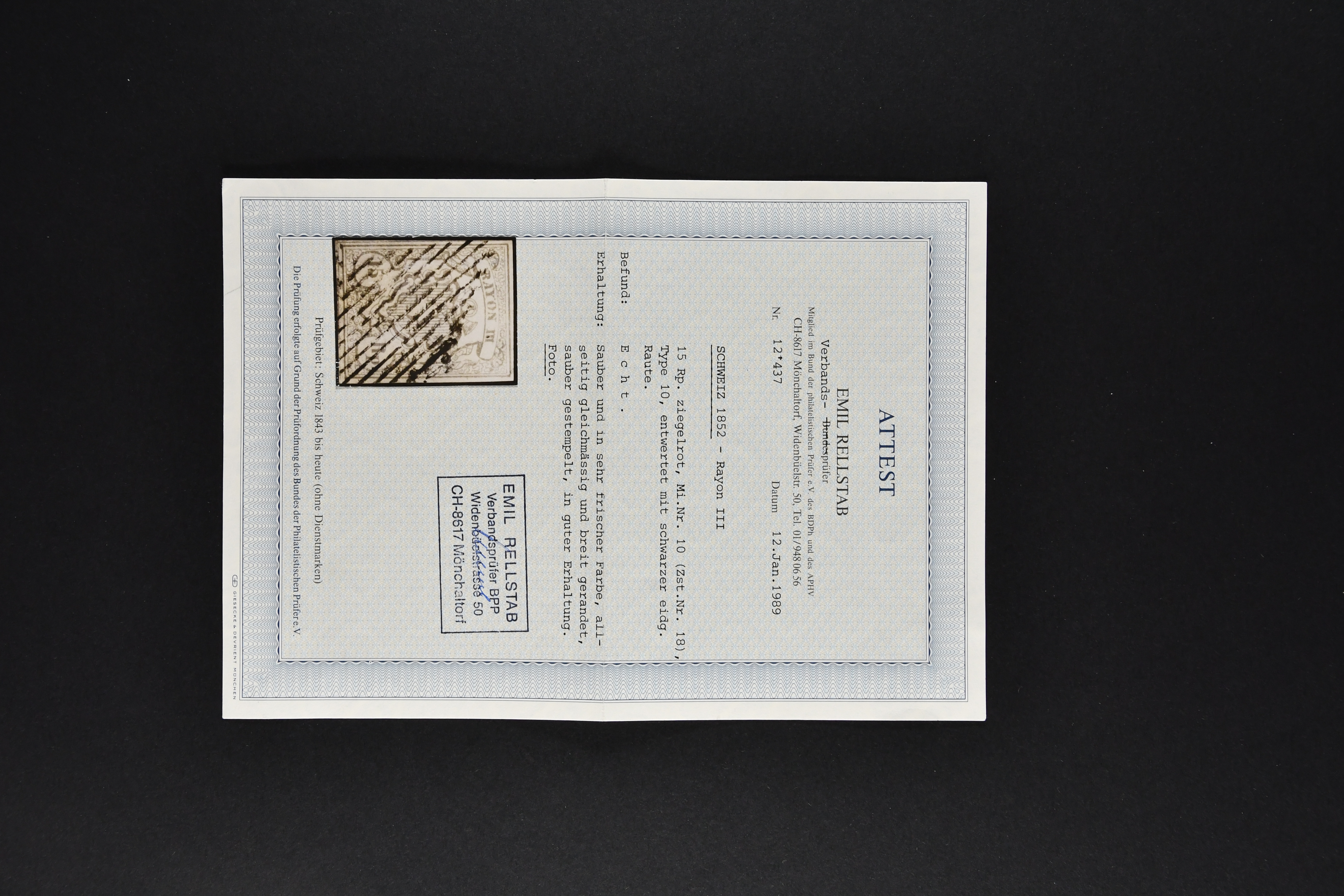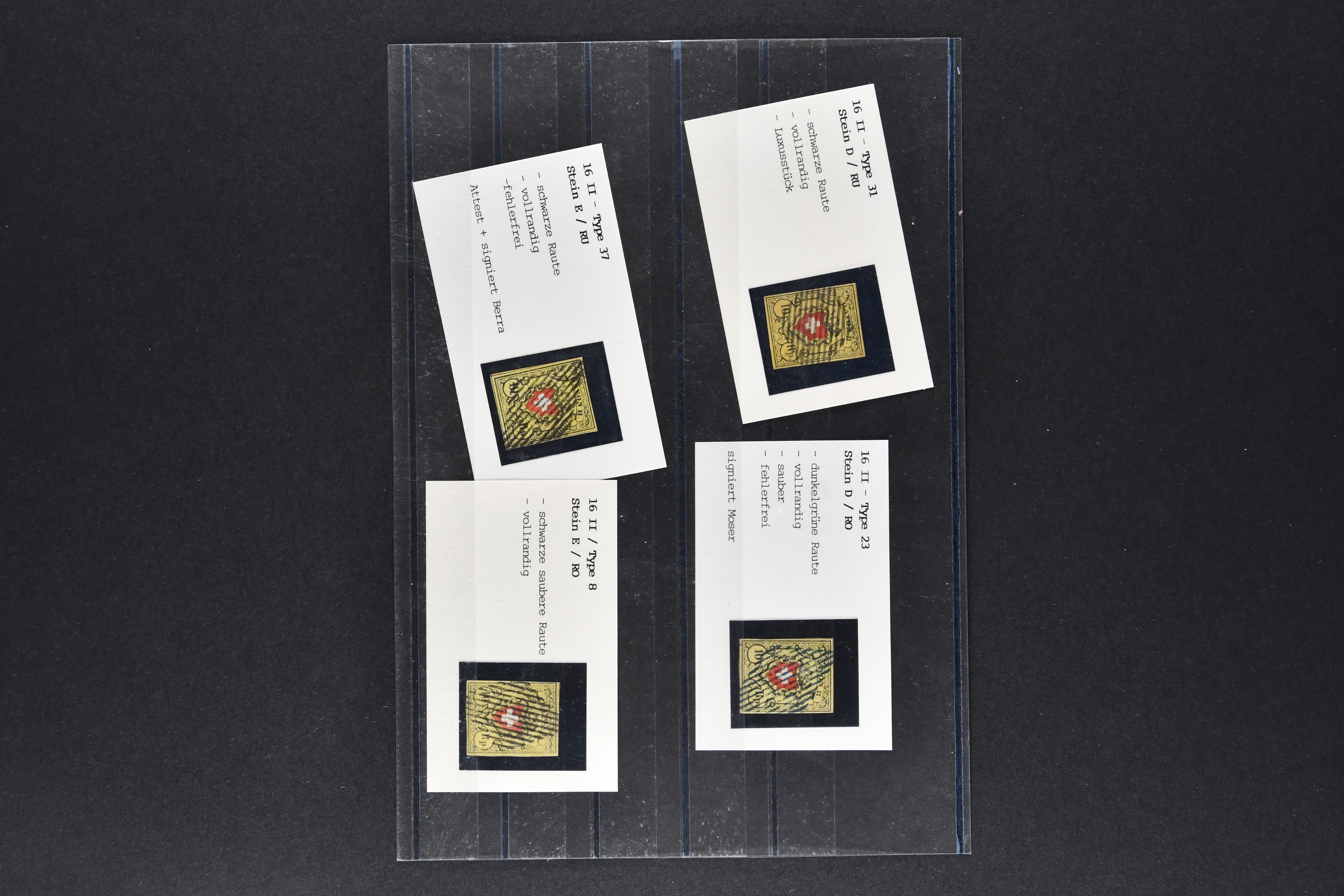 1852/54: Lot vier schöne Einzelwerte. Dabei Stein A2: Type 20 u/G, klar und kontrastreich entw. mit schwarzem "FRANCO" im Kästchen von Basel (AW 440), Stein B3: Type 9 l/o, klar, zentrisch und voll aufges. entw.