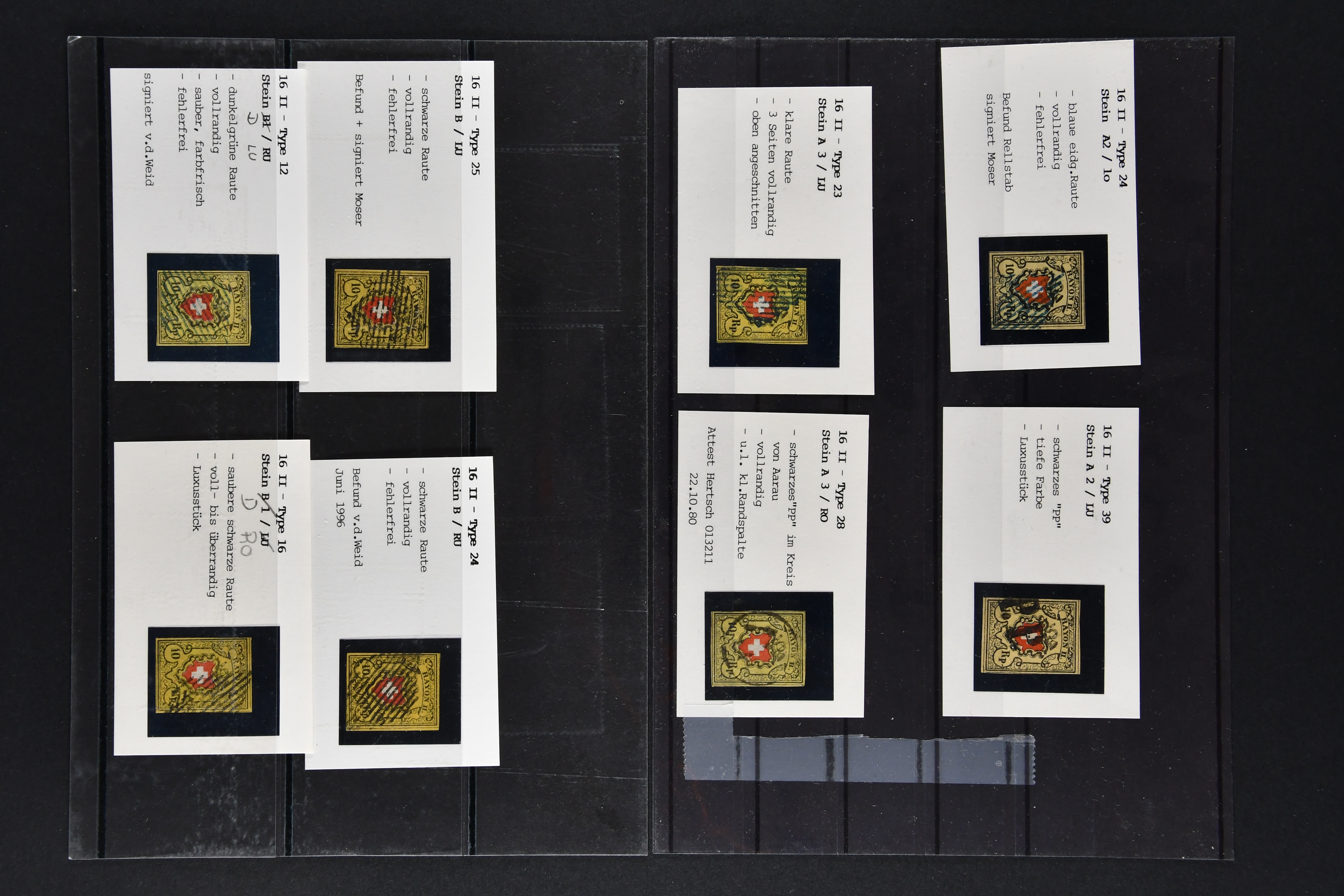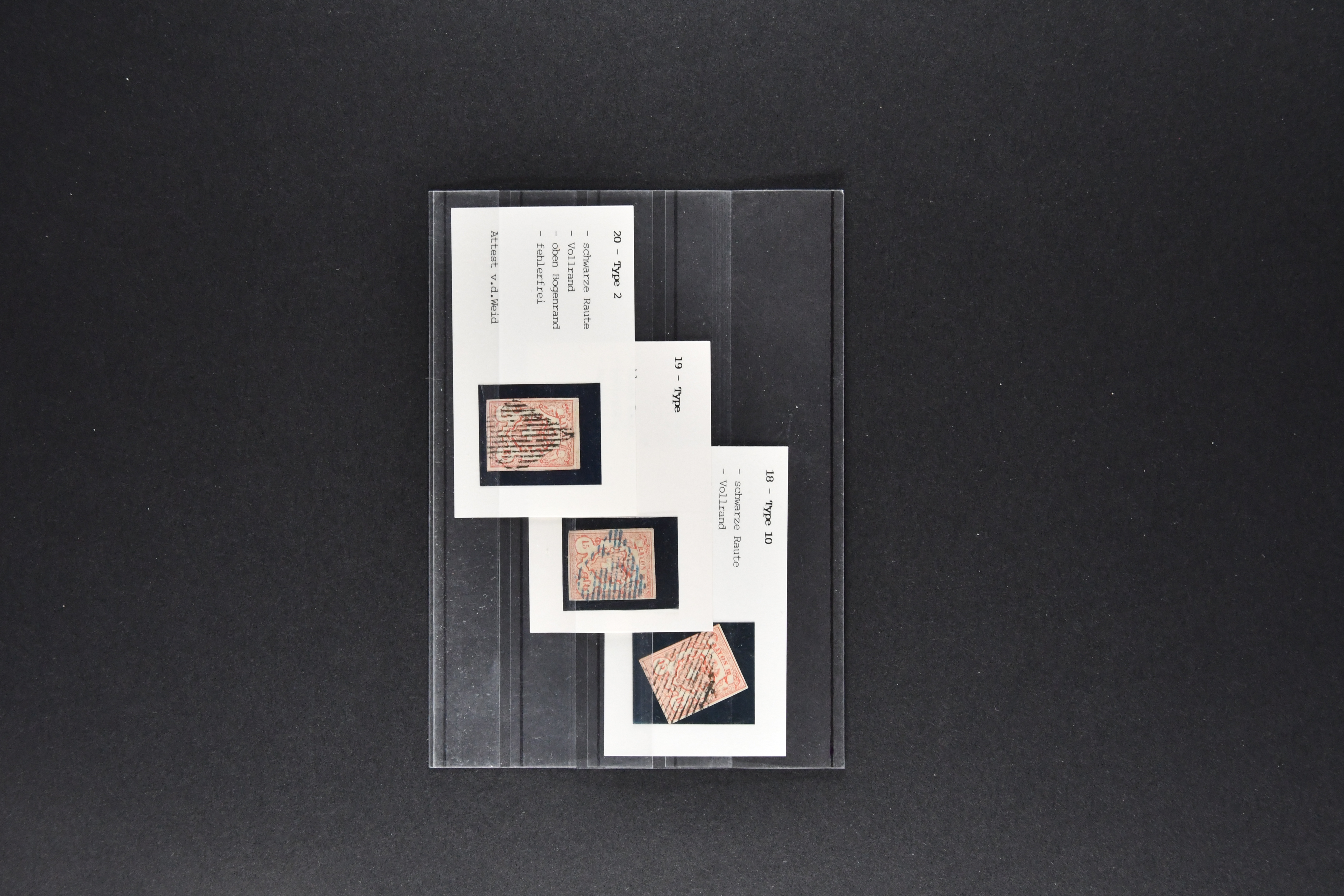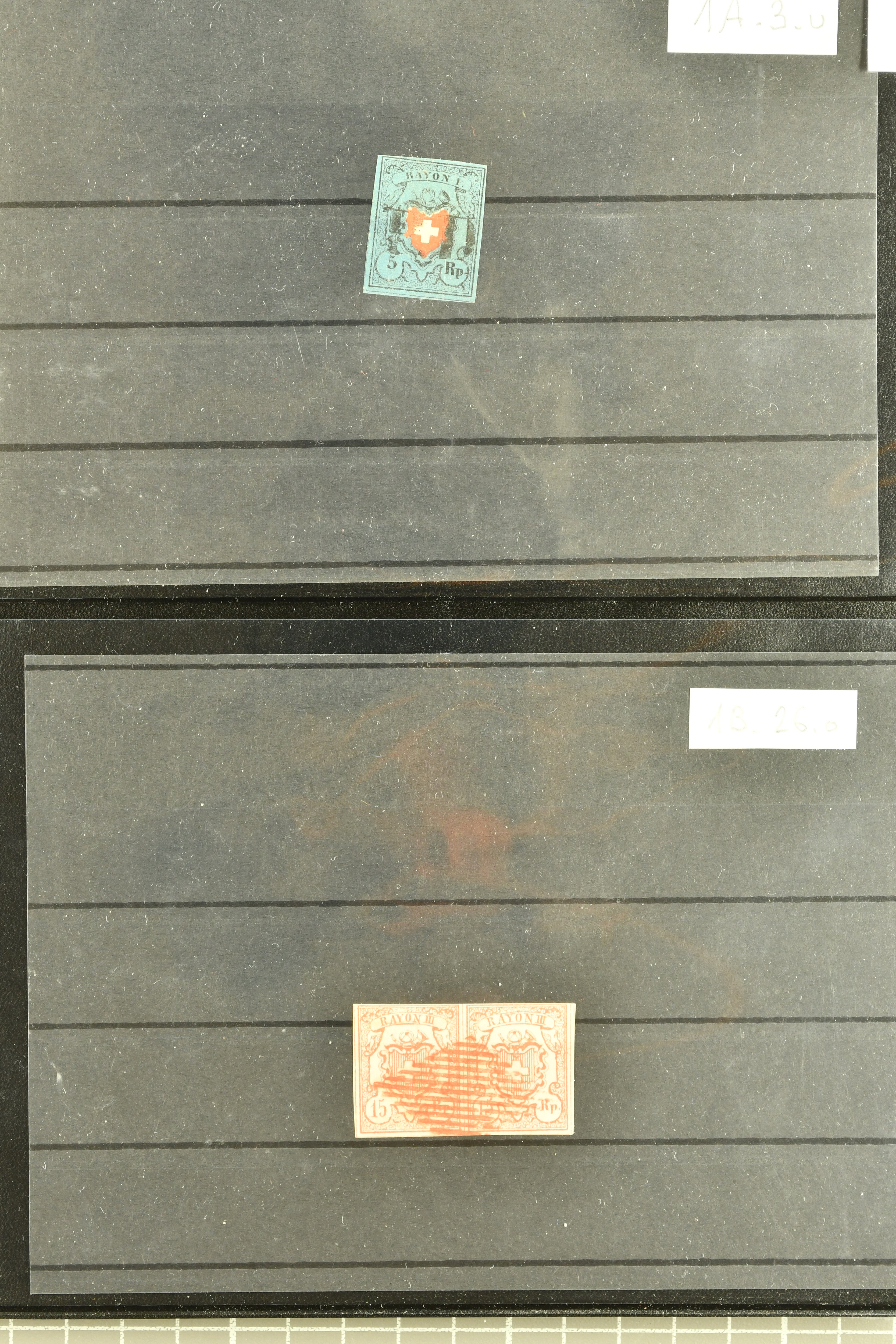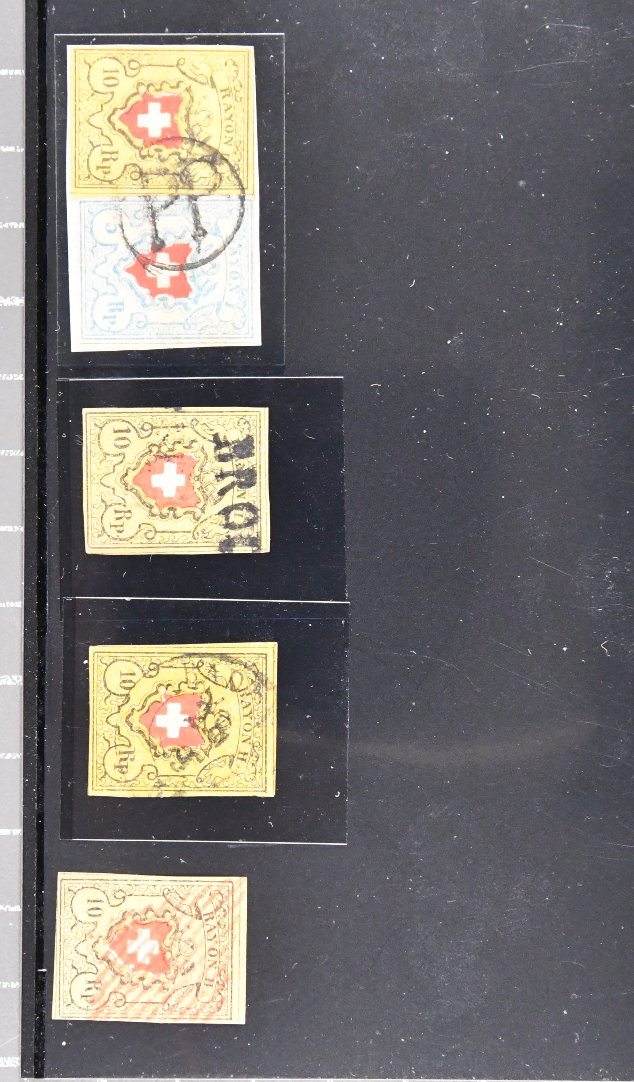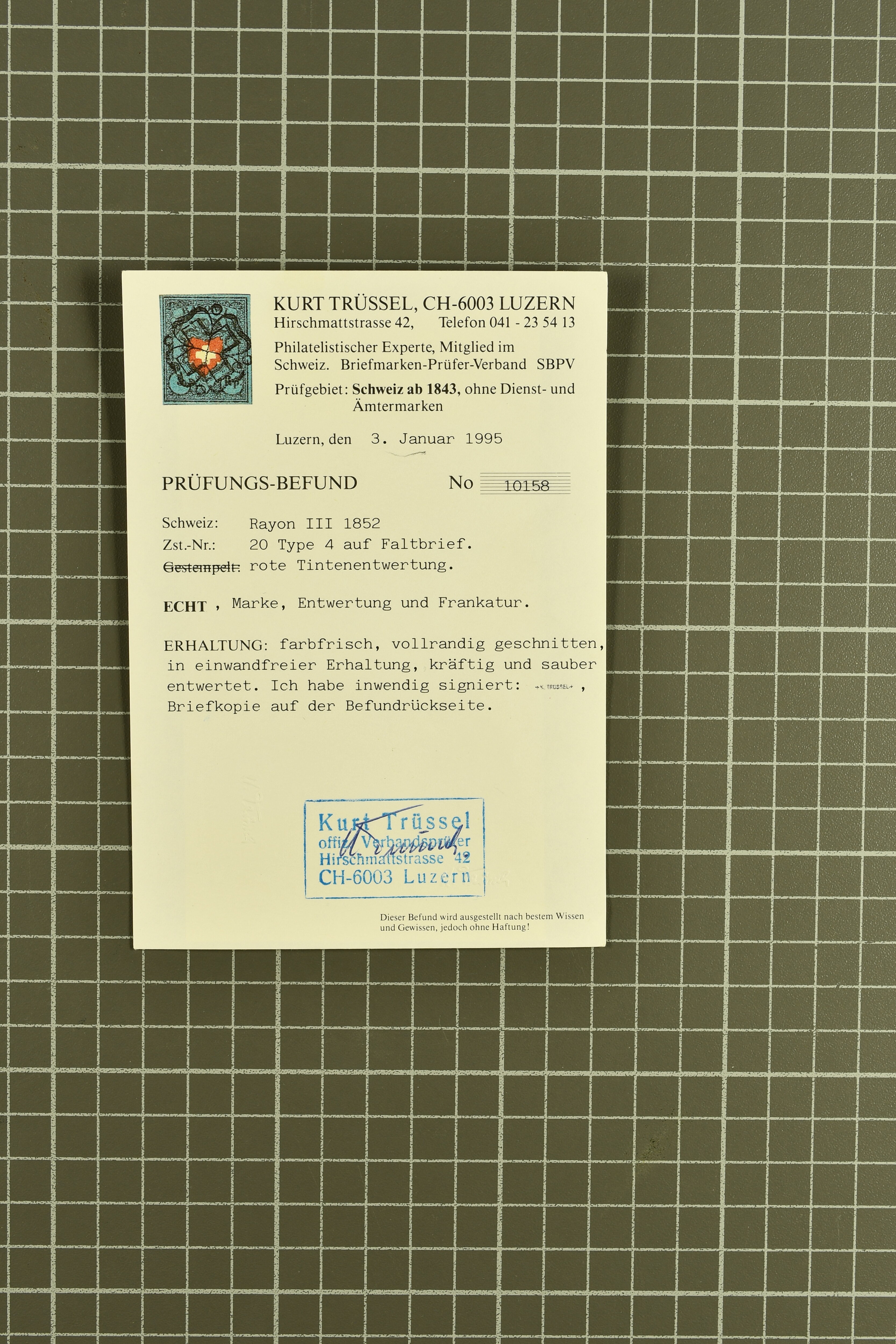 1852/54: Lot vier schöne Einzelwerte. Dabei Stein A2: Type 20 u/G, klar und kontrastreich entw. mit schwarzem "FRANCO" im Kästchen von Basel (AW 440), Stein B3: Type 9 l/o, klar, zentrisch und voll aufges. entw.