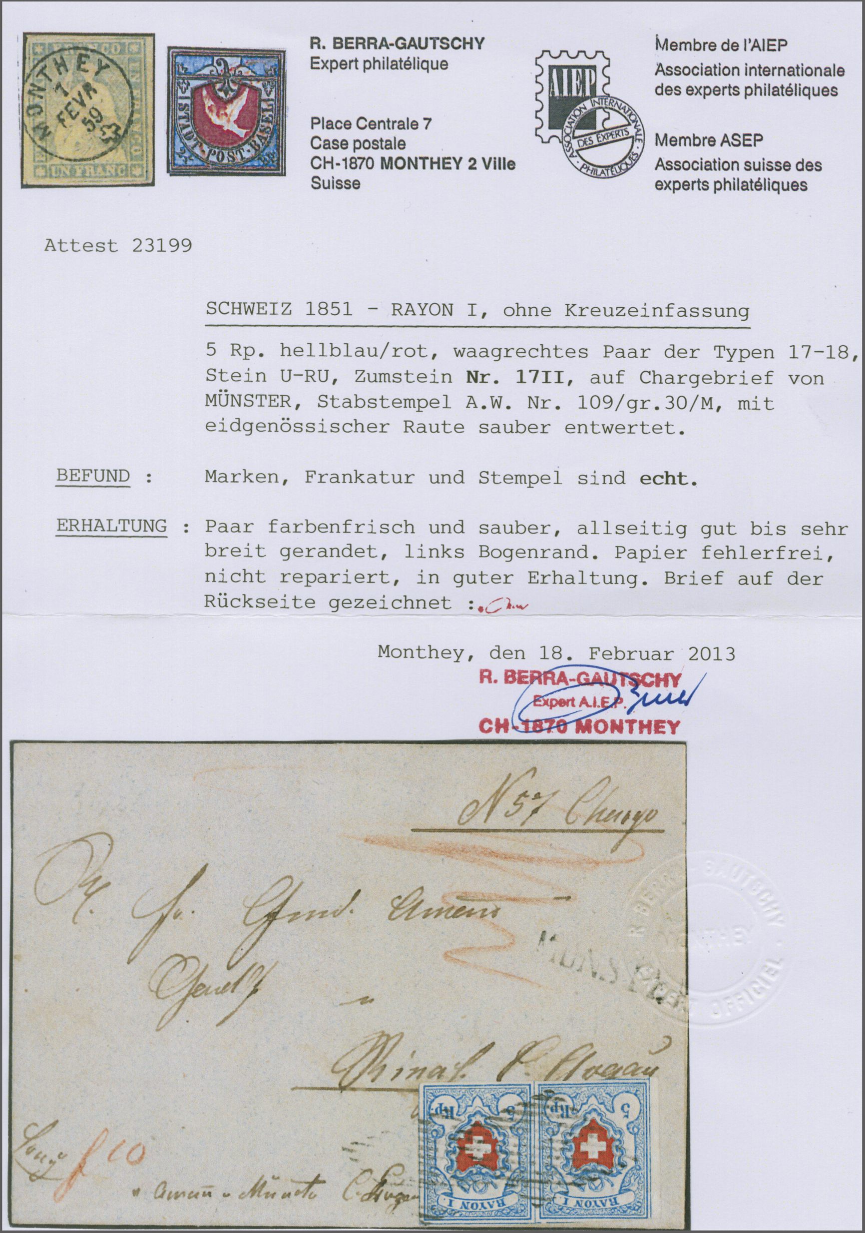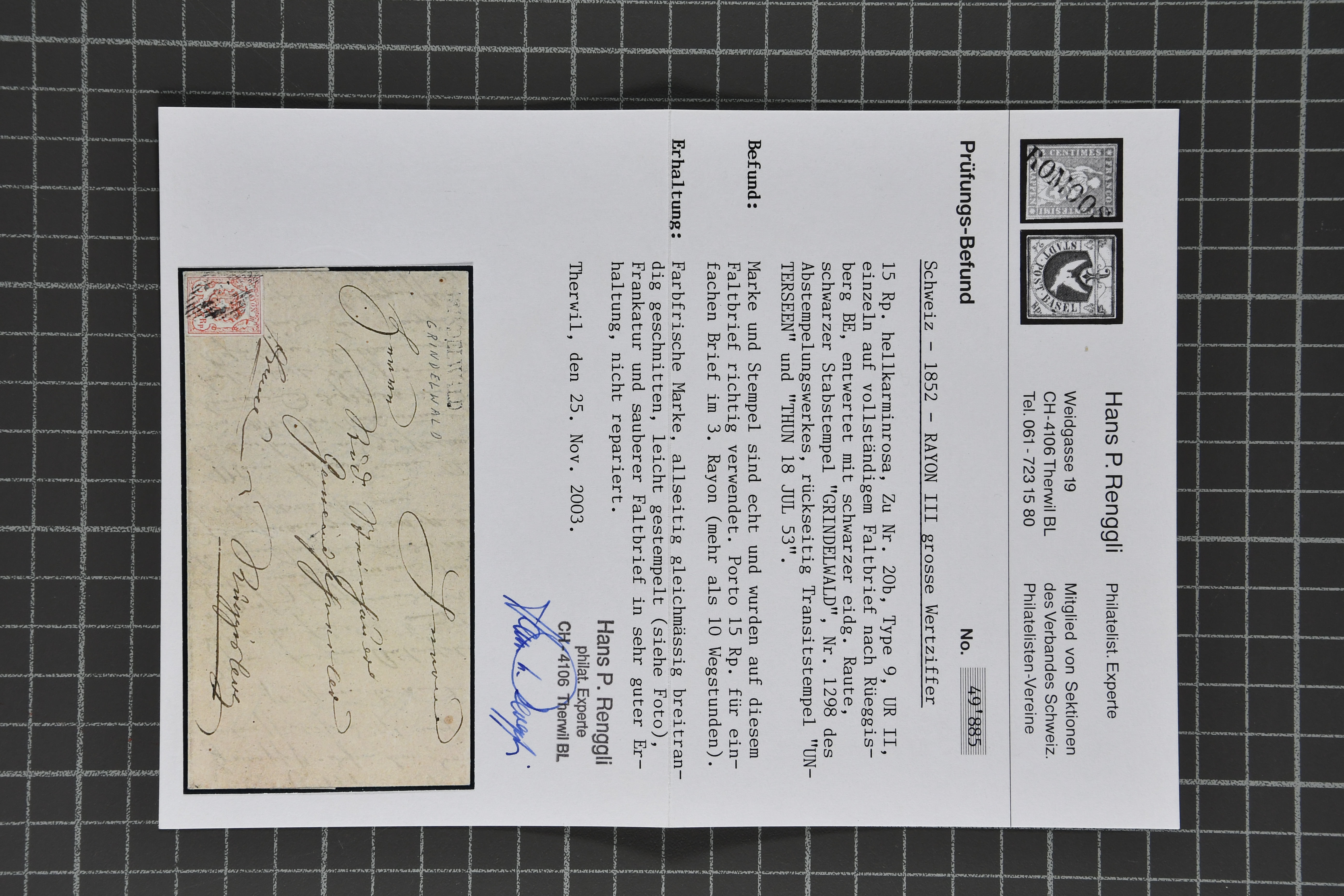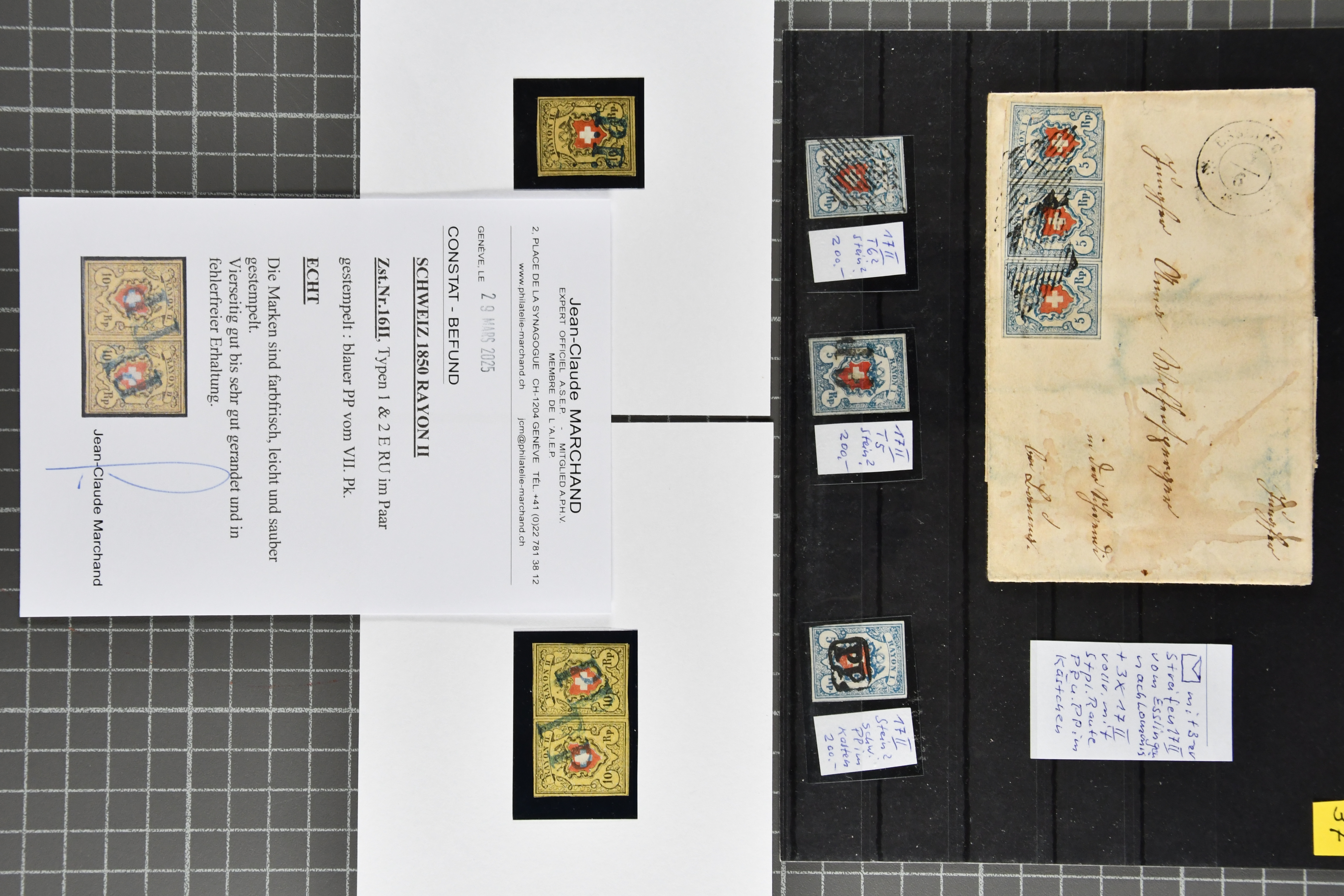 1850/54: Lot fünf Einzelmarken und ein Dreierstreifen auf Brief. Dabei Rayon II, Stein A2, Type 20 r/u breit bis überrandig mit klar kopfstehend aufgesetztem 'PP' von Solothurn (AW 240); Typen 1 u. 2 r/u im Paar