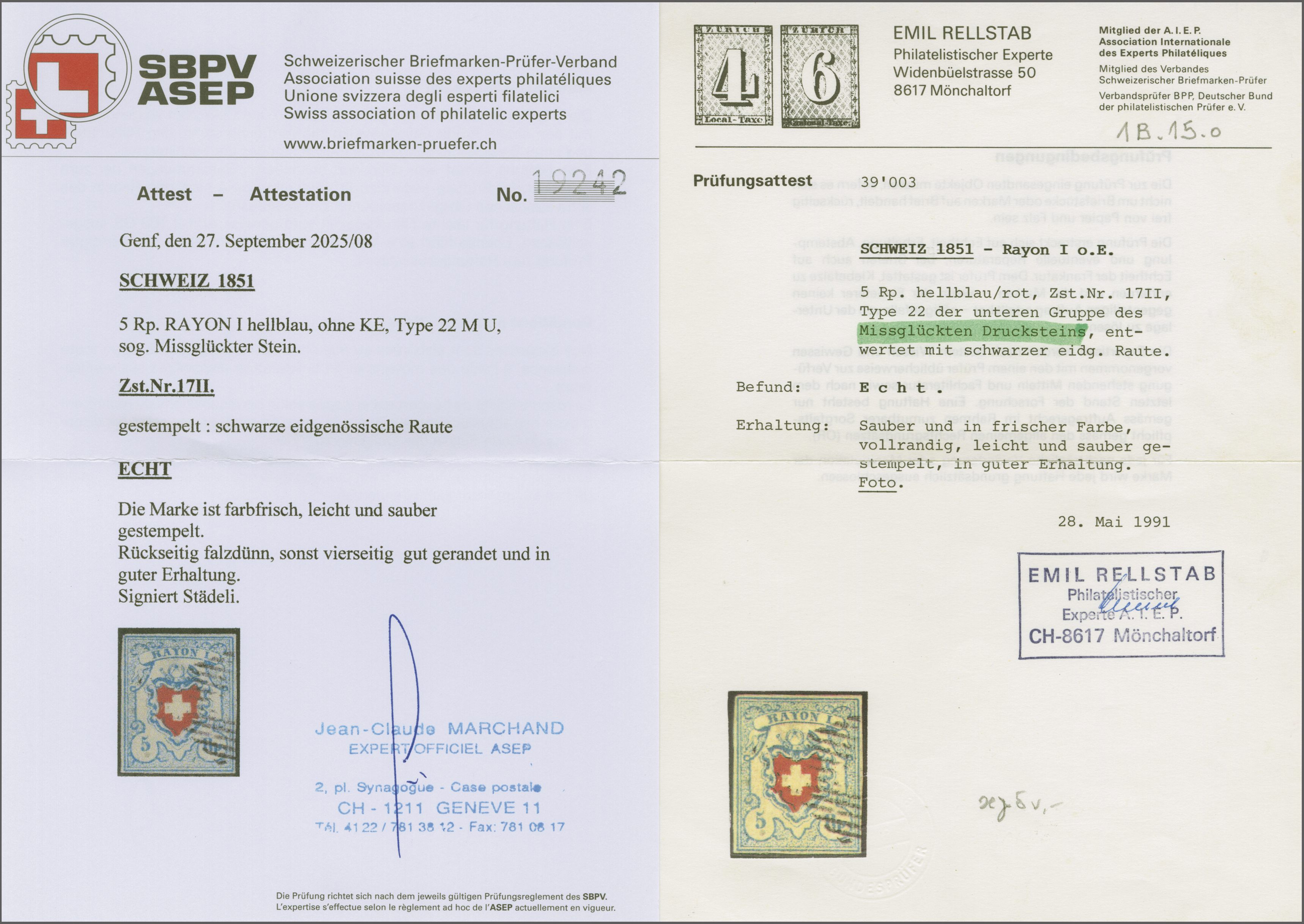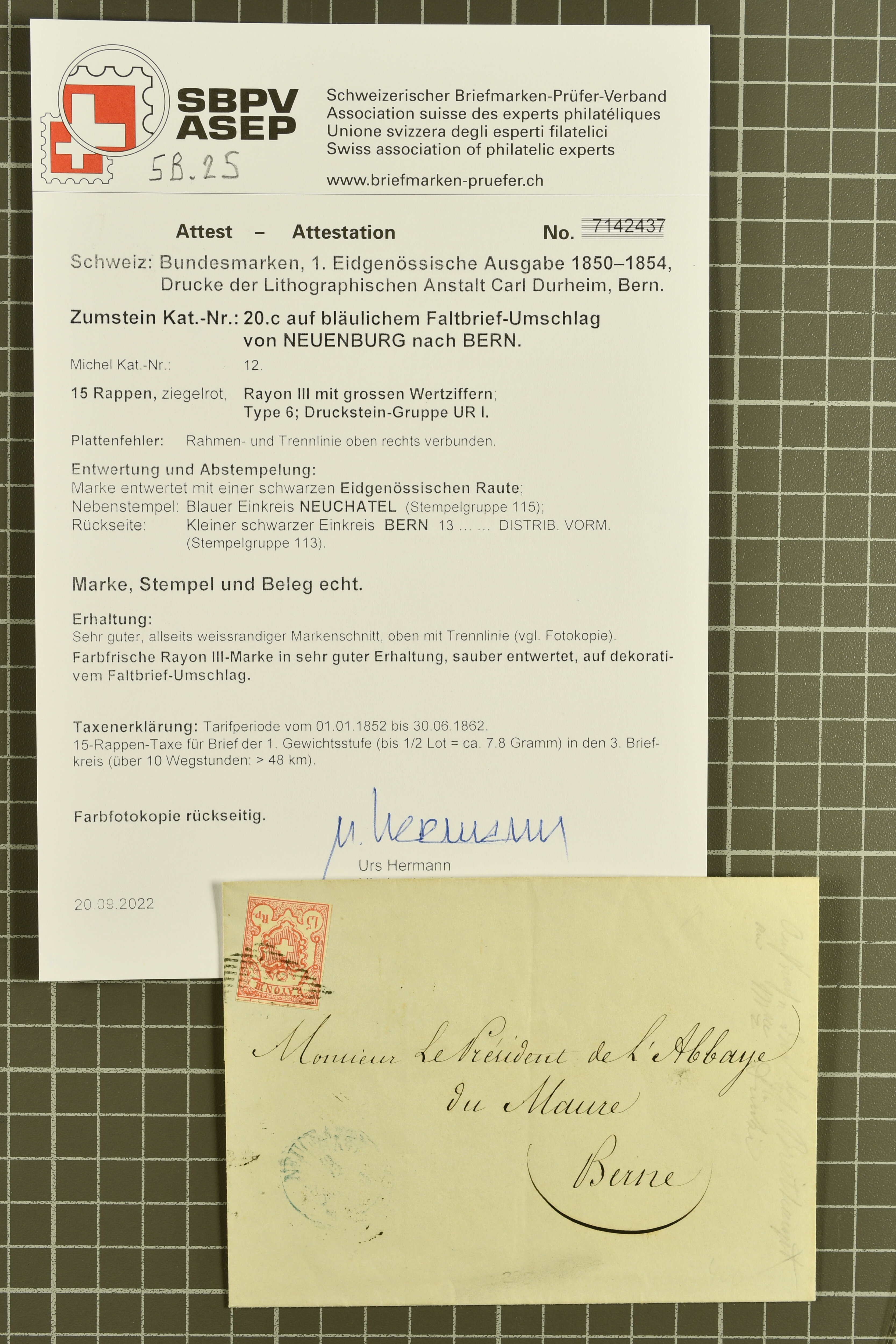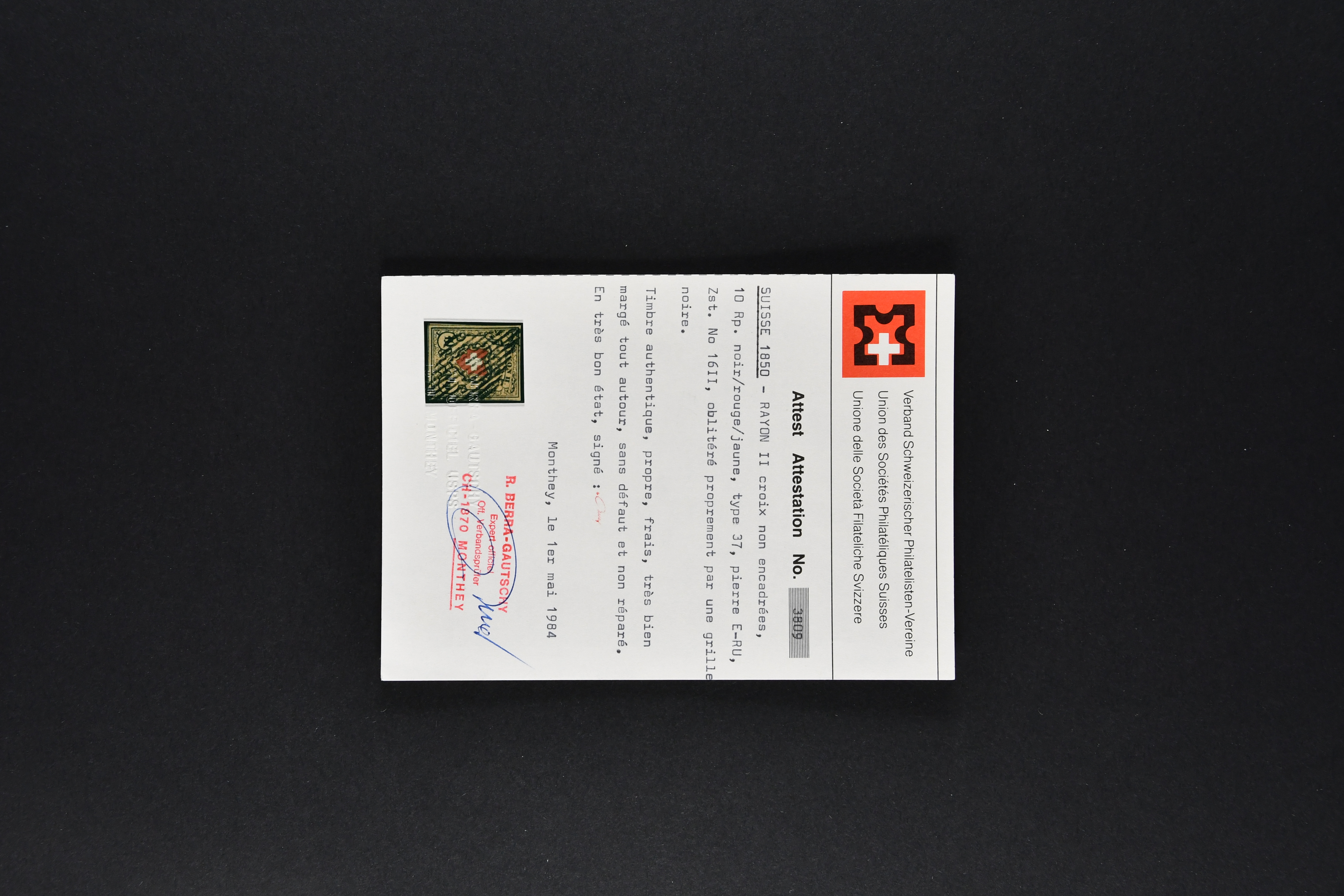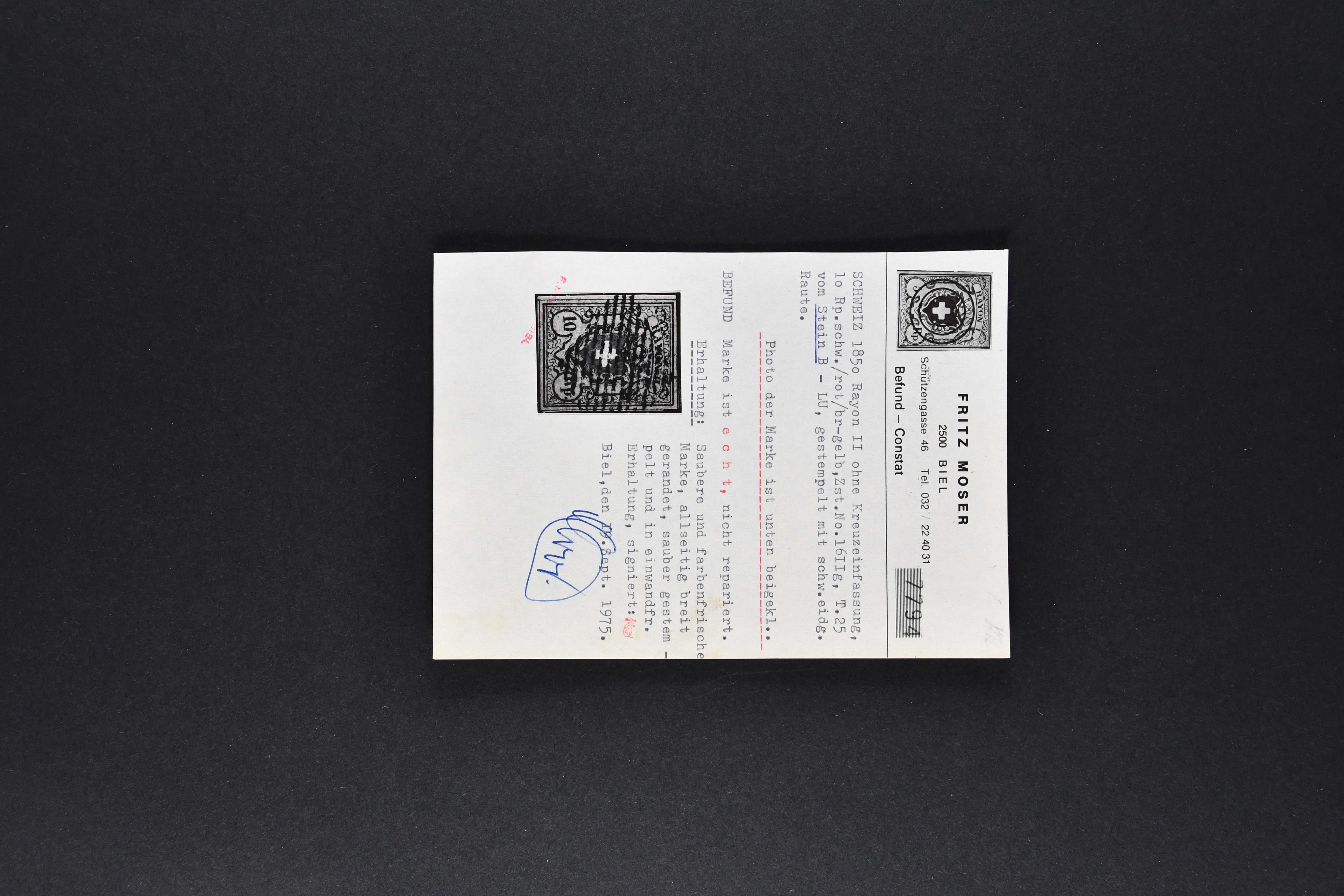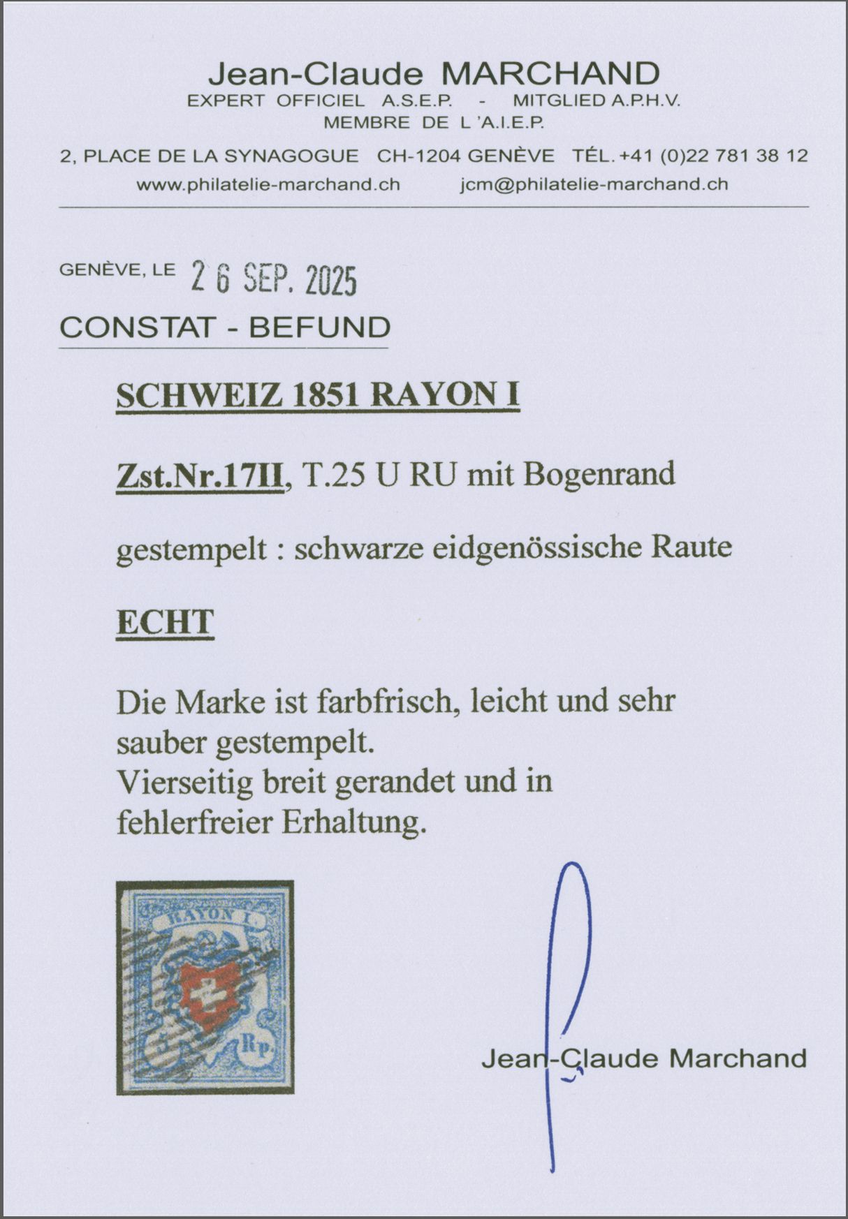 Unbekannter Stein: Type 25 r/u mit markantem Unterbruch der rechten Randlinie, farbintensiv und breit- bis überrandig mit breitem Gruppenabstand links, klar entw. mit schwarzer eidg. Raute. Befund Marchand (2025). SBK=CHF 675