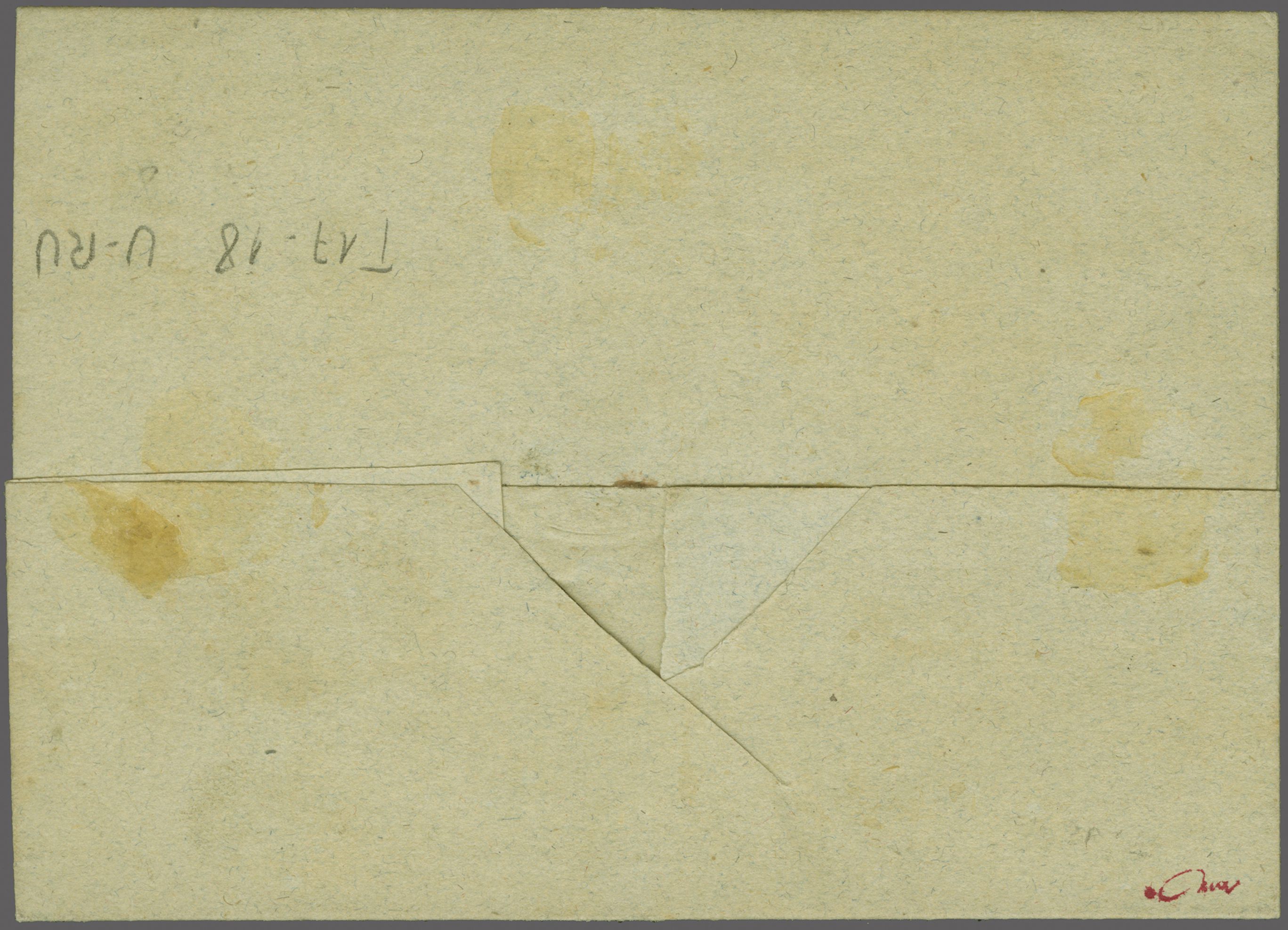 Unbekannter Stein: Type 16 l/u, farbfrisch und gut- bis überrandig mit vierseitig sichtbaren Trennlinien und Ansatz der rechten Nebenmarke, dekorativ entw. mit an passender Stelle im Wappen aufgebrachten braunen Tintenkreuz