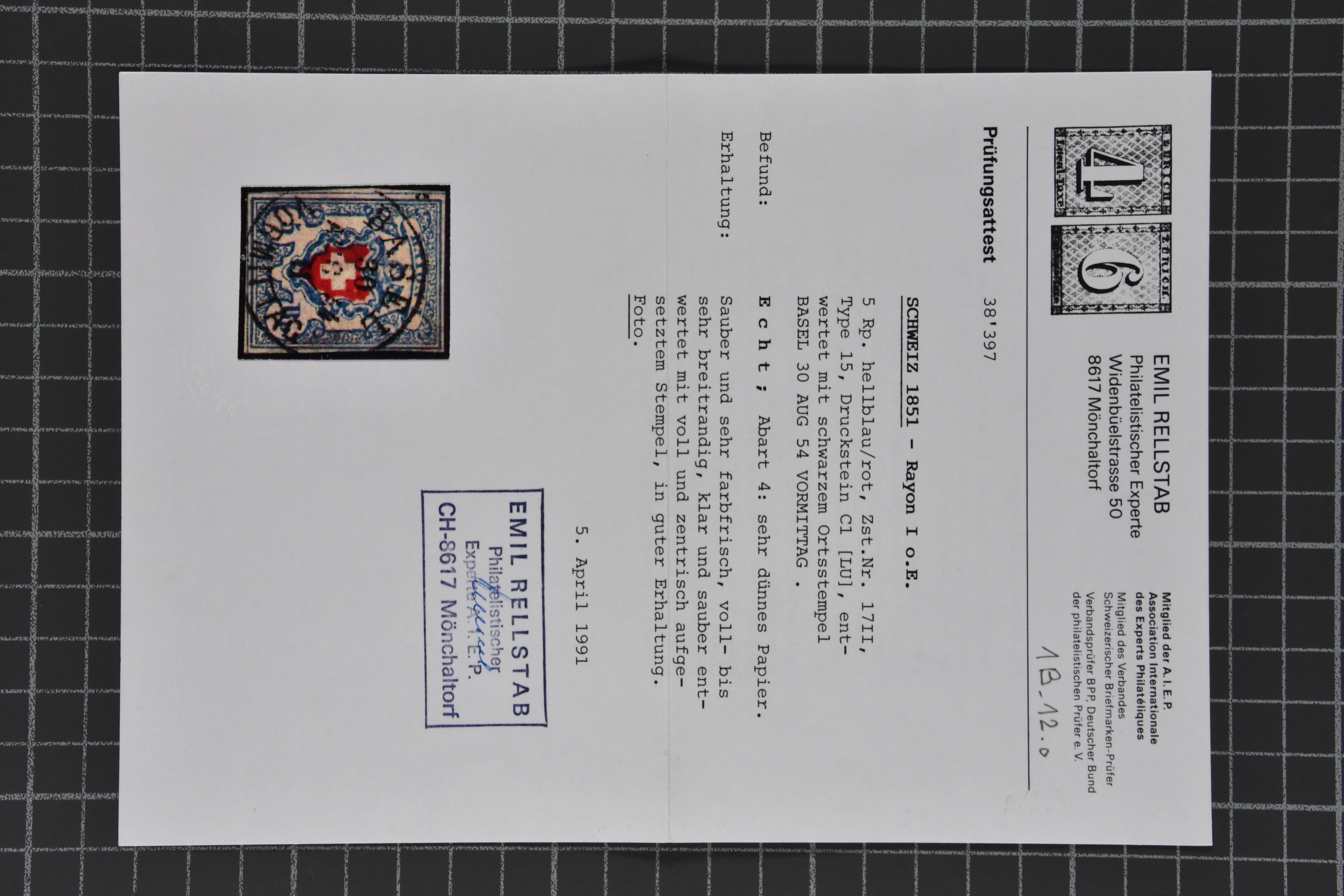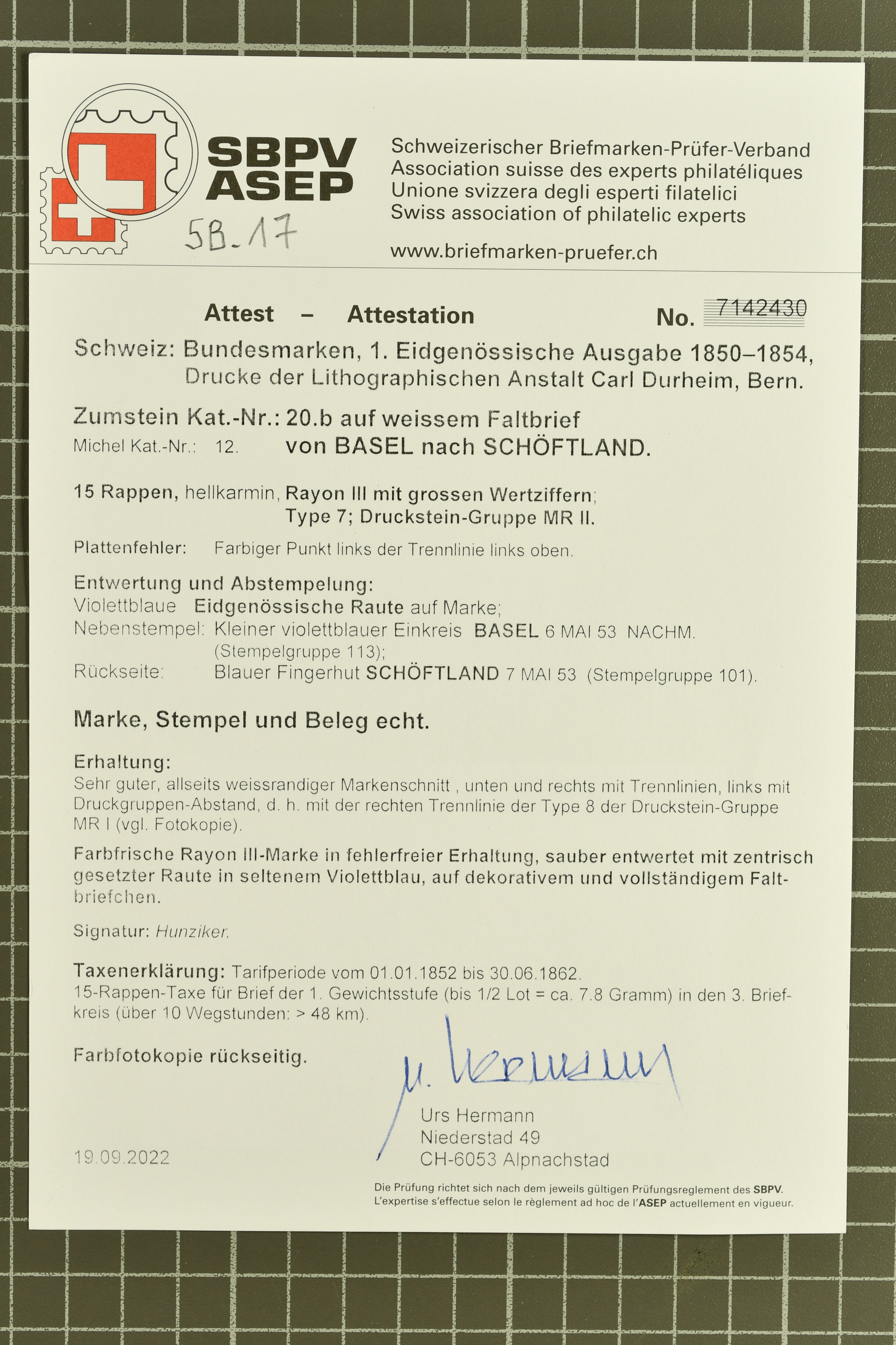 mit schwarzem "P.P." des Postkreis Zürich (AW 232) oder Stein C1: Type 15 l/u, klar und zentrisch entw. mit Elzevir-Einkreisstp. "BASEL 30 AUG 54 VORMITTAG". Gute Erhaltung; ein Befund, drei Atteste (Image 1)