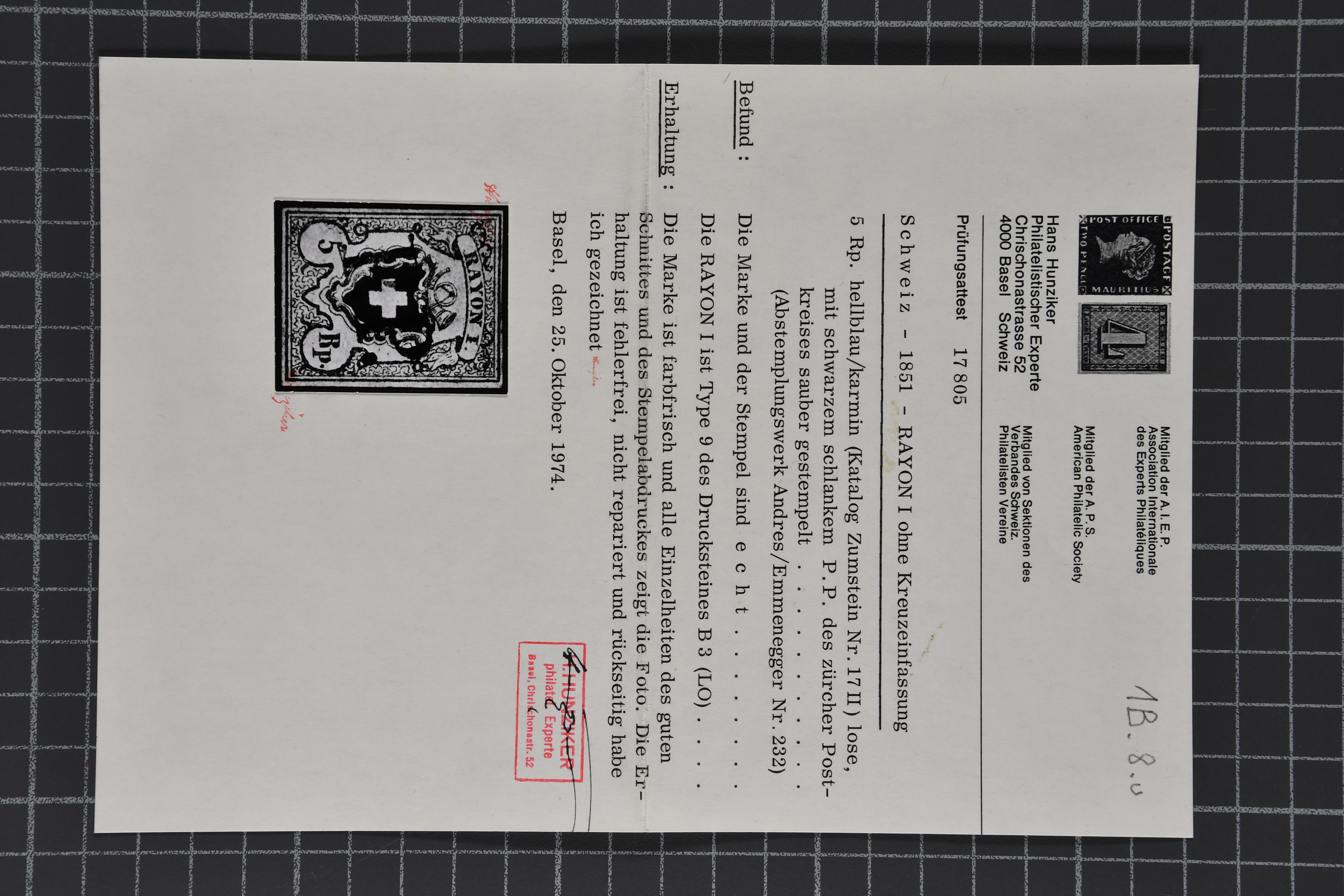 exquisite Marke in den charakteristisch zarten Farben dieses seltensten Drucksteins und in Kombination mit der eleganten Entwertung ein Schmuckstück für eine anspruchsvolle Sammlung; Atteste Hunziker (1959) und von der Weid (1996). SBK=CHF 4'000 (Image 1)
