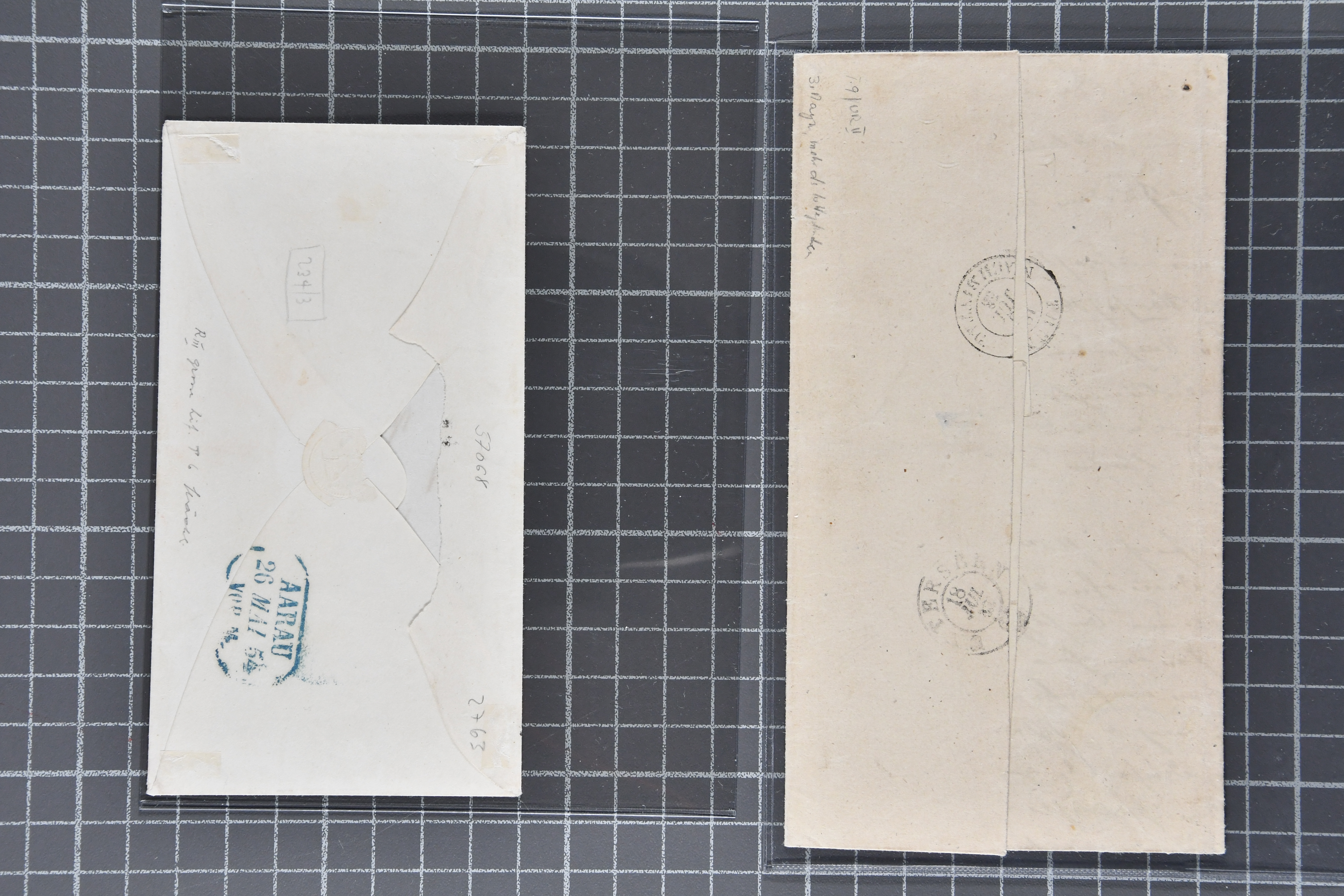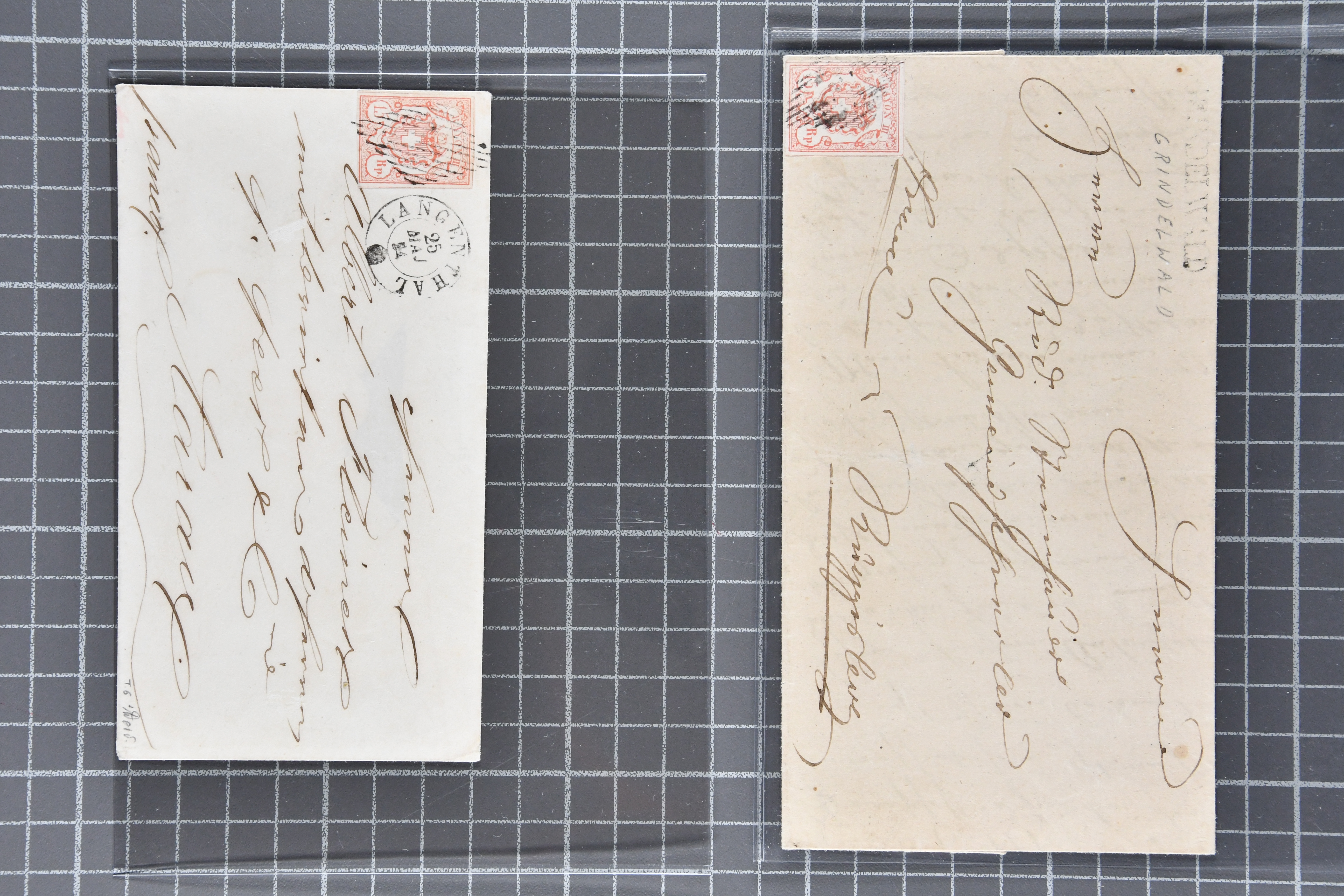 1850/54: Rayon-Partie mit drei Marken und fünf Briefen. Dabei Rayon I mit Kreuzeinfassung (SBK 15/I), Type 5, klar entw. mit schwarzem "P.D." des Postkreis Lausanne, Rayon III, Gr. Wertziffer (SBK 20), Typen 5+6