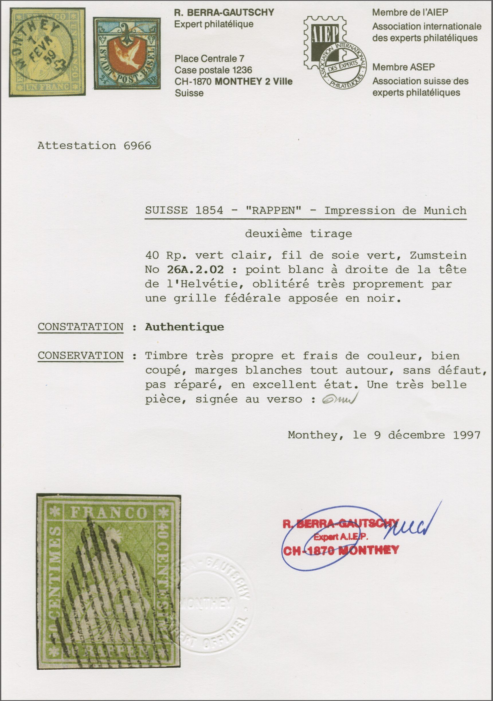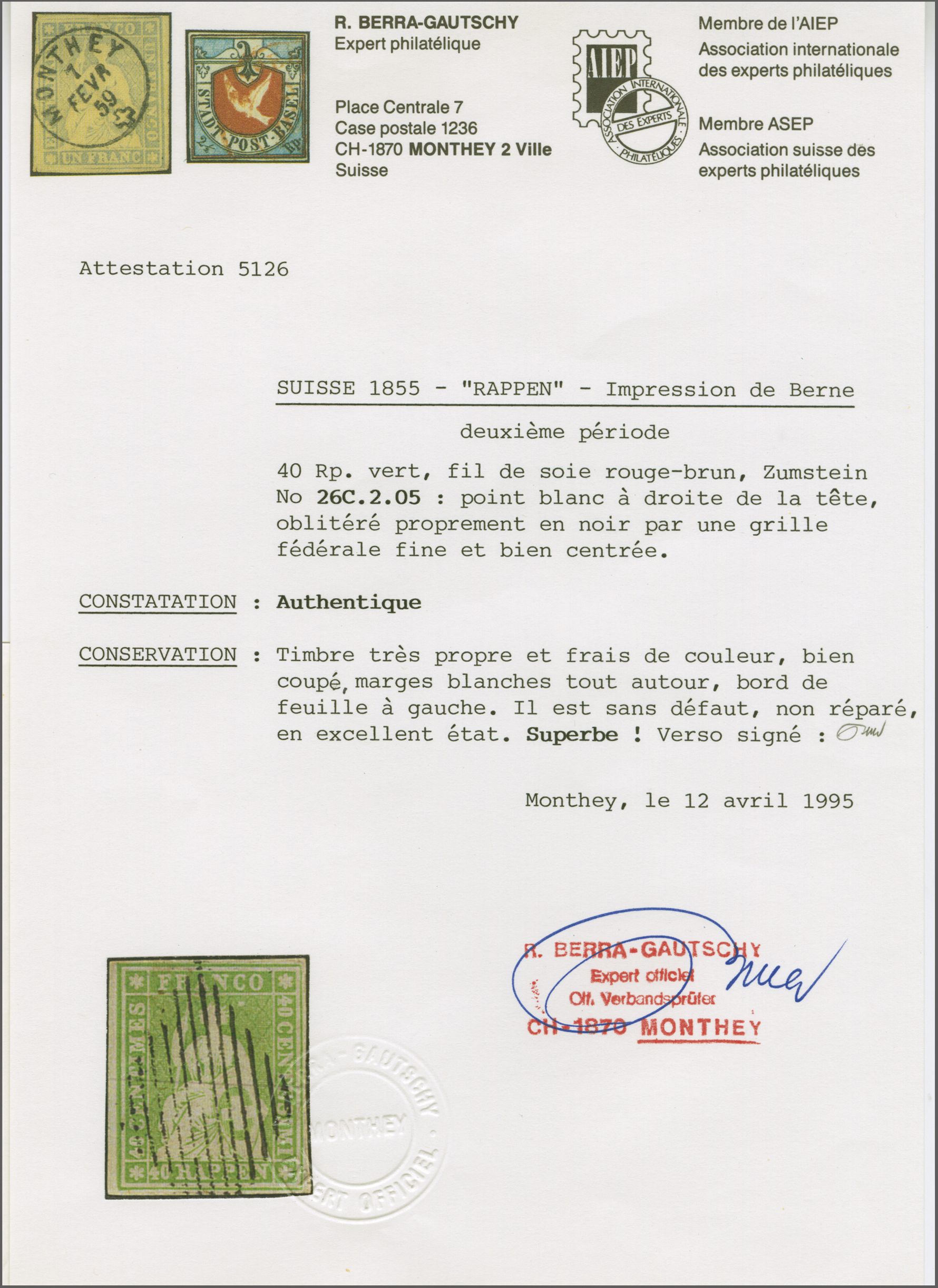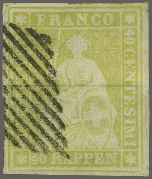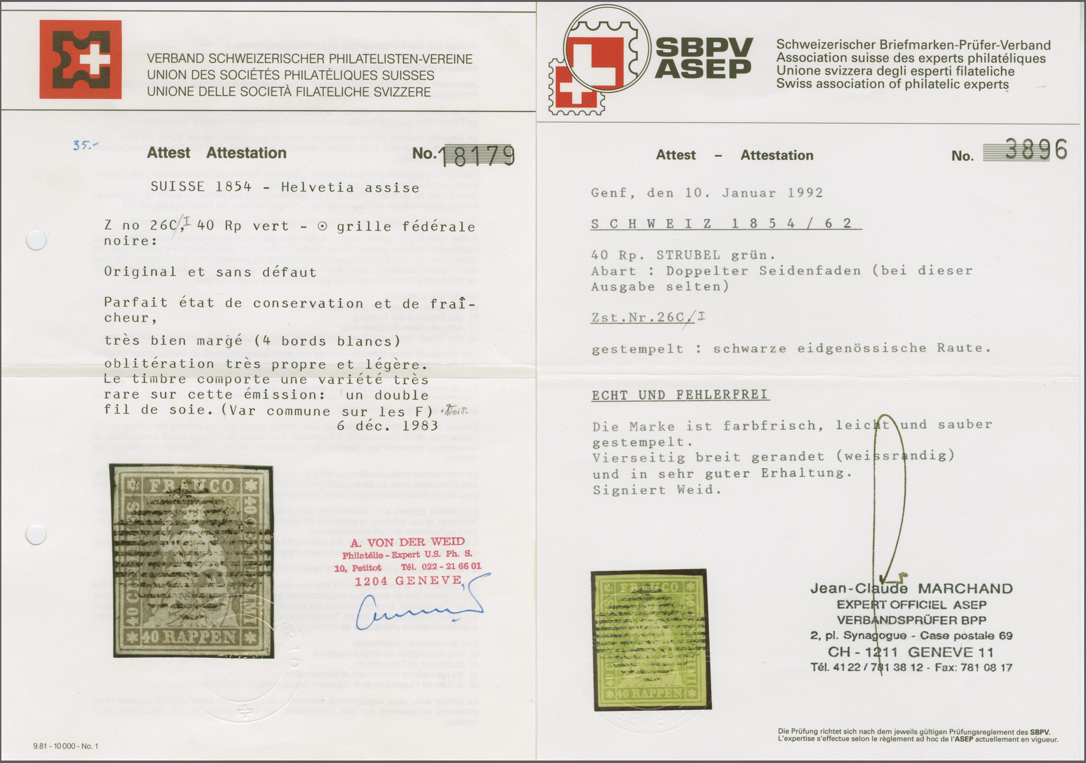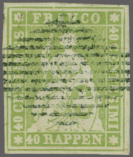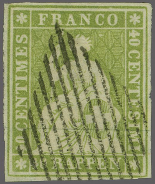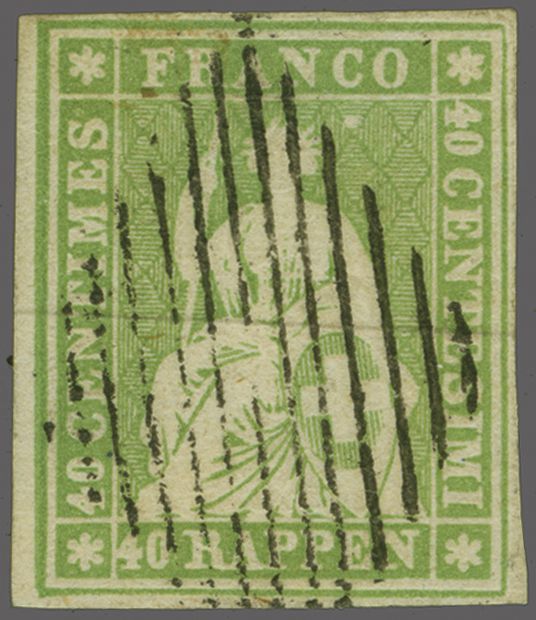 40 Rp. grünlicholiv mit seltener Abart: doppelter Seidenfaden, farbfr. und allseits breit weissrandig, zart entw. mit schwarzer eidg. Raute. Atteste von der Weid (1983), Marchand (1992). Provenienz: Corinphila-Auktion 160