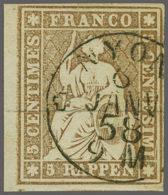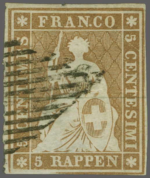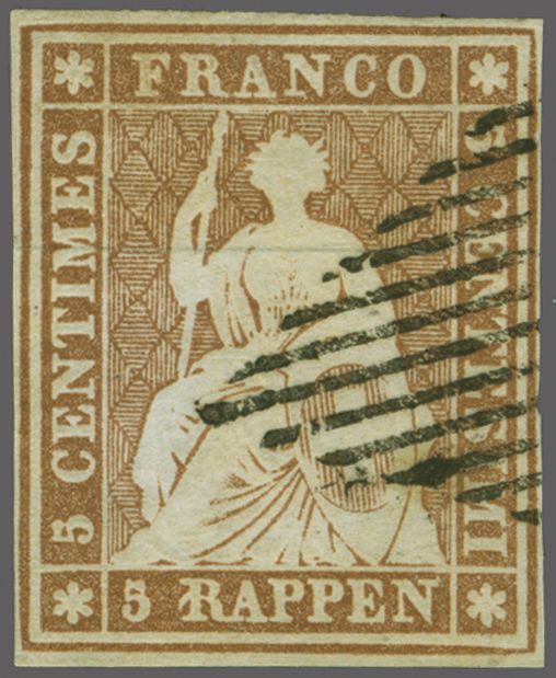 5 Rp. braun mit Plattenfehler 'Stecherzeichen' (Zu Spez 2.01), farbintensiv und allseits regelmässig weissrandig, zartklar und die Helvetia wie auch den Plattenfehler freilassend entw. mit schwarzer Raute. Ein Prachtstück,