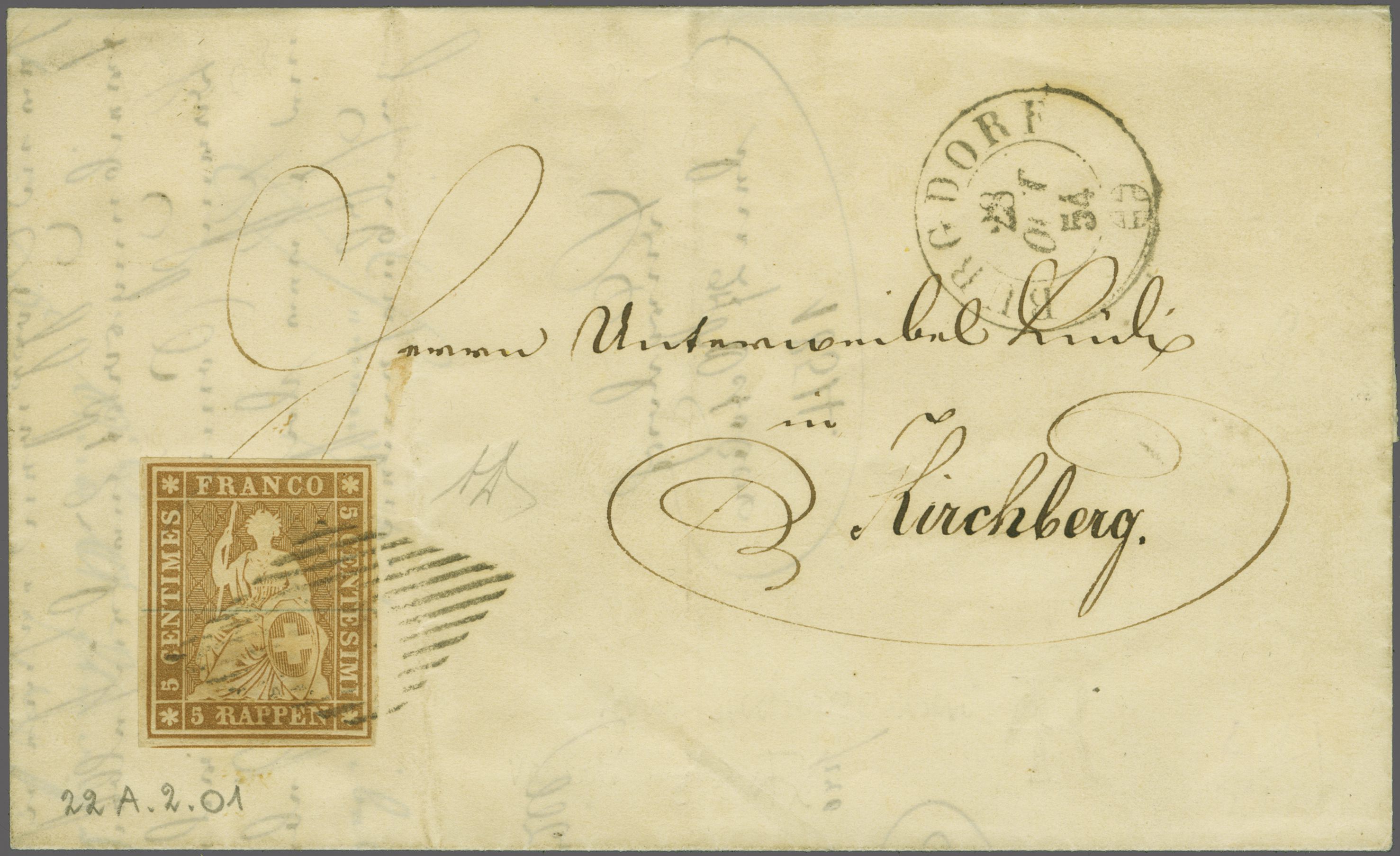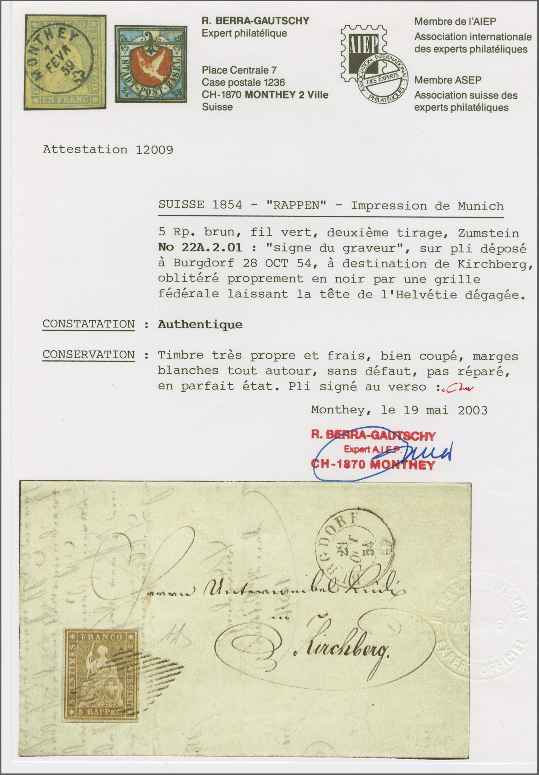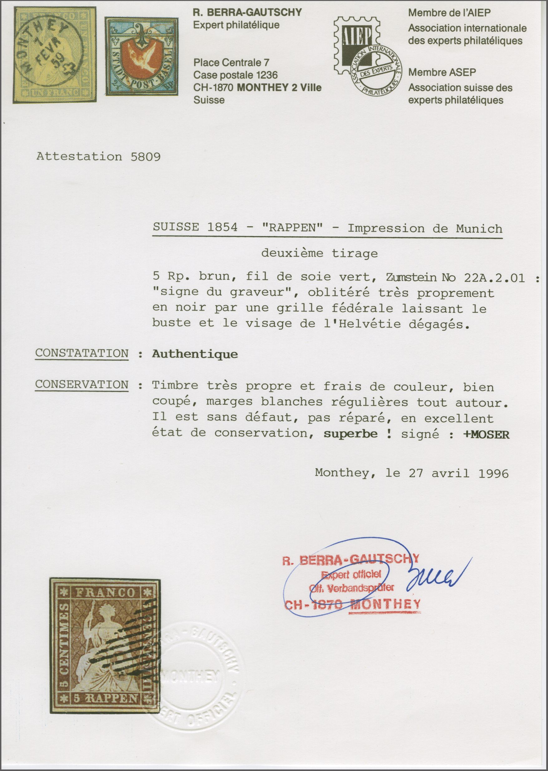 5 Rp. braun mit den Plattenfehlern 'farbloser diagonaler Strich durch das rechte Schriftband' und 'Punkt hinter N von FRANCO' (Zu Spez 2.03 / 2.06), farbfr. und voll- bis weissrandig, klar entw. mit eidg. Raute, auch die
