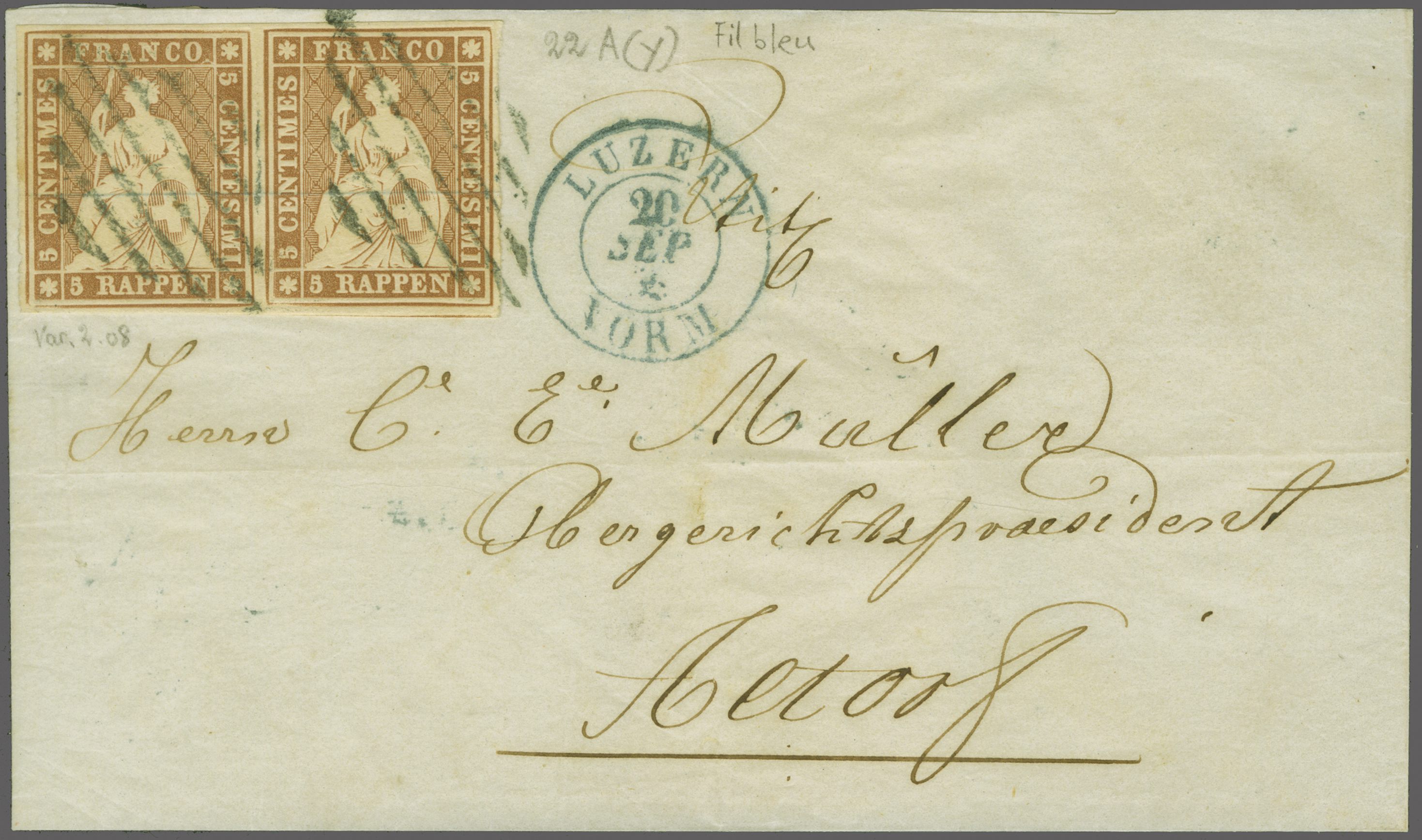 5 Rp. braun im Prachtpaar mit Abart: blauer statt grüner Seidenfaden, farbintensiv, weiss- bis überrandig mit gutem Relief, sauber entw. mit übergehender blauer Luzerner Raute (AW Nr. 43) mit nebenges. blauem "LUZERN 20 SEP ..