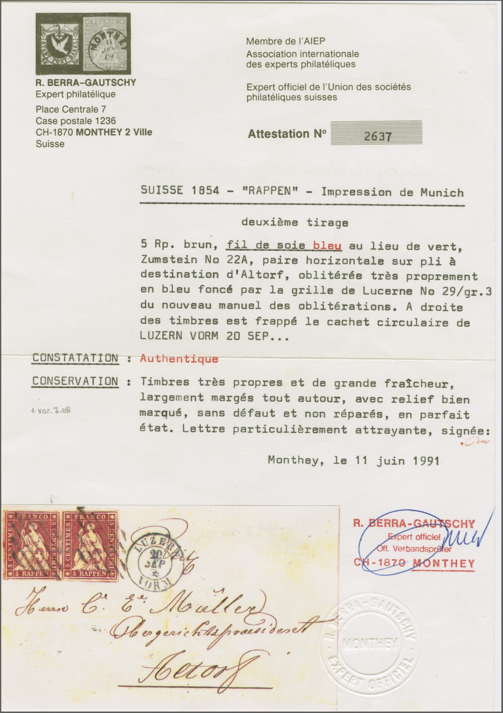 VORM." auf attraktiver Faltbriefhülle nach Altorf, rücks. Ankunftsstp. vom gleichen Tag. Das Paar zu Prüfungszwecken abgelöst und zurück gefalzt, Attest Berra-Gautschy (1991) SBK / Zu Spez = CHF 800 + 200. Provenienz: Corinphila Auktion 195 (November
