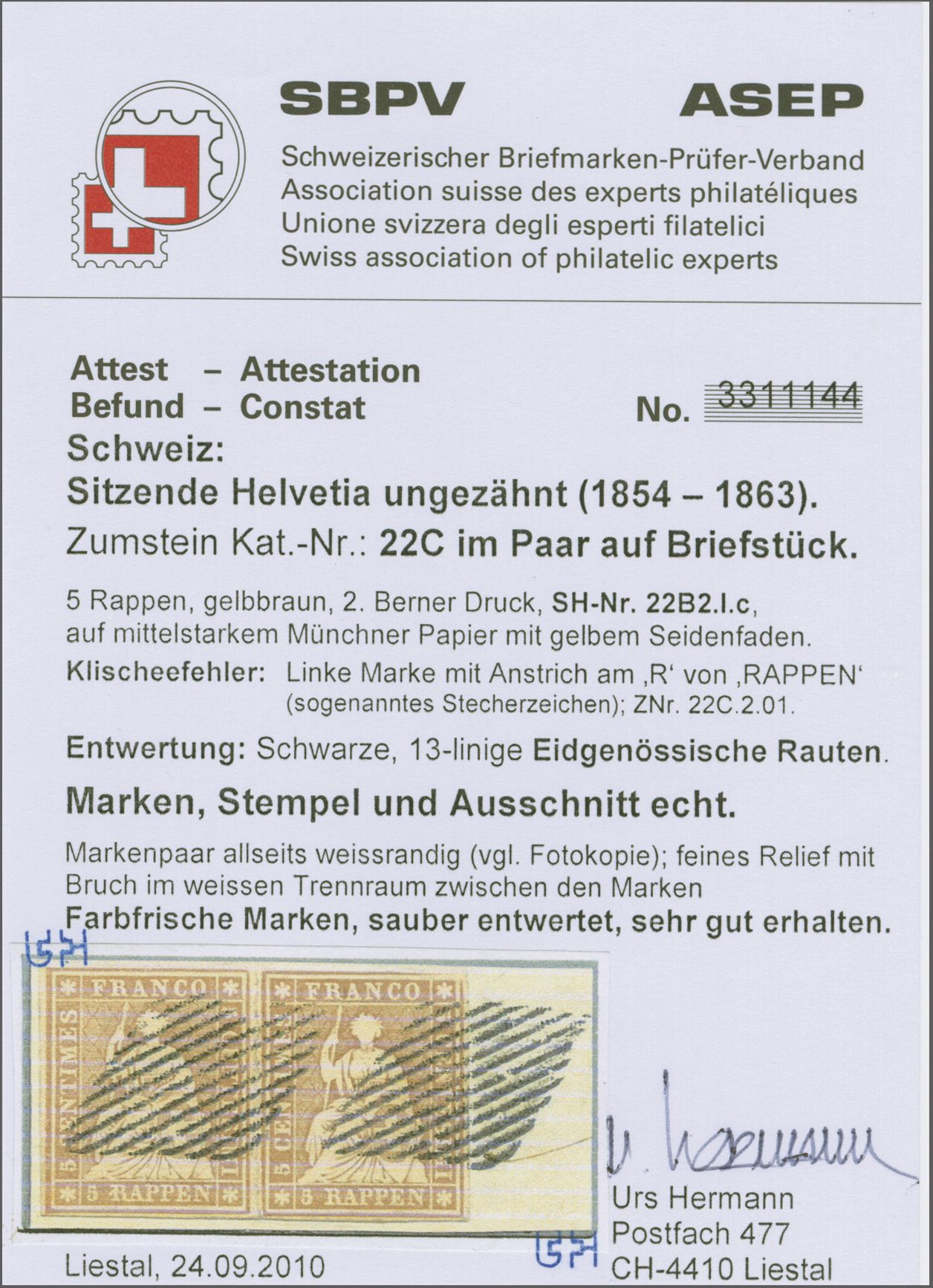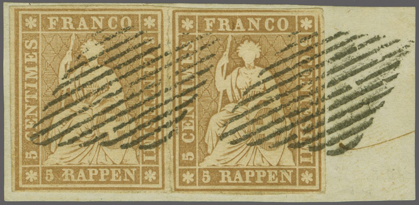 5 Rp. braun im waagrechten Paar, die linke Marke mit Plattenfehler 'Stecherzeichen' (Zu Spez 2.01), farbfr. und allseits regelmässig weissrandige Einheit, je zartklar, übergehend und den Plattenfehler freilassend entw. mit