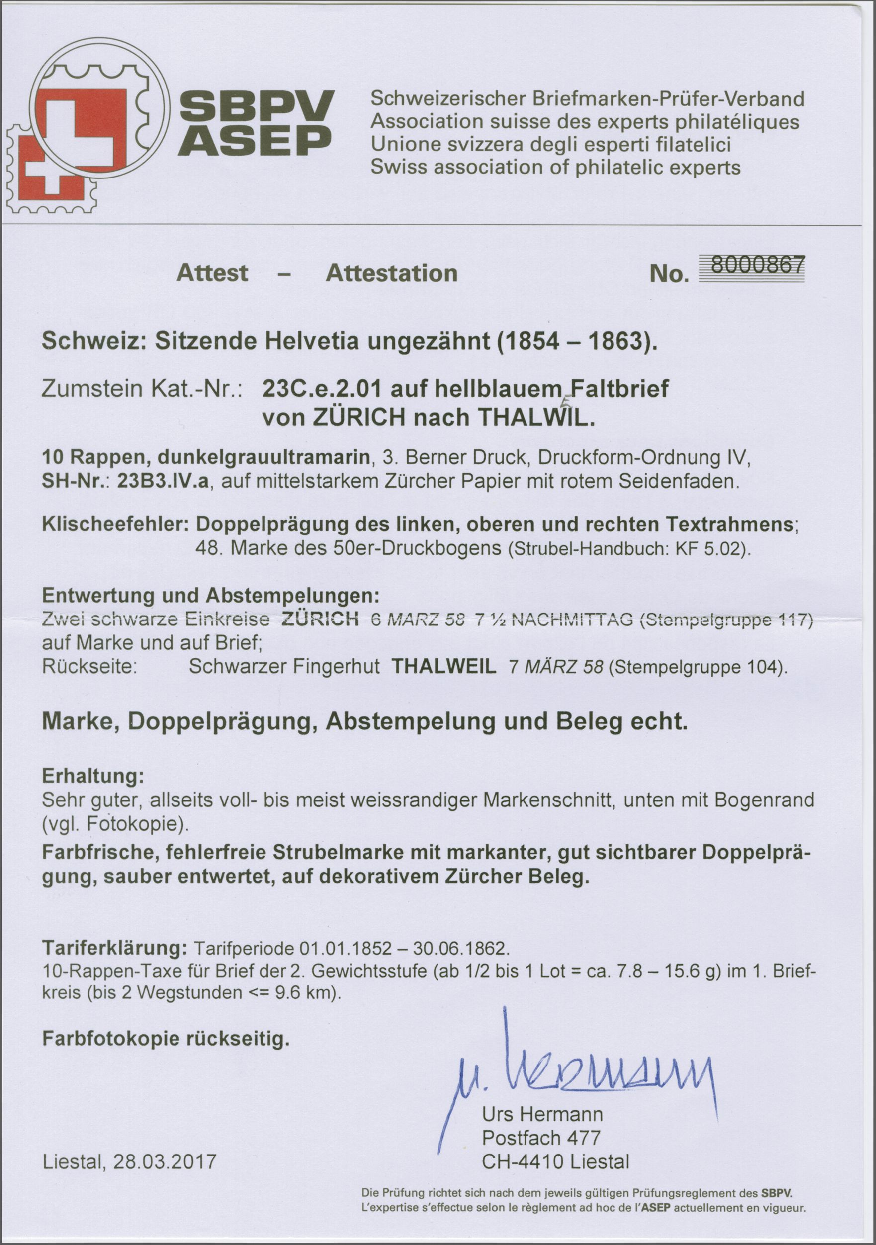 Faltbrief nach Thalwyl, rücks mit Ankunftsstp. THALWEIL vom Folgetag. Attest Hermann (2017) Zu Spez 23C.2.01 = CHF 100+600 / SBK = CHF 900 (Image 1)